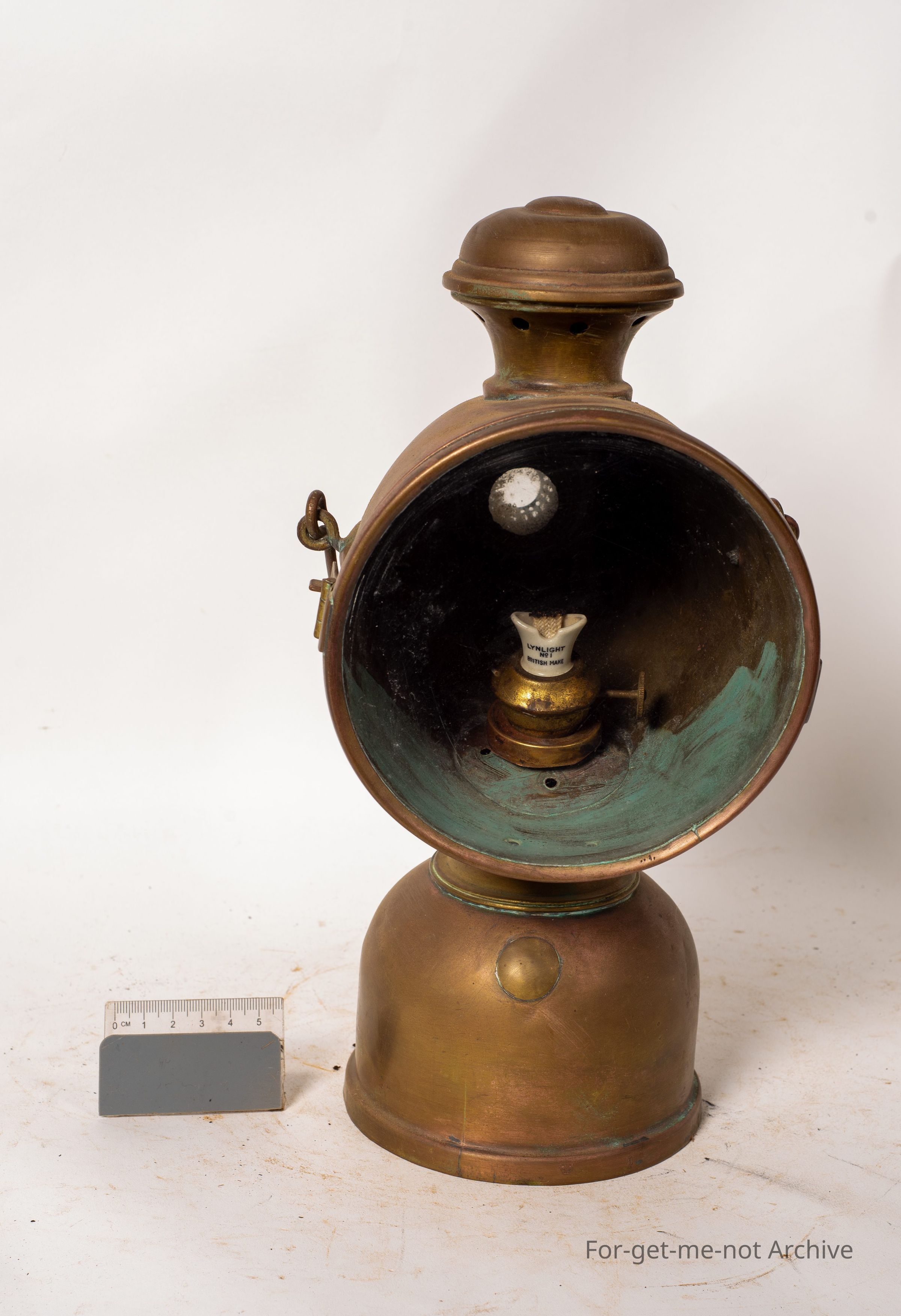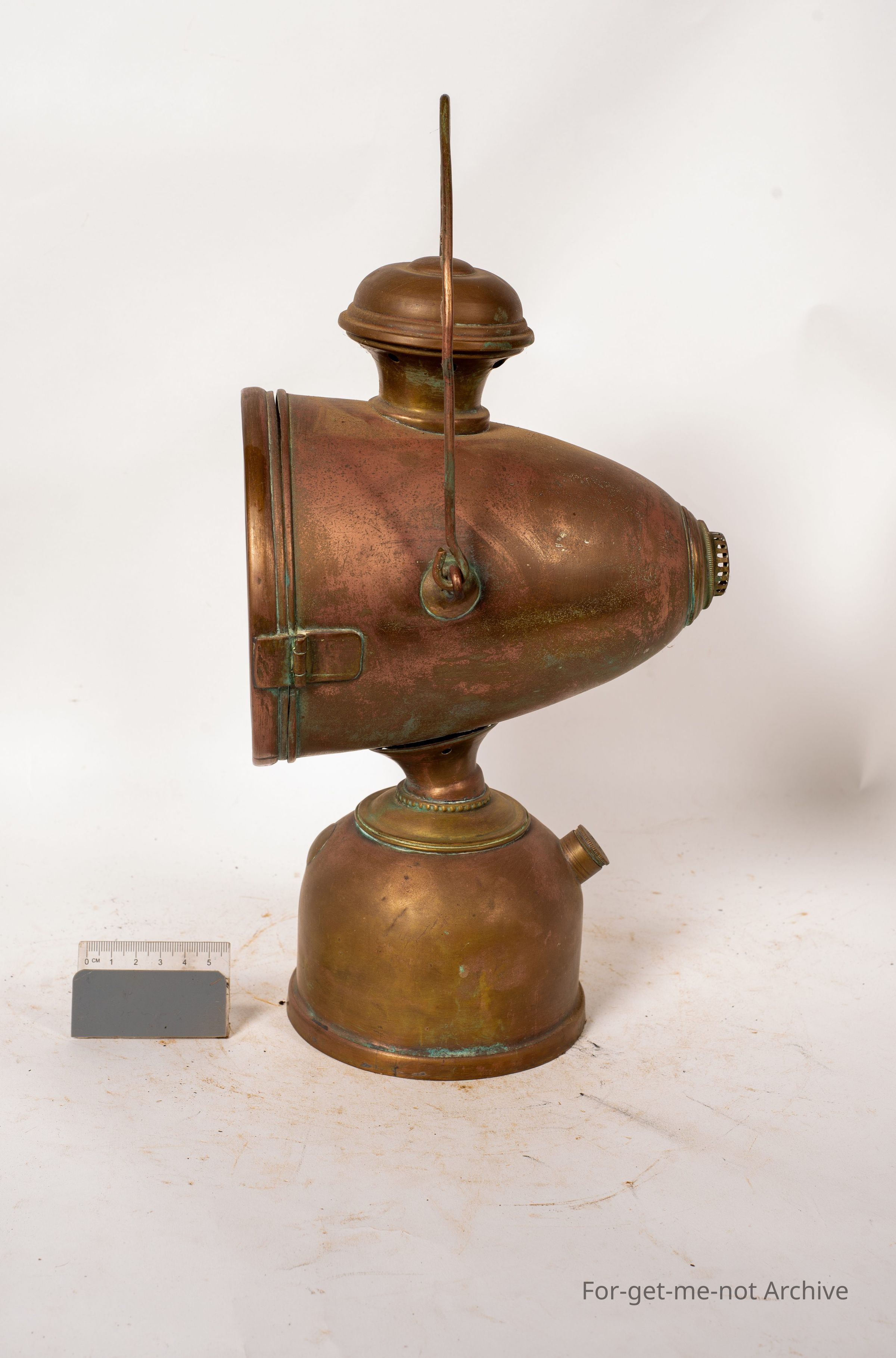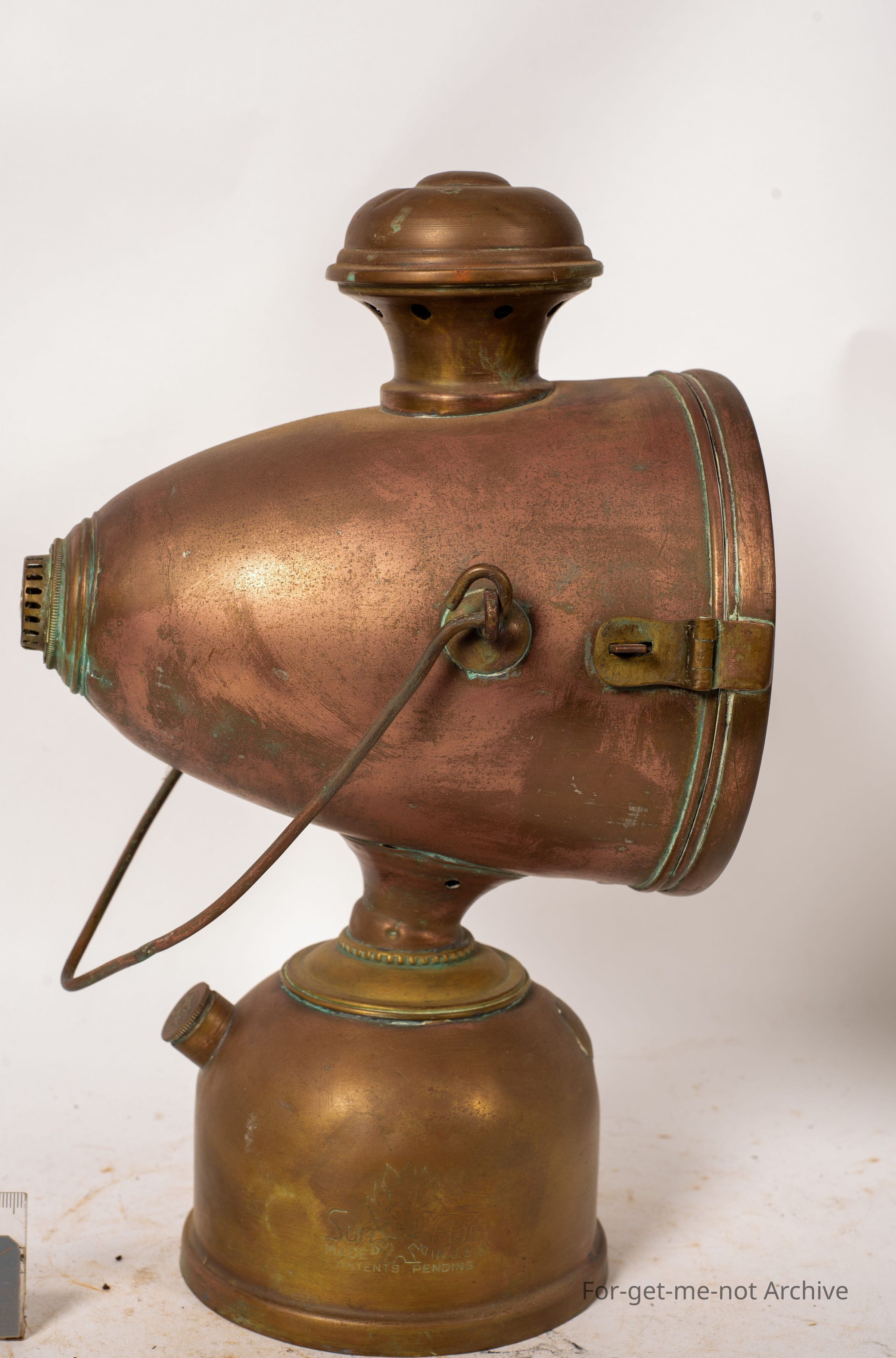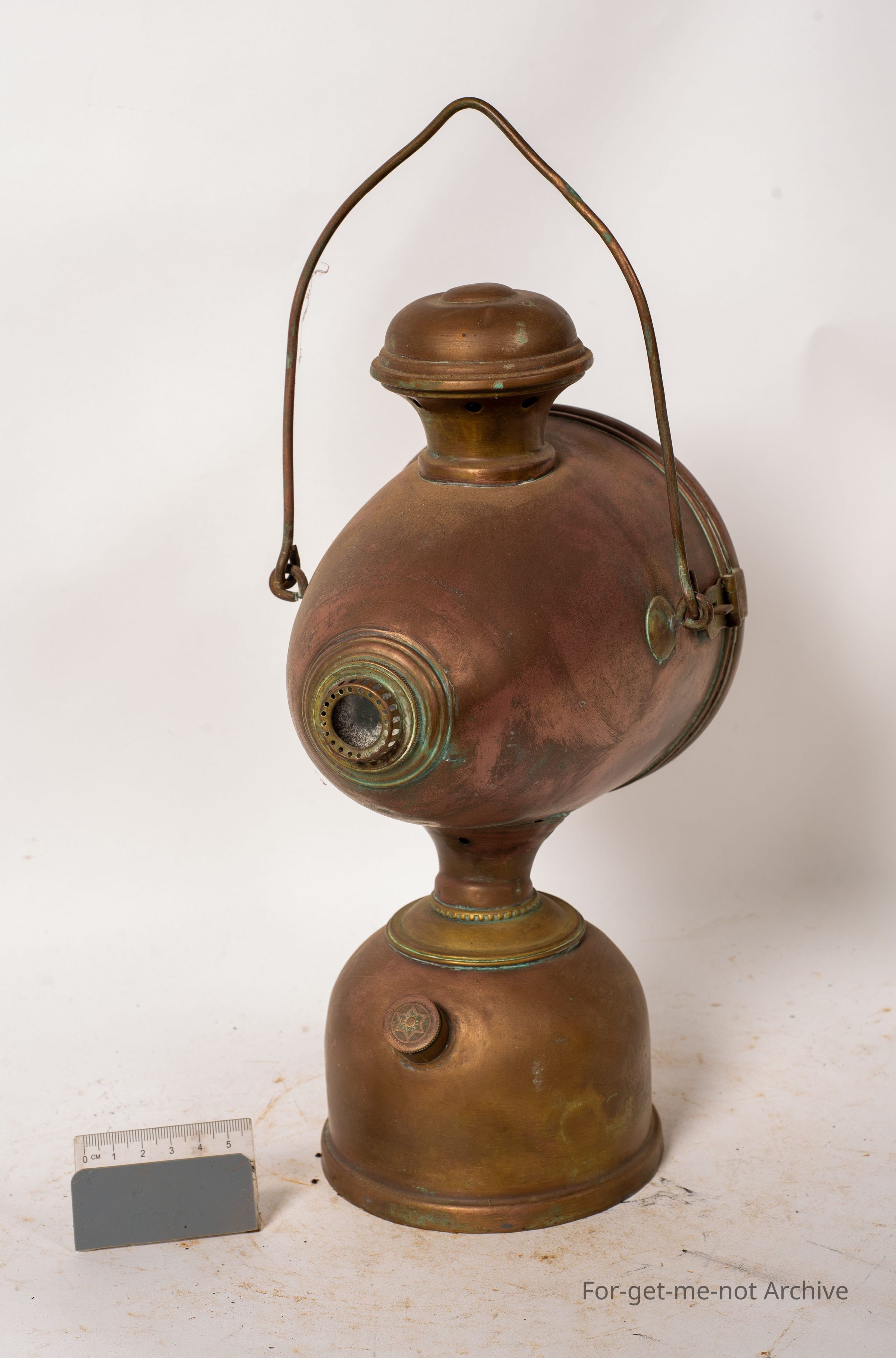 This is an all glass bodied lamp, vent at the top, the burner the reflector part on the top is almost like a car headlight. The fuel tank underneath, no, stampings that I could see.Collection