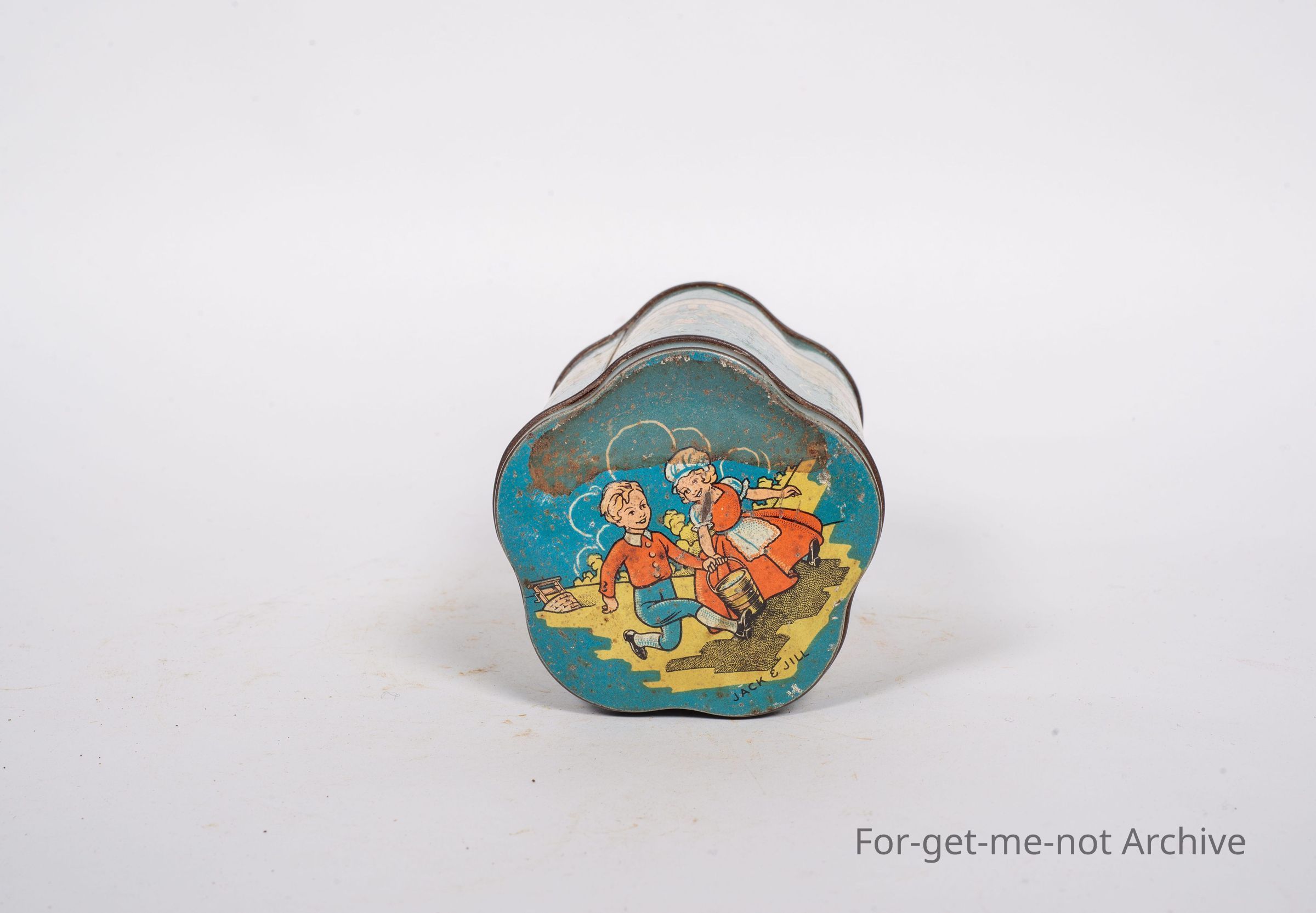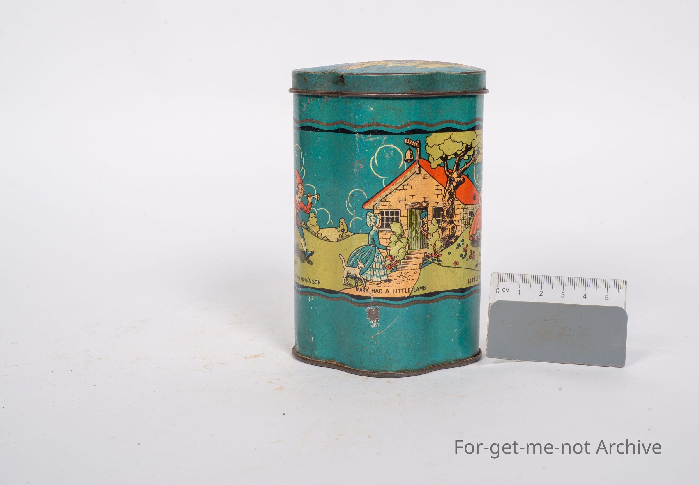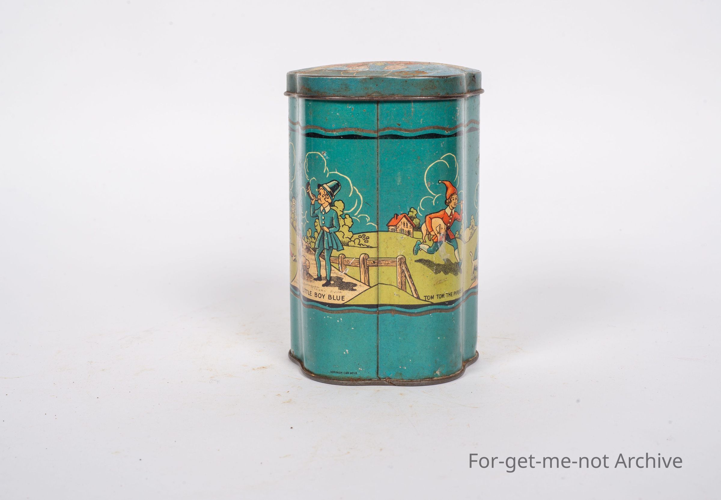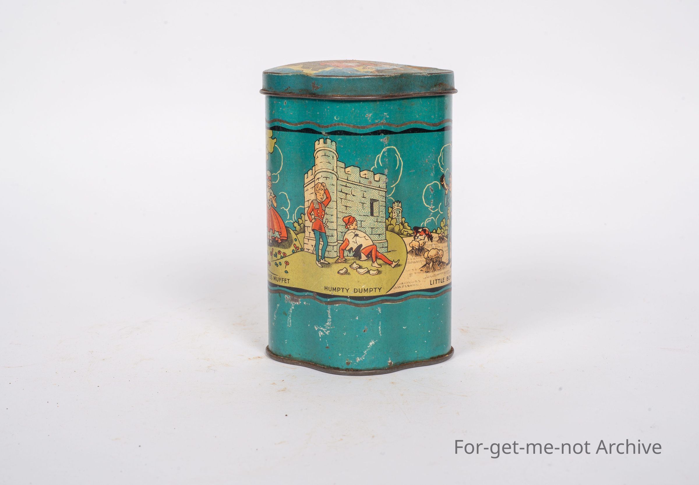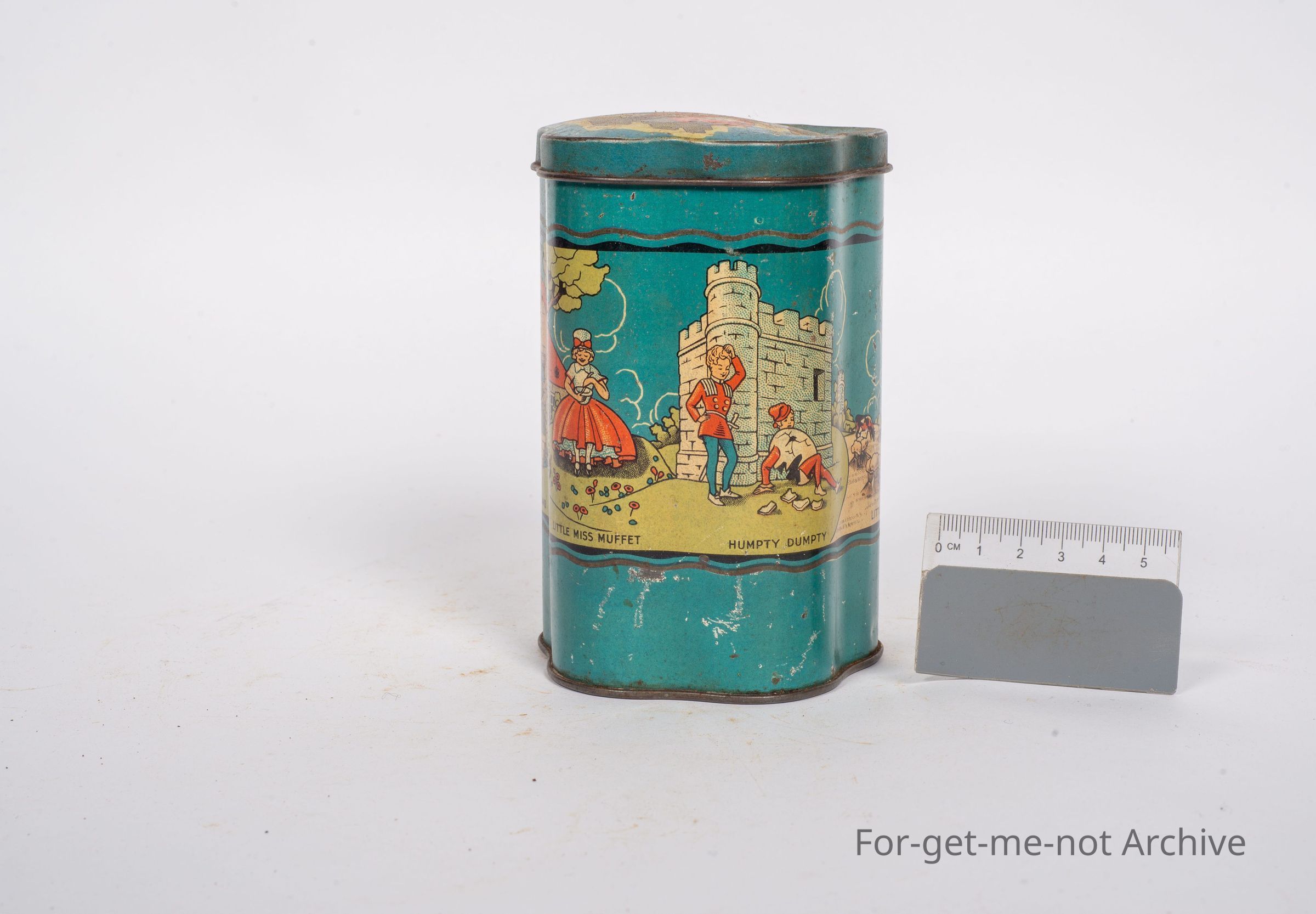 Is another Allen Sweets tin, with nursery rhyme nursery rhyme scenes. Little Miss Muffat, Humpy Dumpty, Little Boy Blue. This is made by the Dominion Can Company. Pretty good nick.