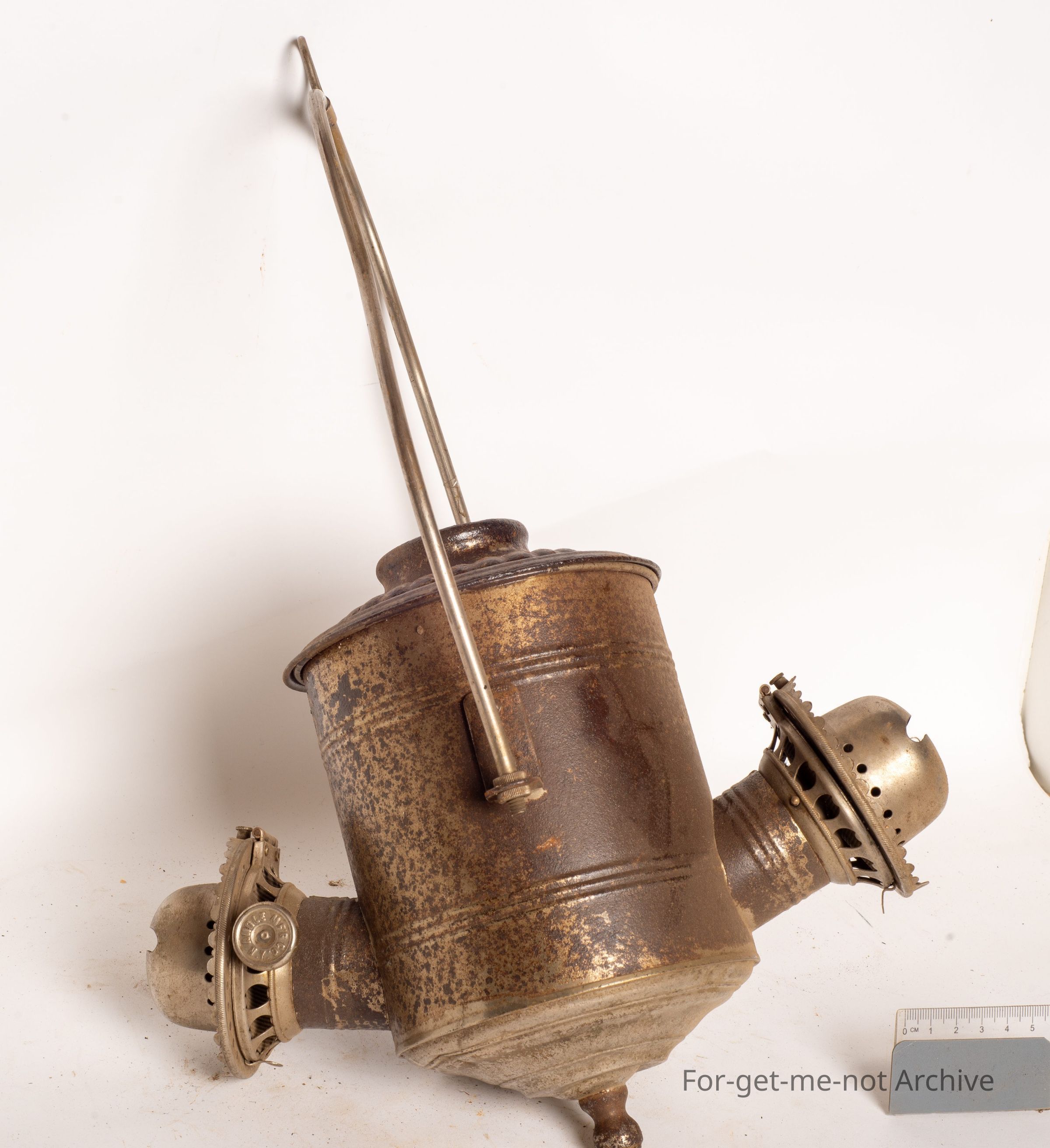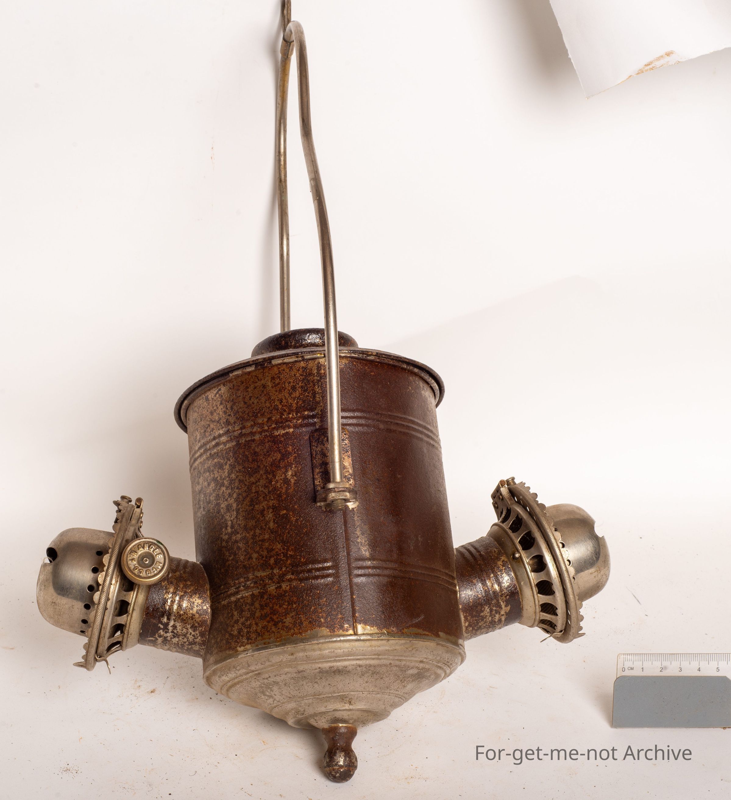 This is an American angle lamp. These are hanging lamp. This one has got the burners. Unfortunately, no lens or chimney cap. Very difficult to get these today. Other than that, all the, burner is intact. Lovely piece, but no lens.Collection