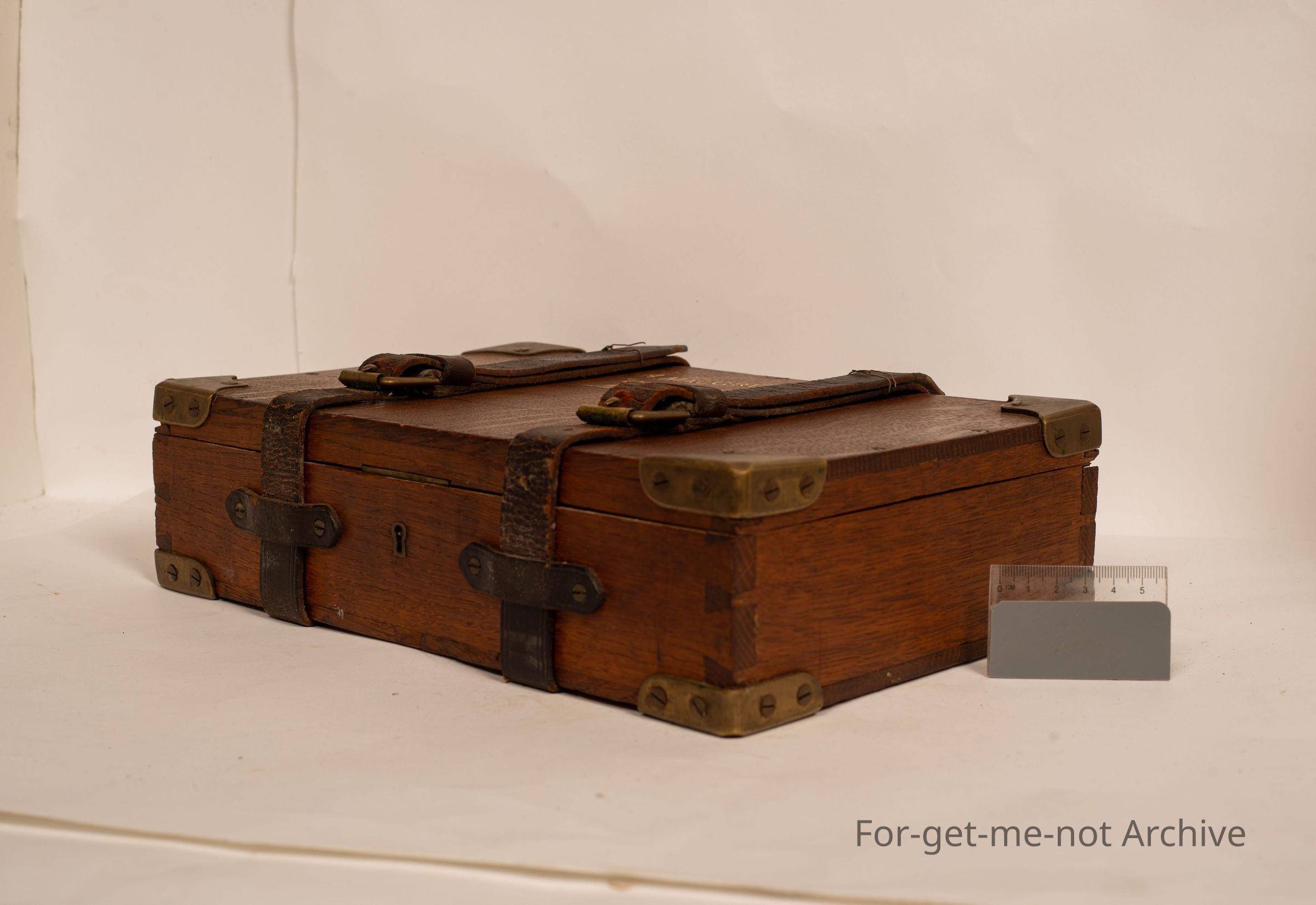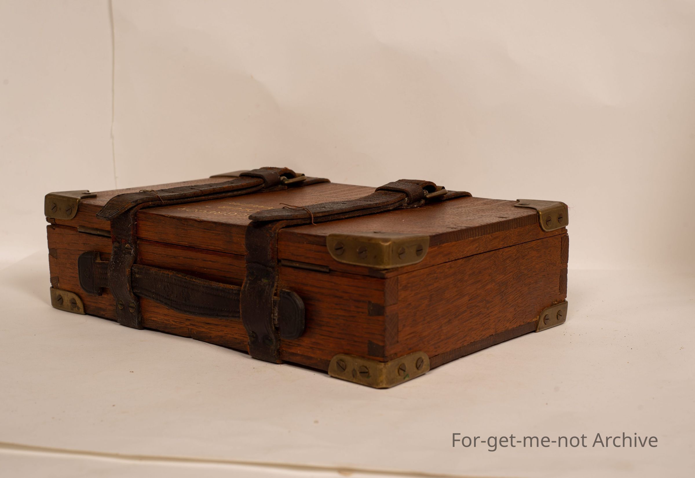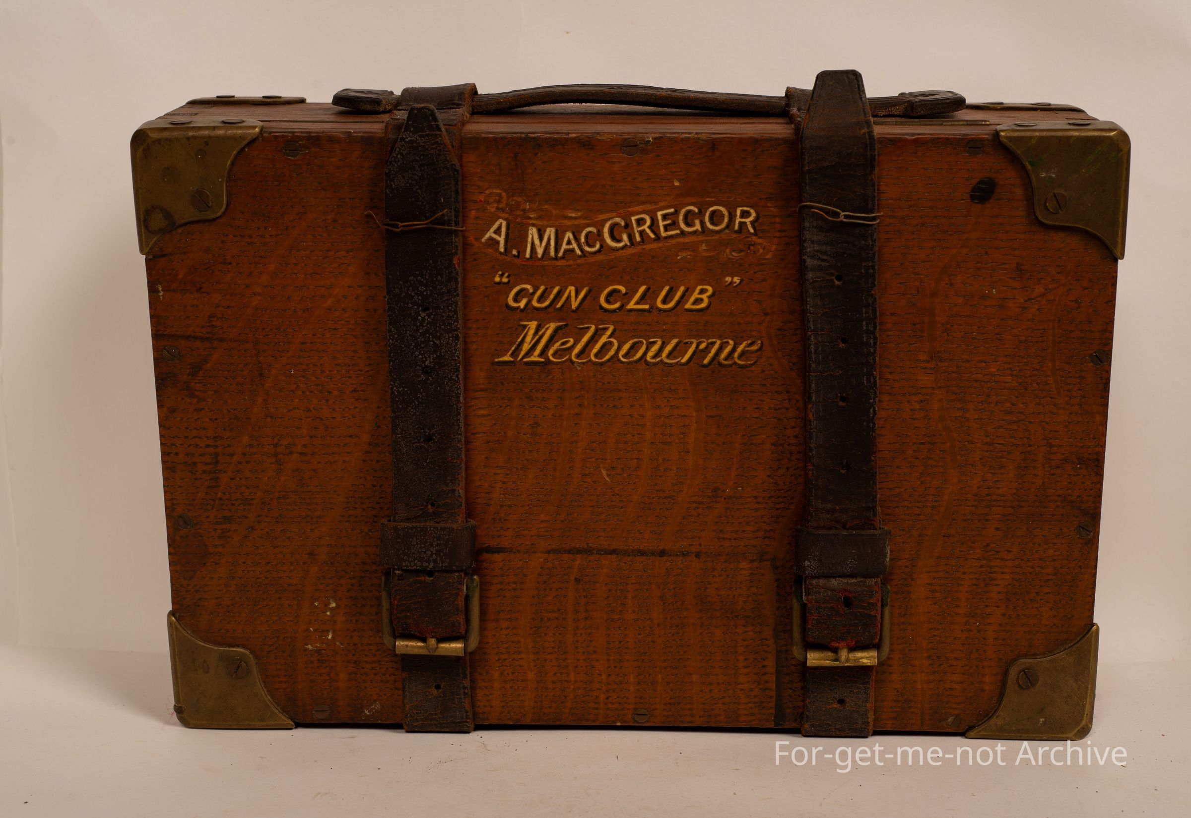A wooden, ammunition box with leather straps, brass corners, beautifully made, titled A MacGregor Gun Club, Melbourne.