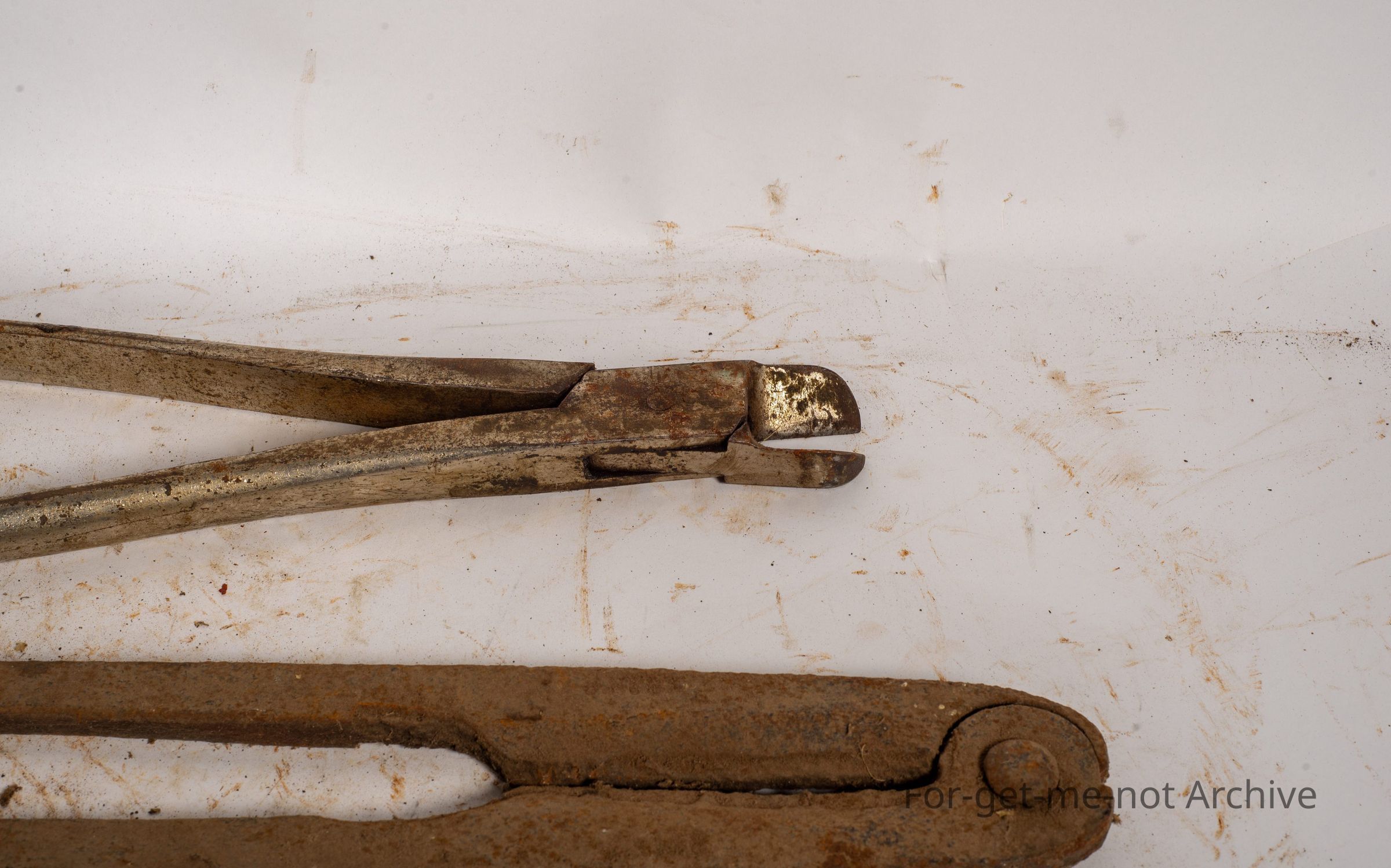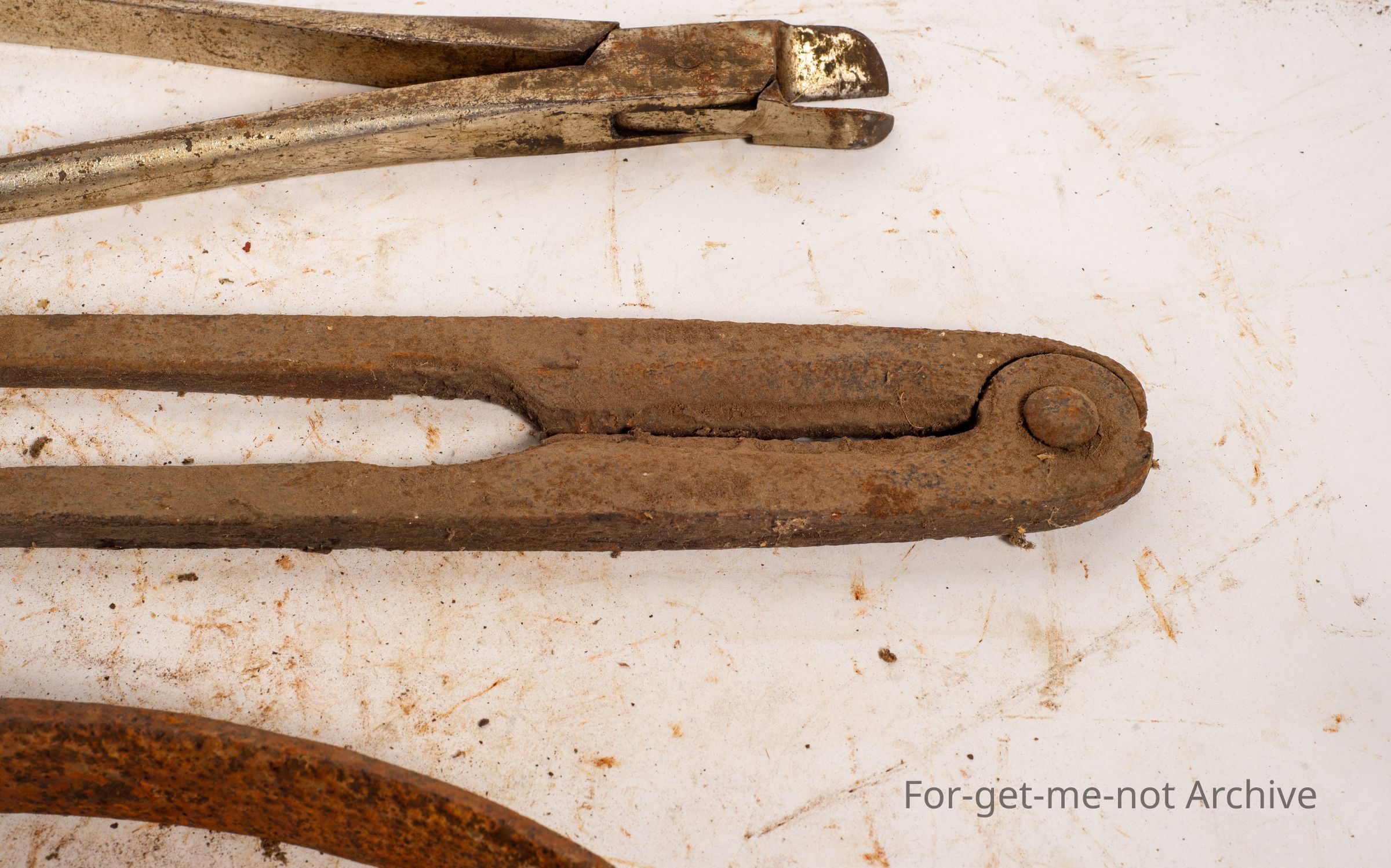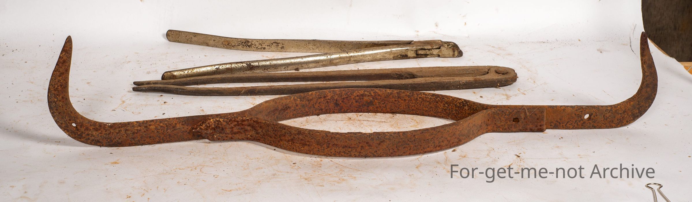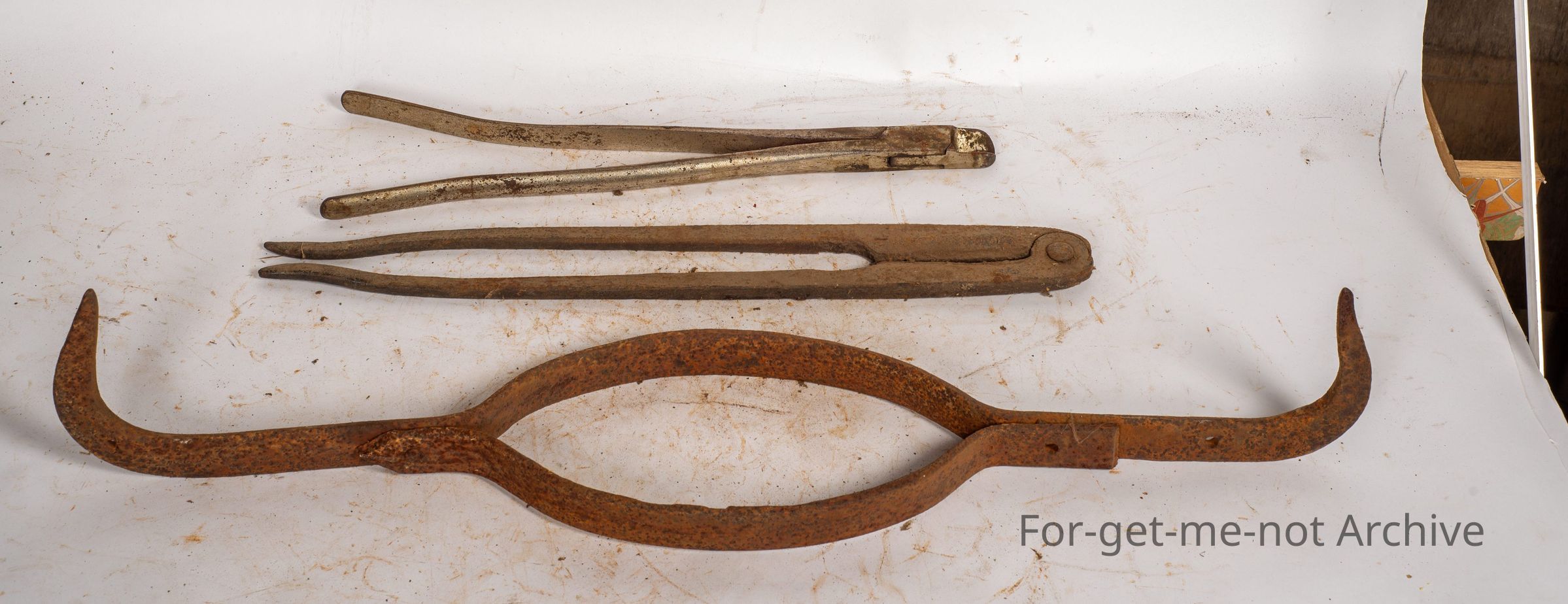 The big loop one with a hook on either end was to prevent a cow going through fences. The large plier type things were for cutting horse's teeth. The one in the middle with the two blades was for castrating, large animals.Collection
