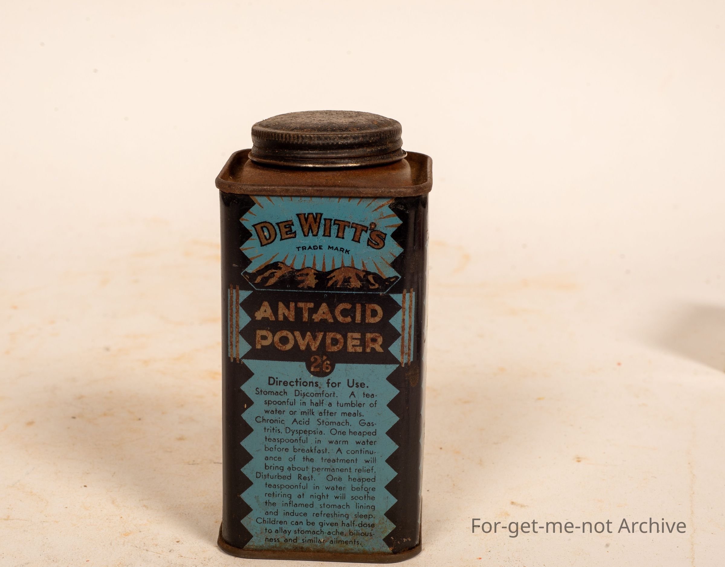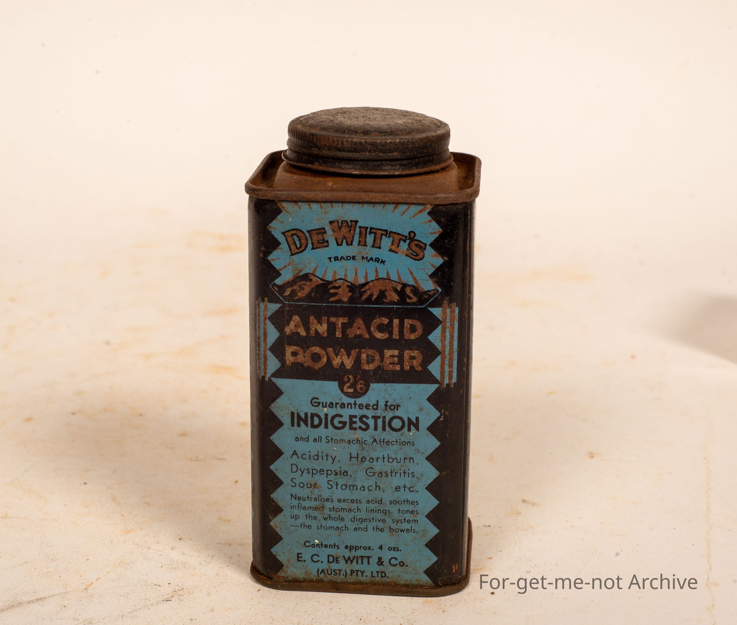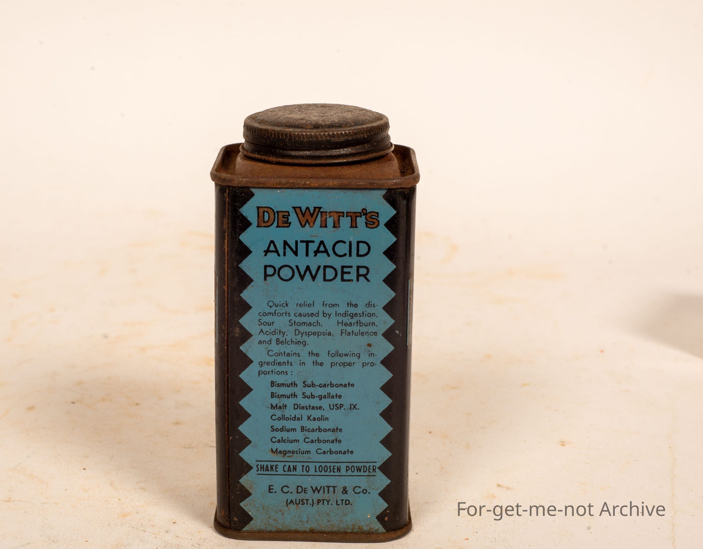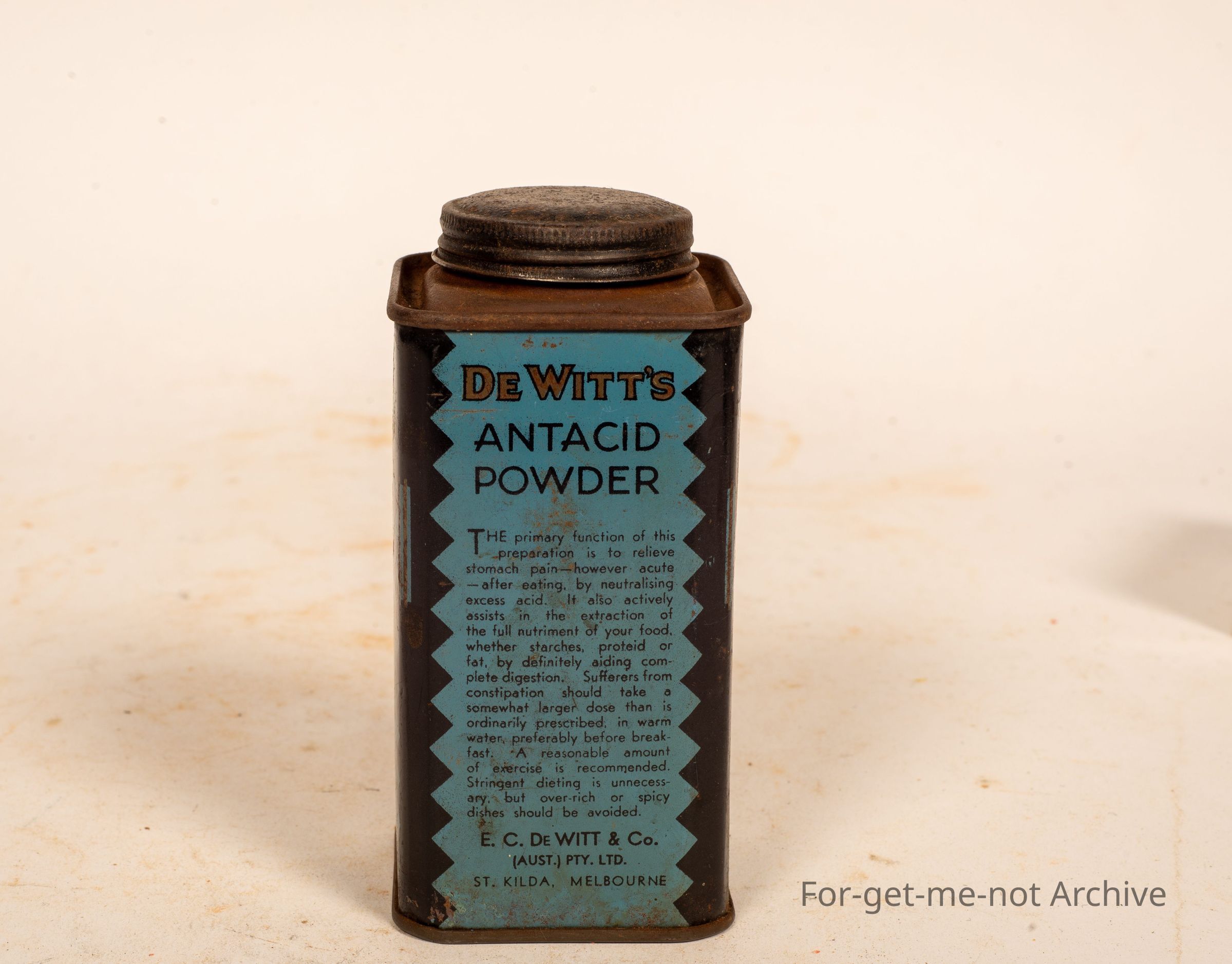 Is a tin of DeWitt's Antacid Powder for indigestion. Packed by DeWitt. St. Kilda Melbourne. Good order.