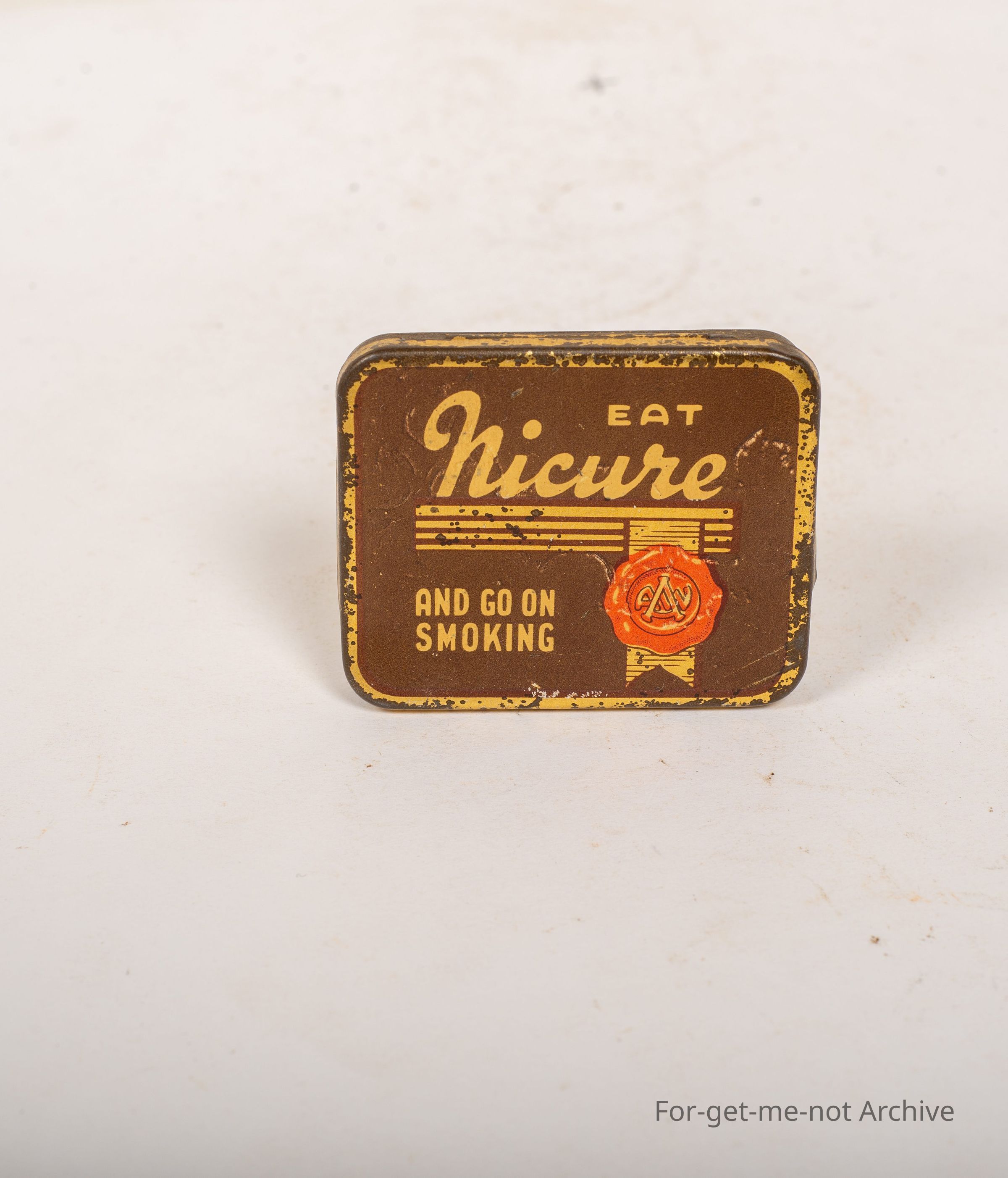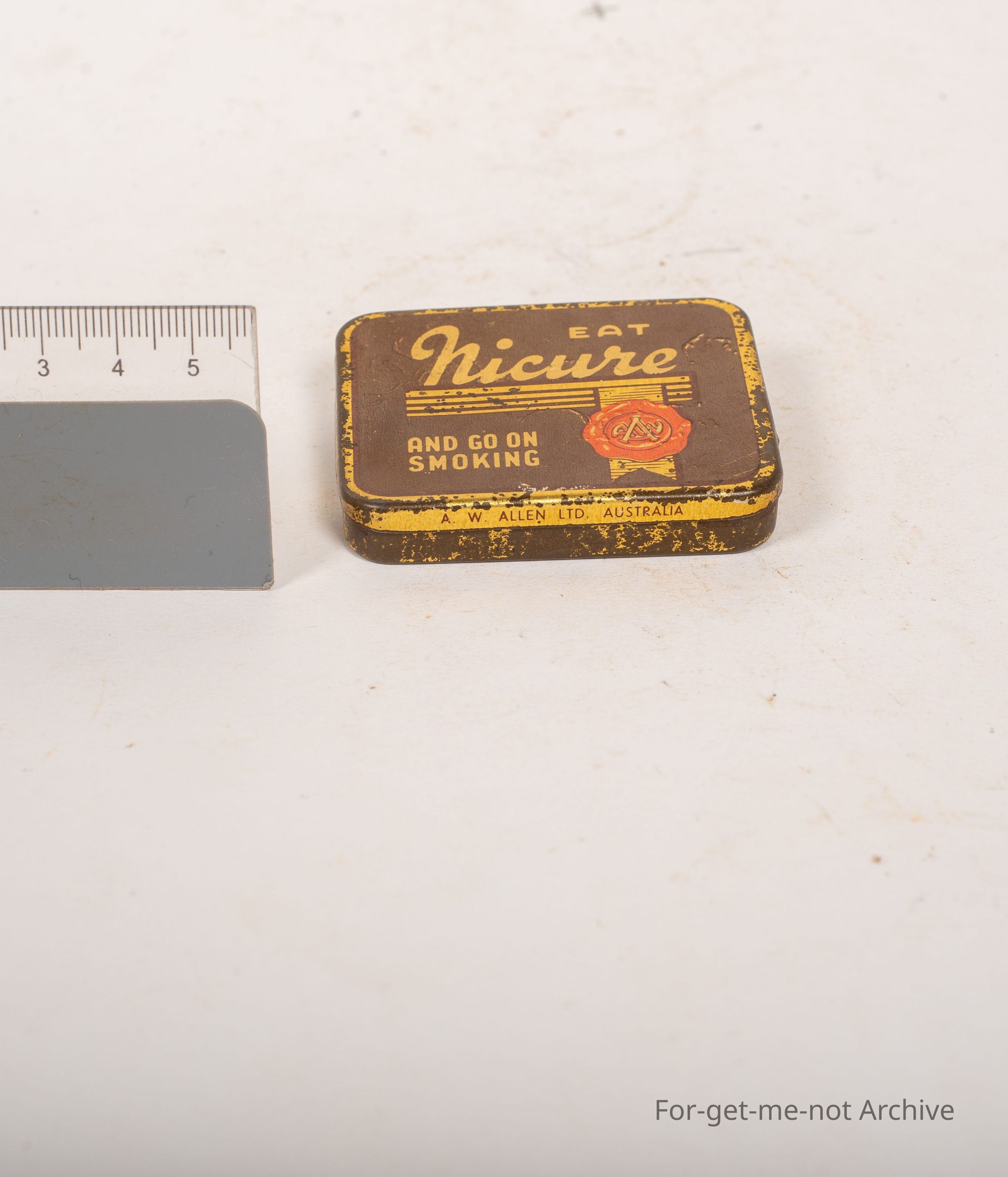 A tin of Nicure, Eat and Go On Smoking. Made by AW Allen Australia, which is a street a sweet company, probably a rare tin.