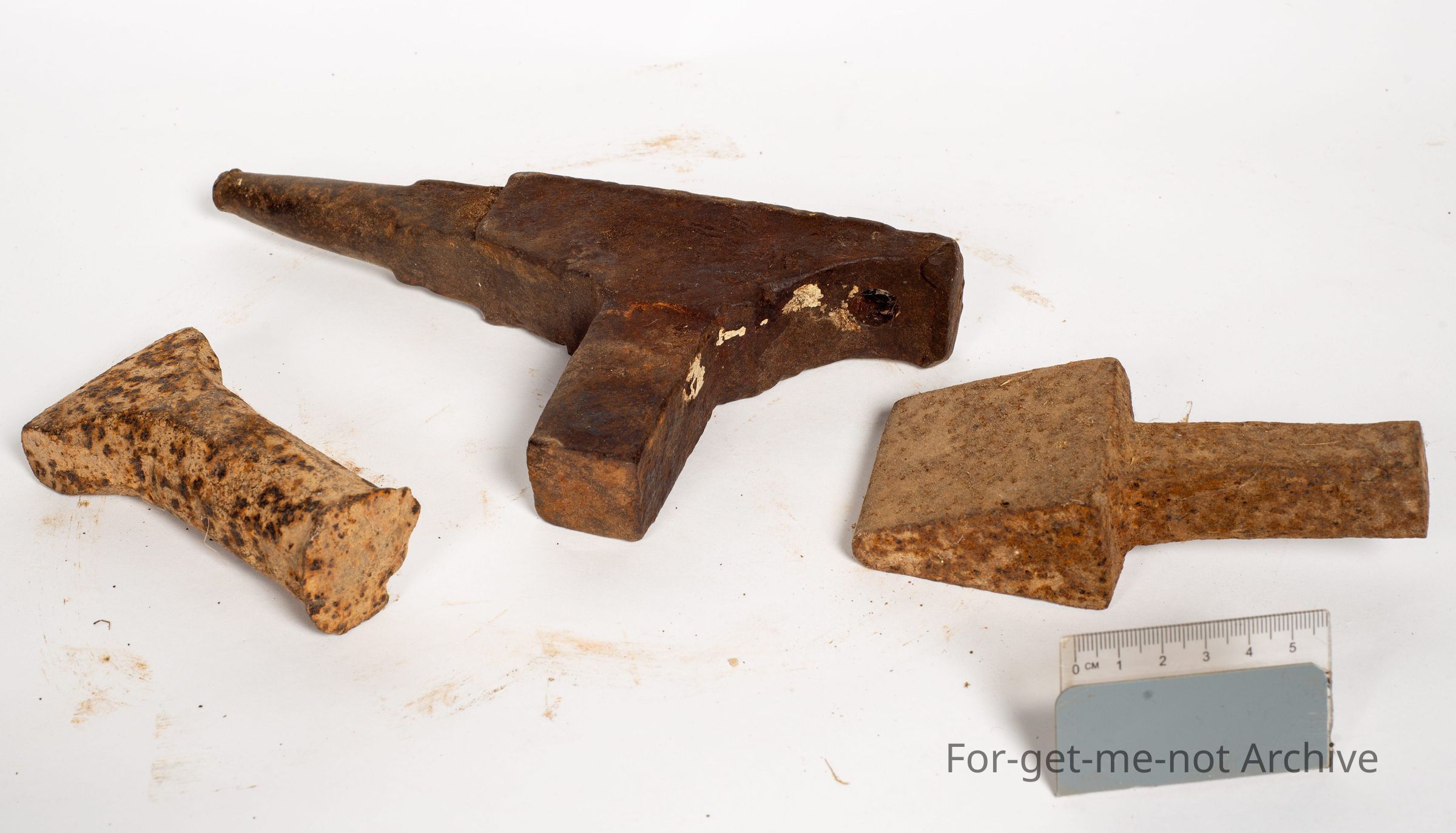 These are 3, tools known as a hardie that are a fitting of a bigger an, anvil. 1 is a small anvil that fits into a bigger one. The other one is a typical hardy cutter. The third one, unknown useCollection