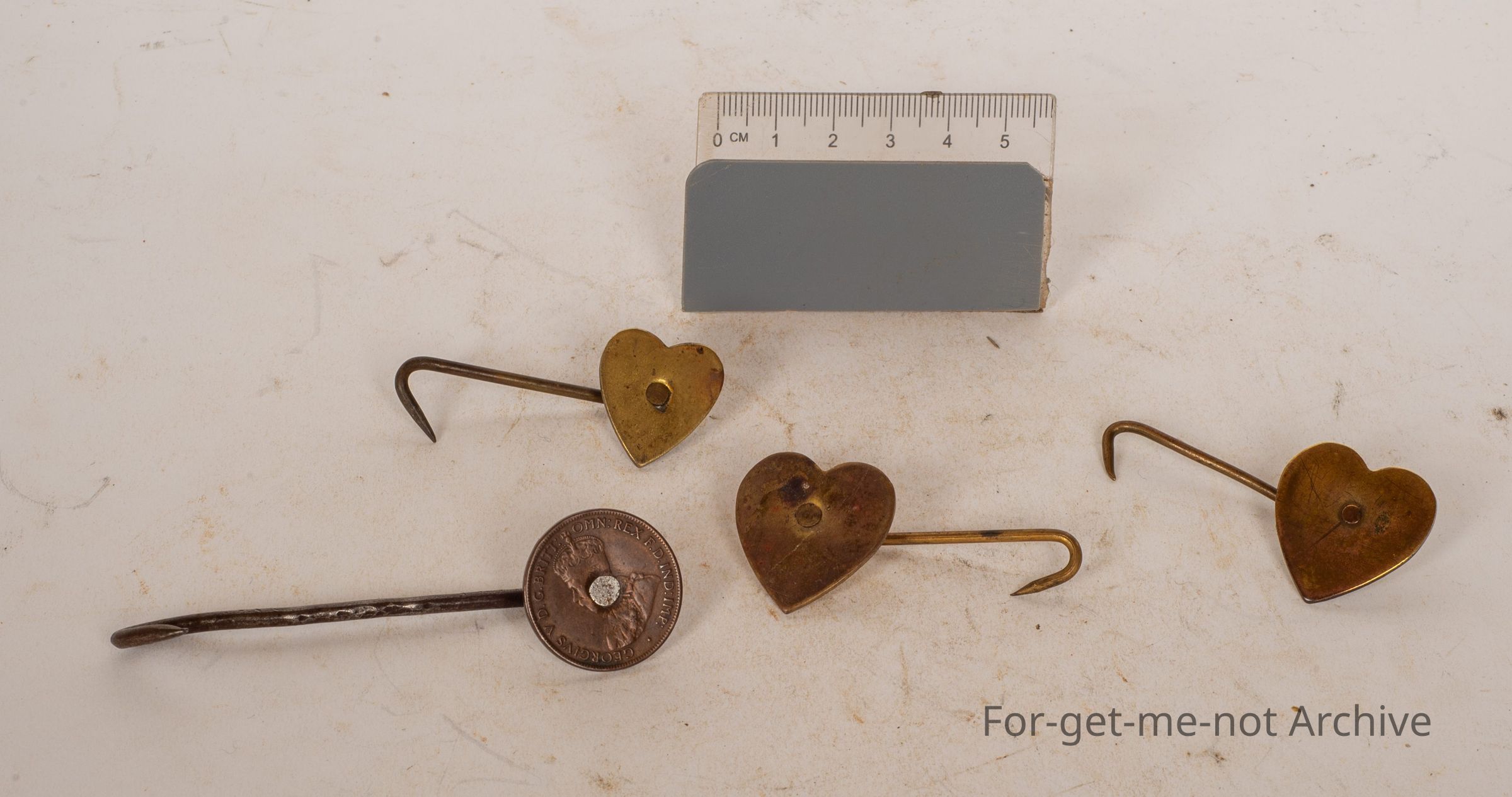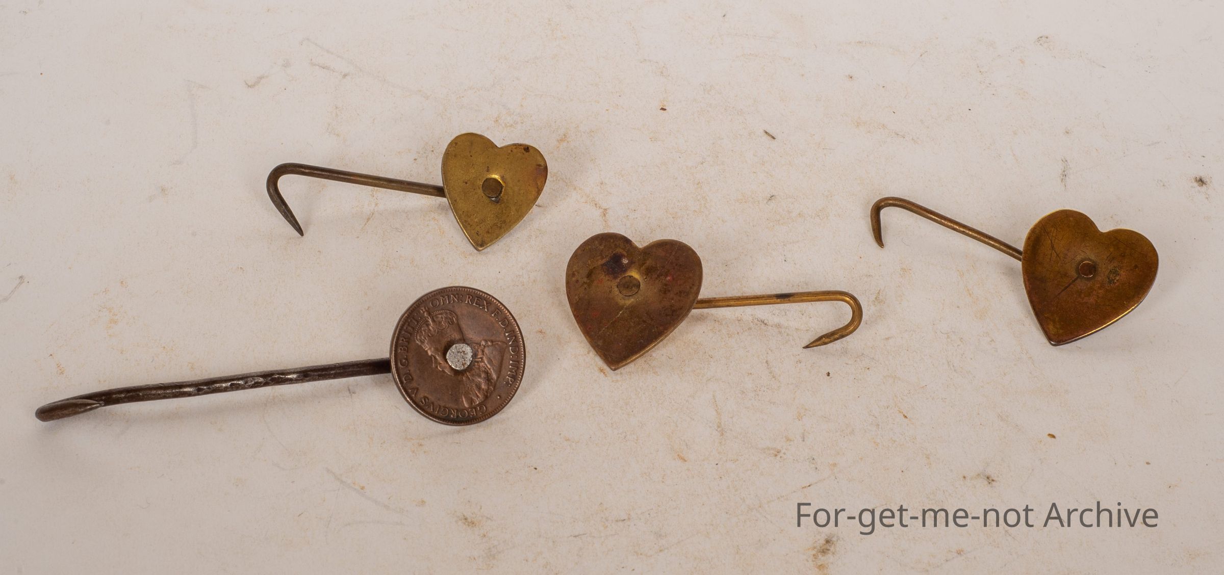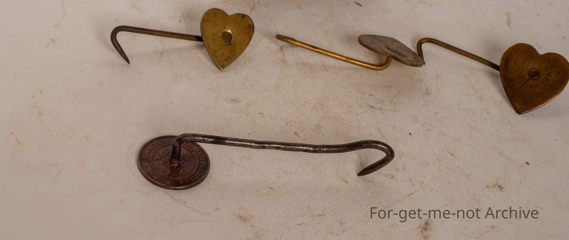 These are 4 apron hooks, 3 in the shape of a heart with the hook. The other one is a homemade one from a penny, dated 1910, I think. These are the Australian equivalent to the English apron hook. The English one had each trade nominated on the flat plate. These ones are all plain, but still exceptionally rare. These are from the year when every trade wore an apron, as part of their, trainingCollection