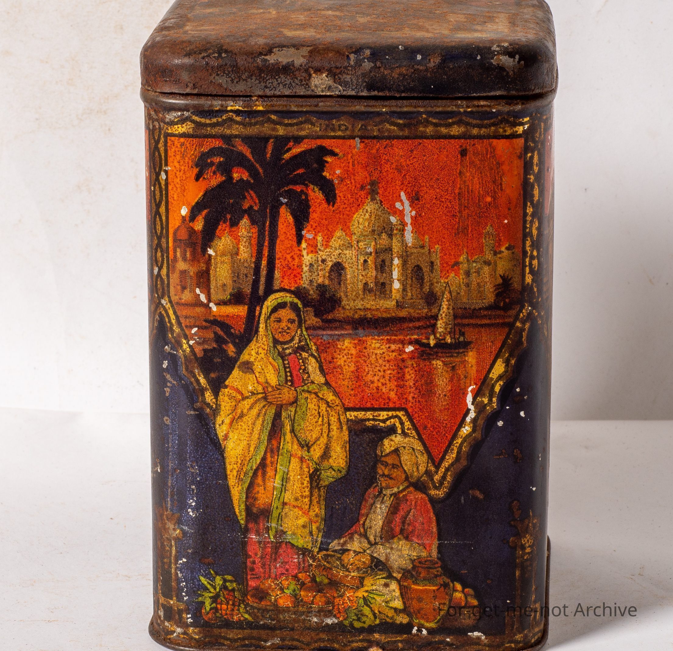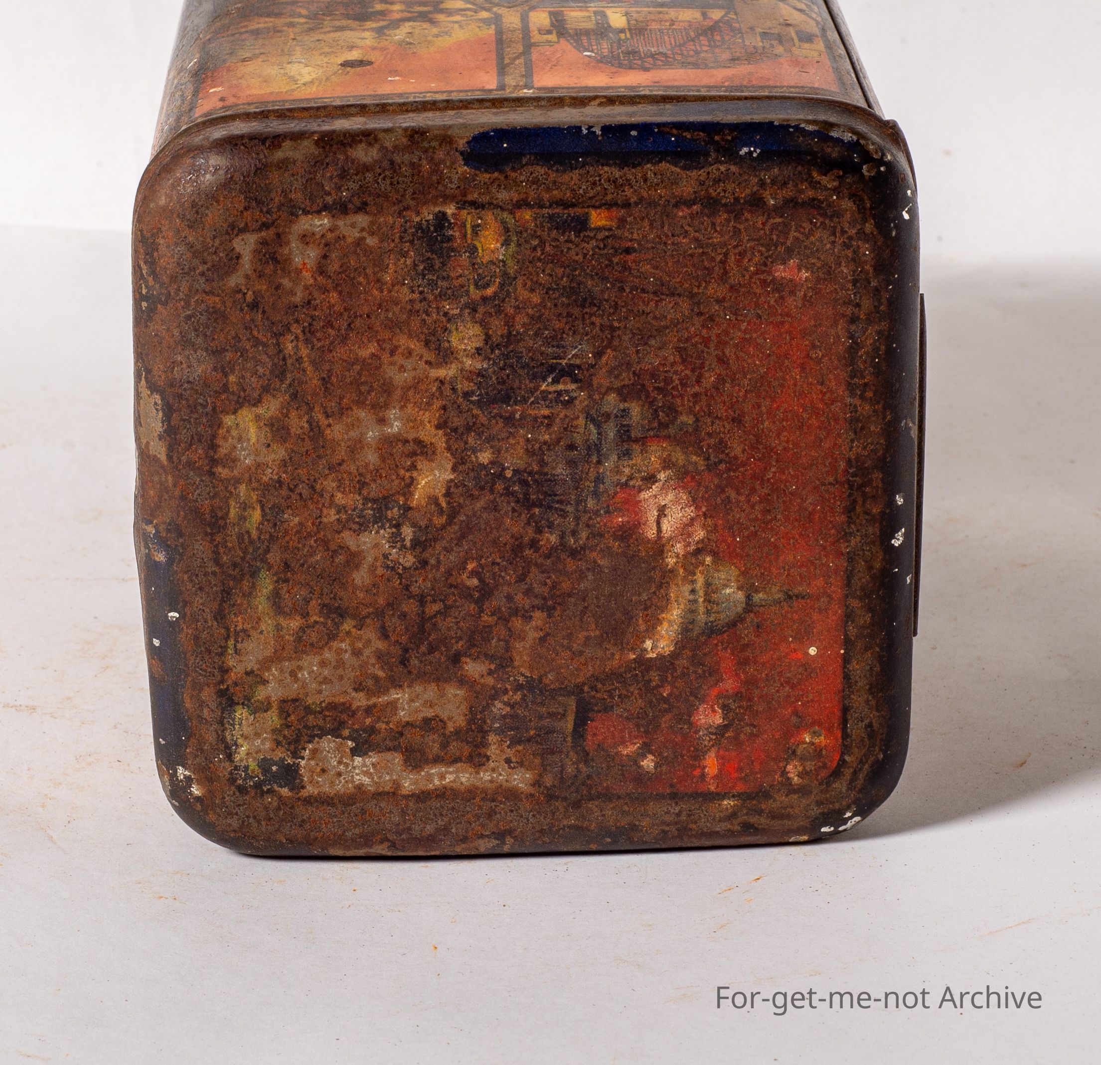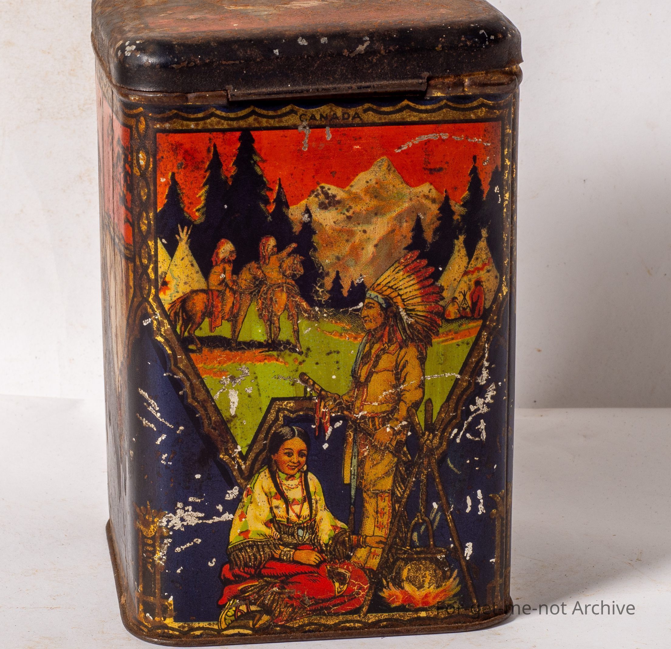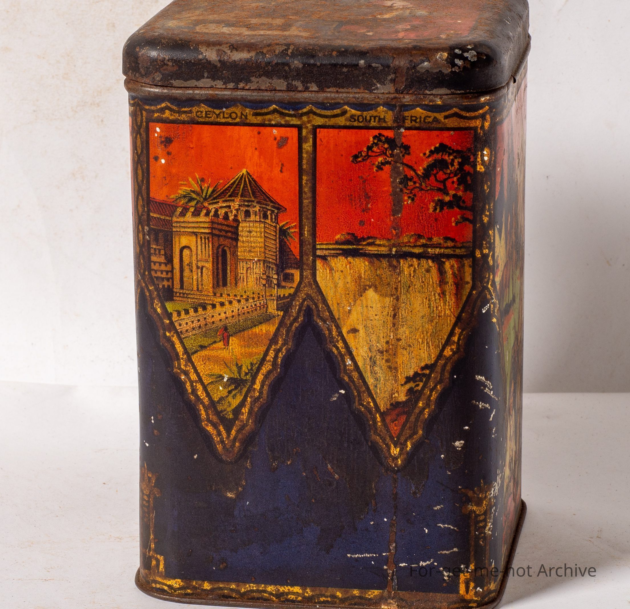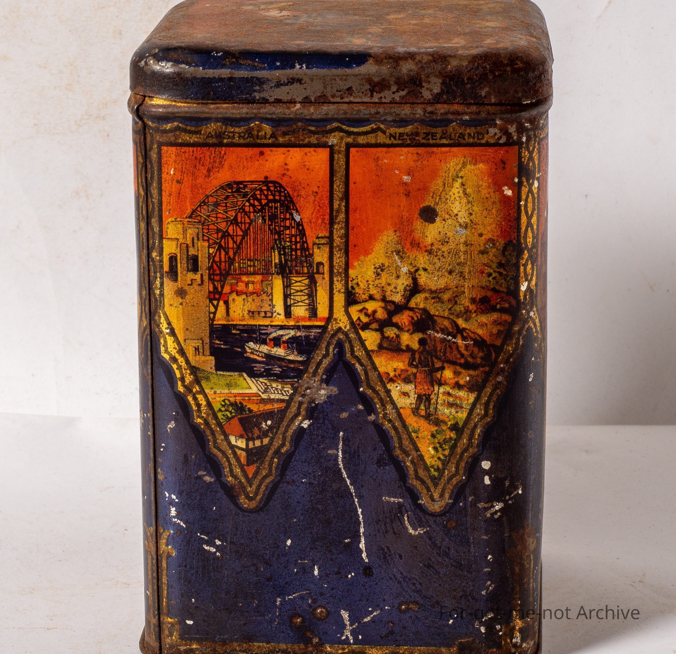 This is a very early tin from Arnott's at Homebush Sydney. This tin has different images, with an international flavour. Niagara Falls, the Middle East, Australia with the Sydney Harbor Bridge, and Indians from America. It it's down a little bit in condition, but a very early rare tin.Collection