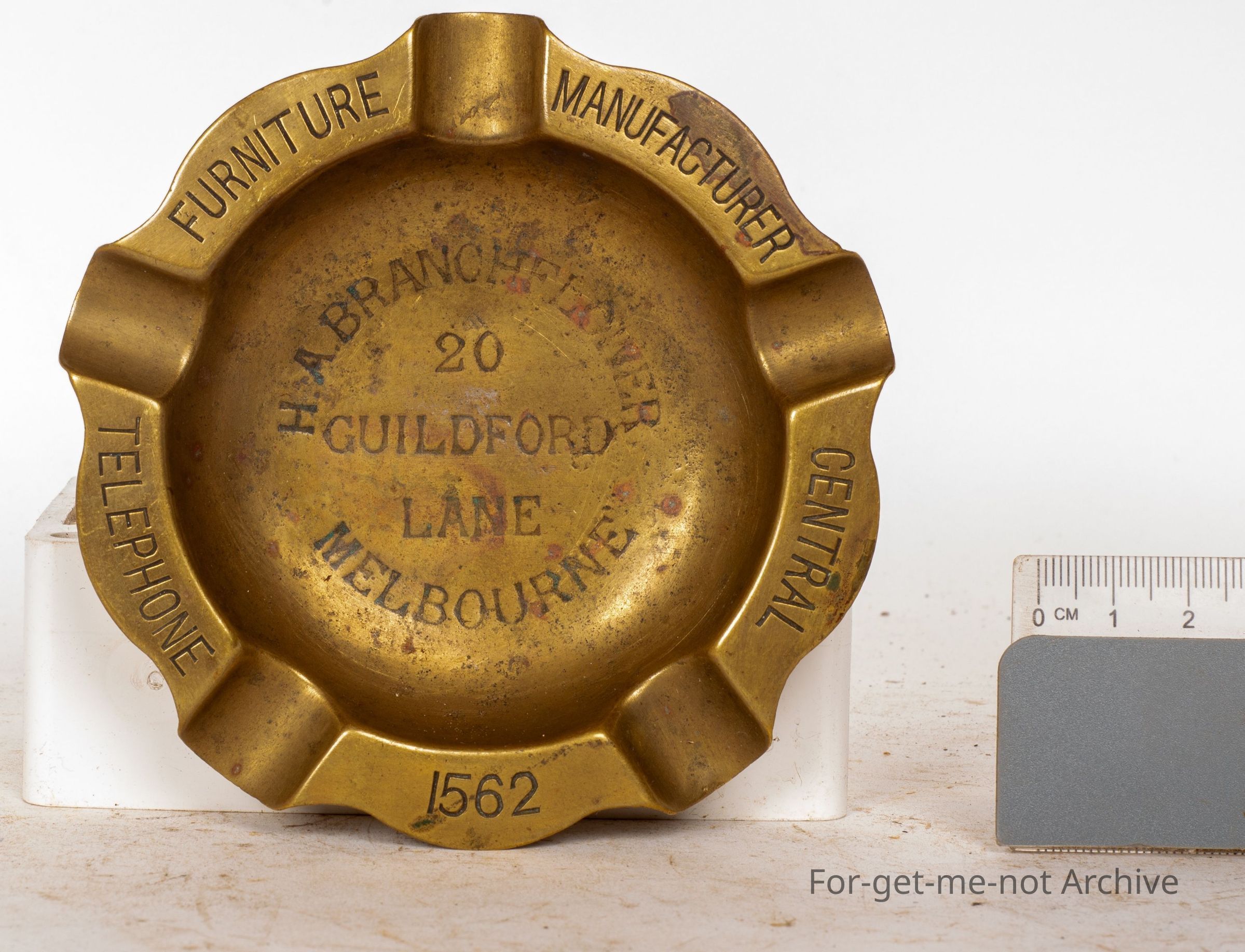 This is a beautiful, pressed brass ashtray advertising. Blanche of Branch Field, Felder, Guildford Lane, Melbourne. Furniture manufacturer, telephone central, 1562. Possibly very early, probably pretty scarceCollection