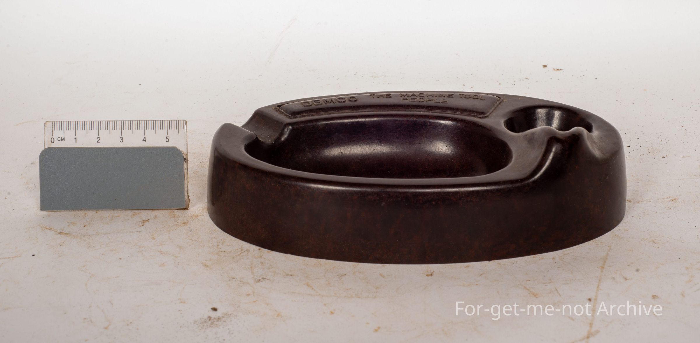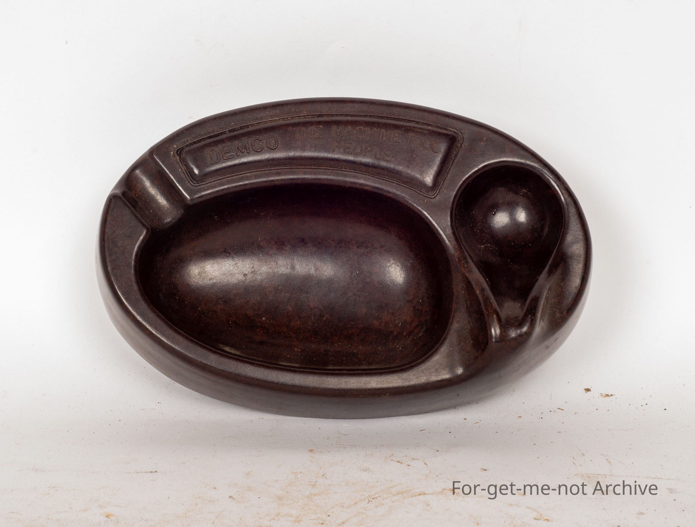 This is rather an ornate, ashtray made of Bakelite. The advertising is Demco, the machine tool people. This has got the, piece for a cigarette or also a pipe rest built into this piece. Lovely condition. Quite a different type of, Bakelite Astray.Collection