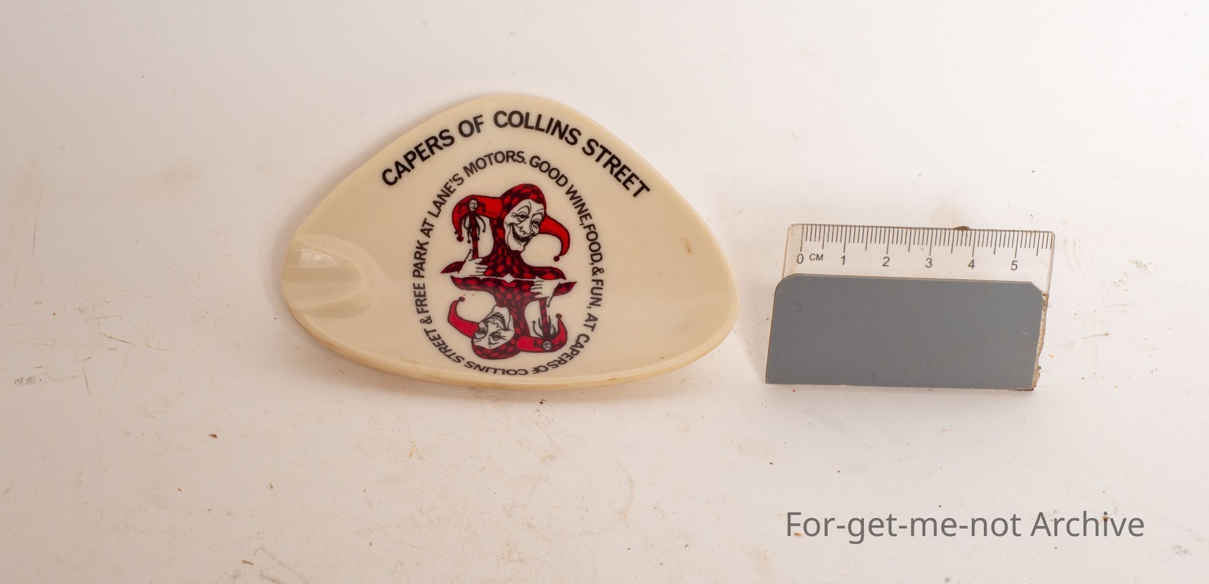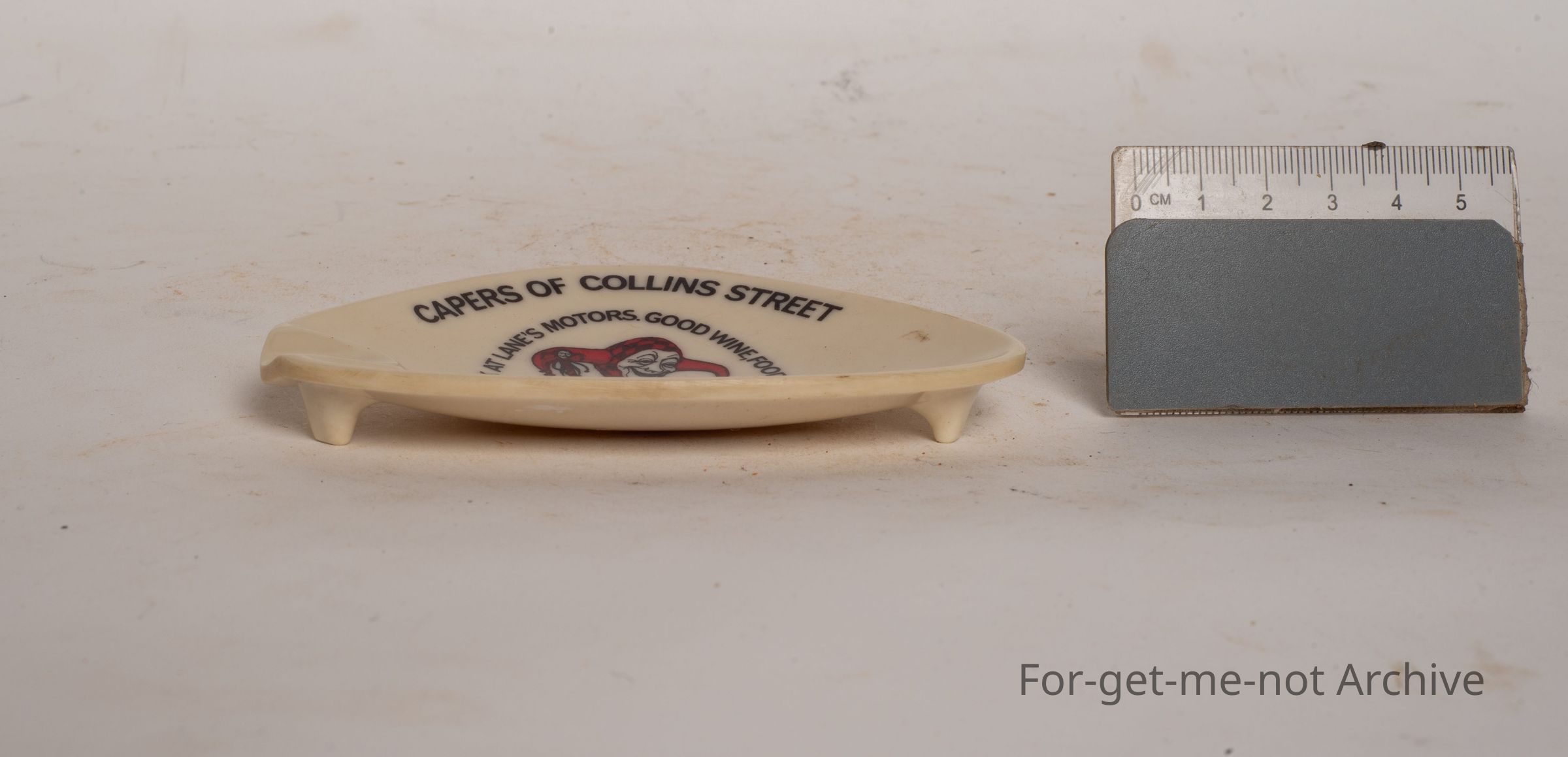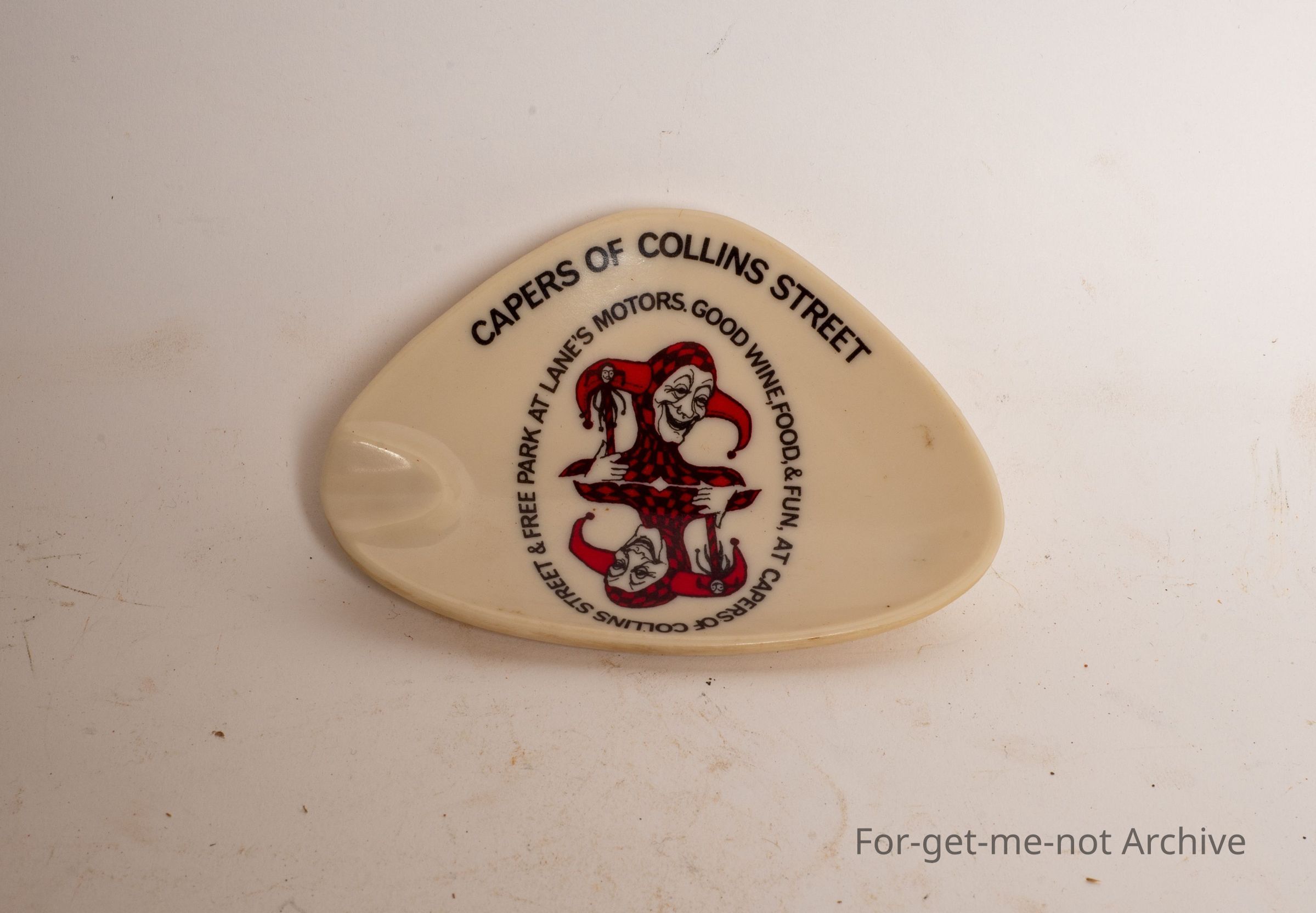 This is a little plastic ashtray type plate, text of capers of column street, Free park at Lane's Motors. Good wine, food and fun at Capers. Lovely little early plastic piece