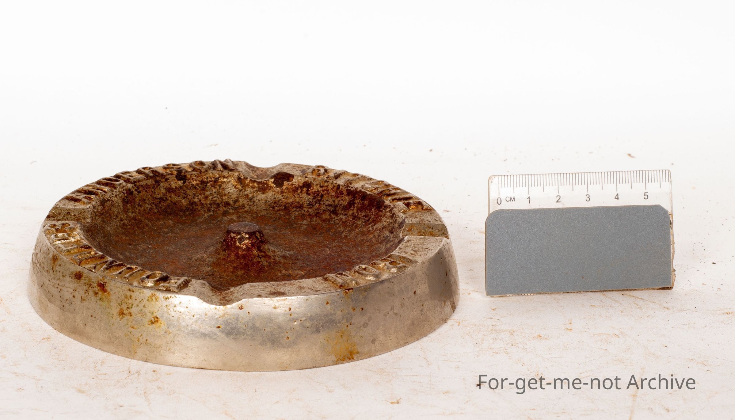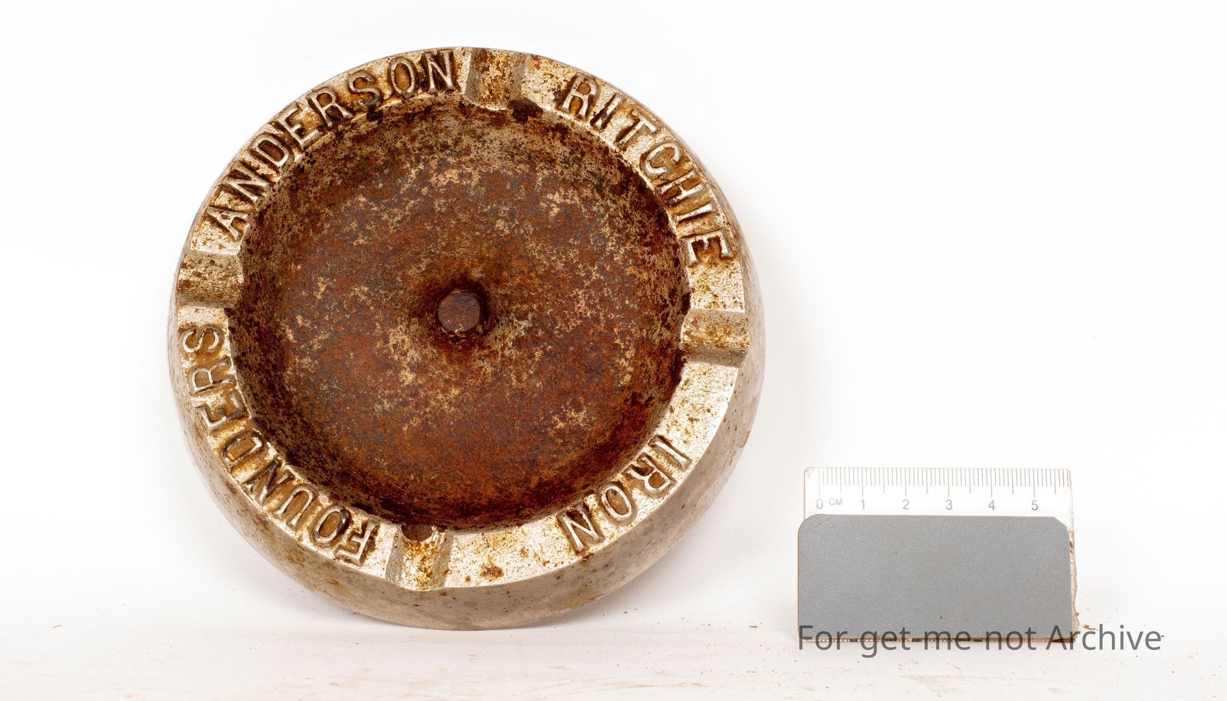 This is a heavy cast iron ashtray advertising, Anderson Ritchie founders, iron, in very good condition, probably quite old, has been, coated in nickel, most of it's gone. Other than that, in good condition.Collection
