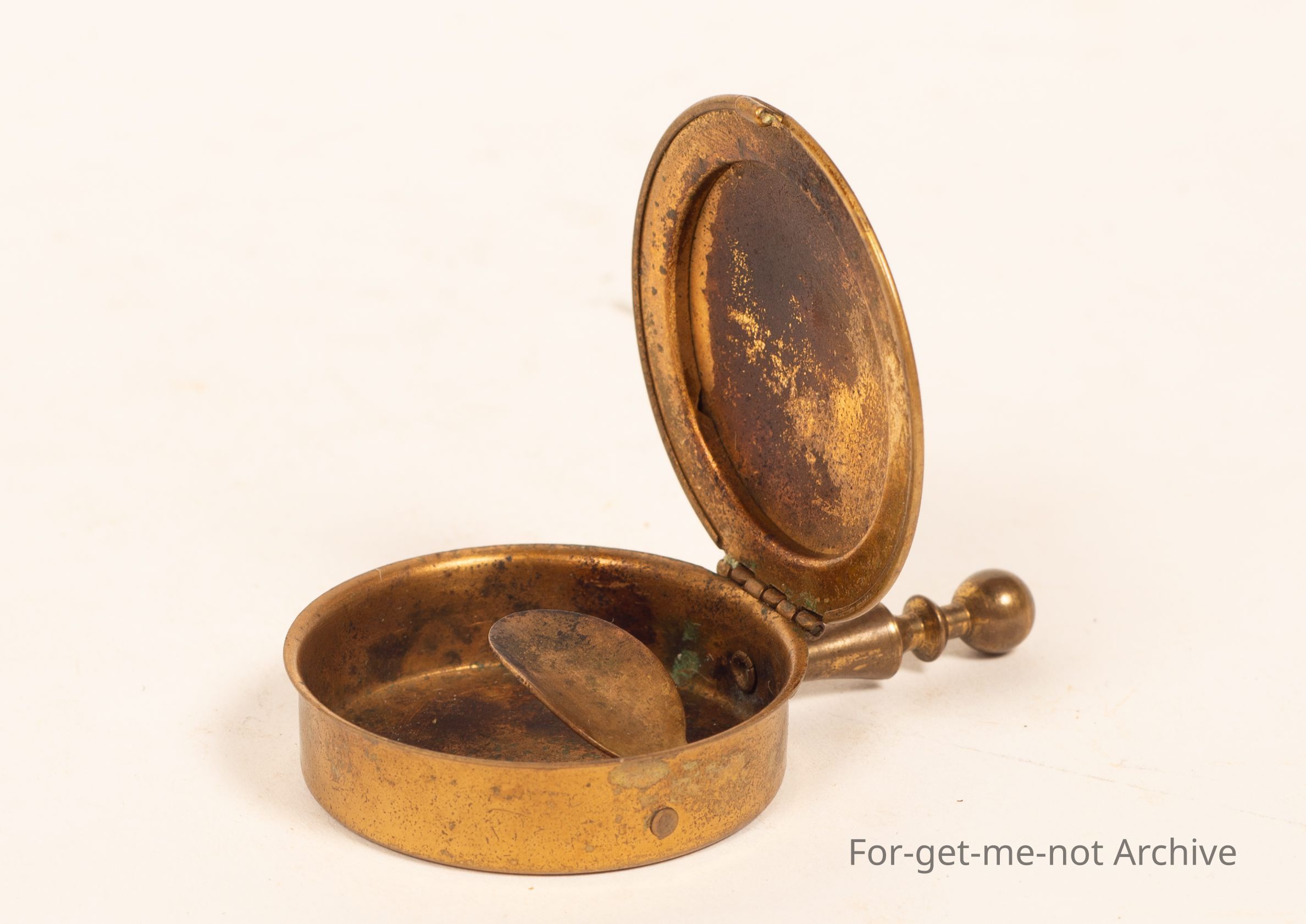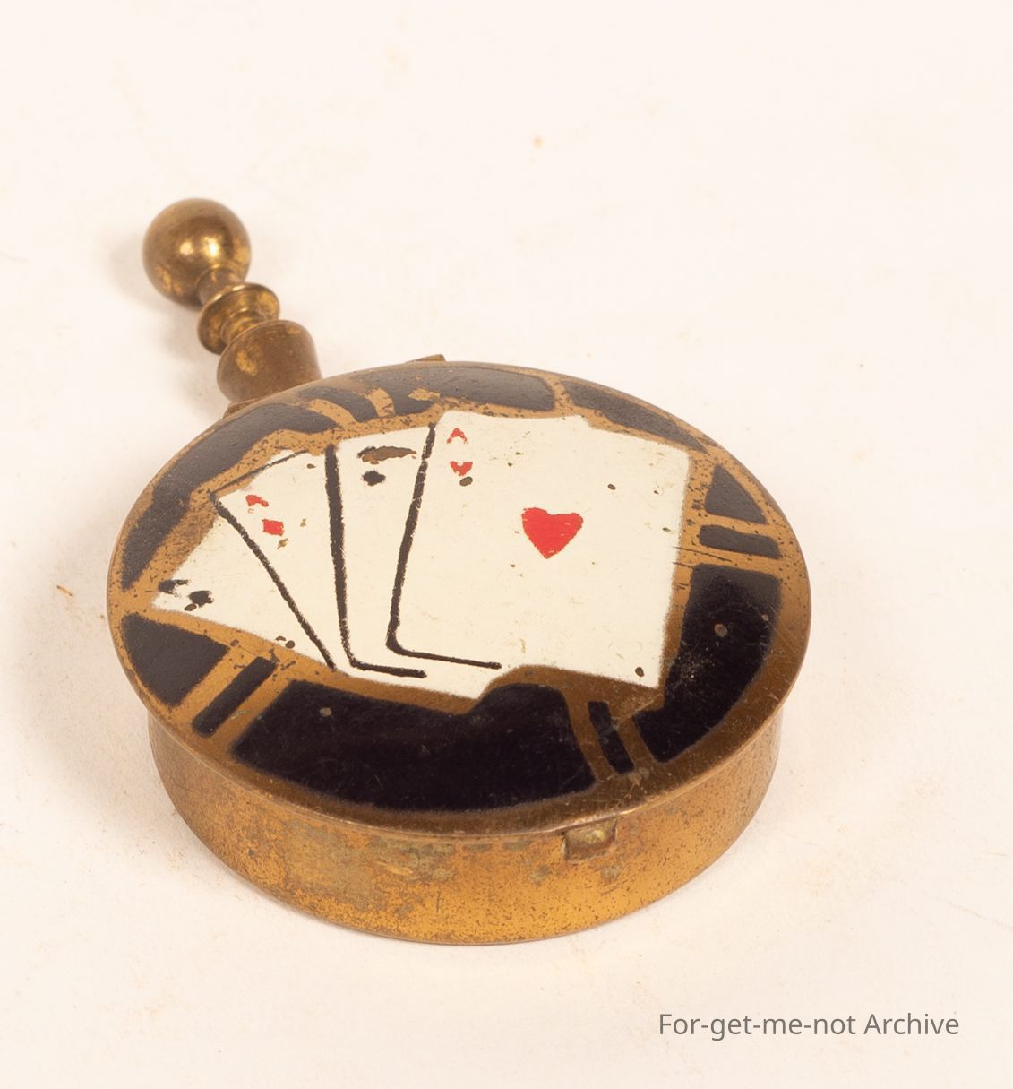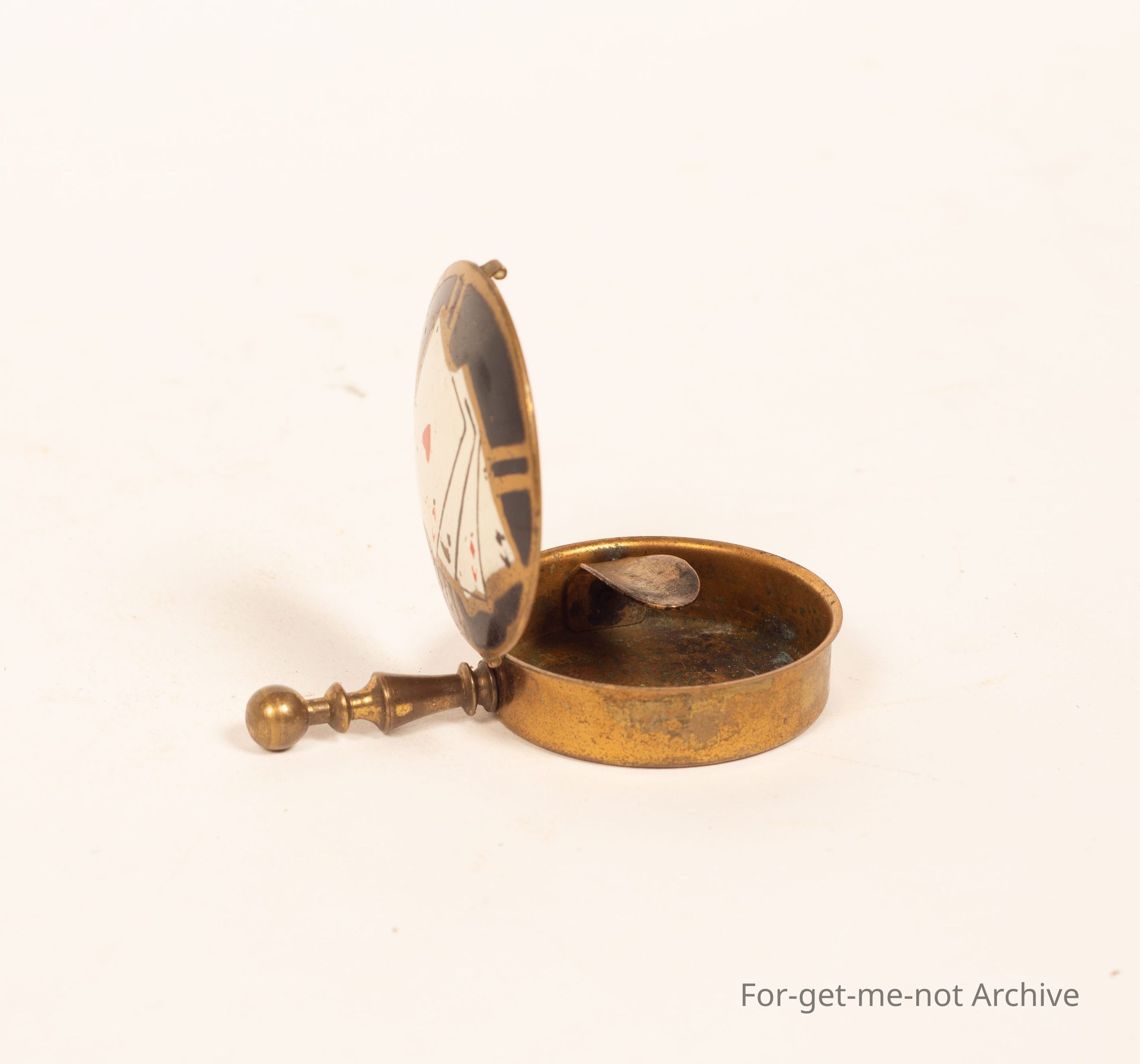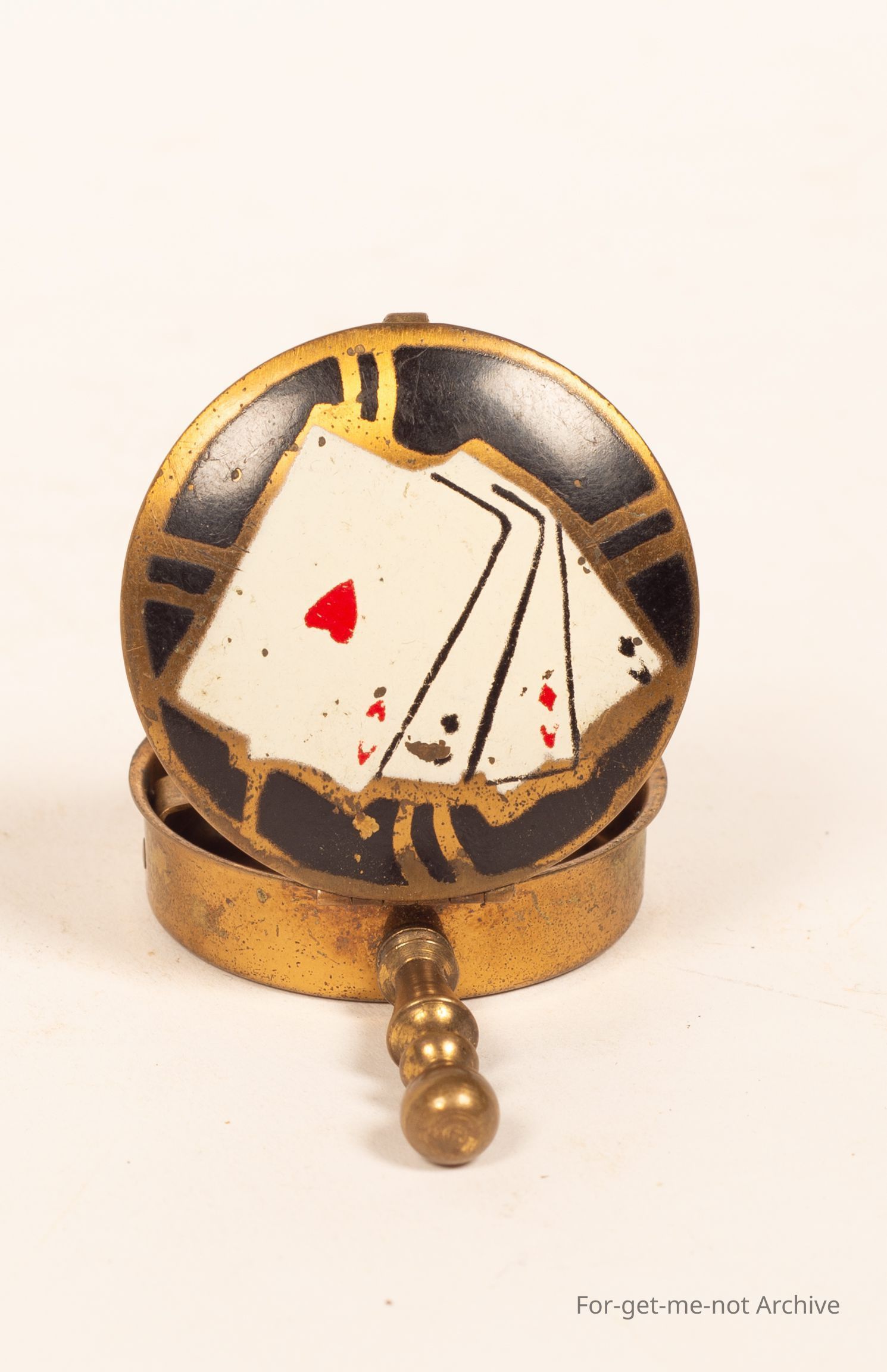 This is a very small brass, ashtray that was used by women so they could discreetly tip the act ash into the tray with a snap top lid and put it back in their handbag. Quite a rare piece. A cards design on the front.Collection