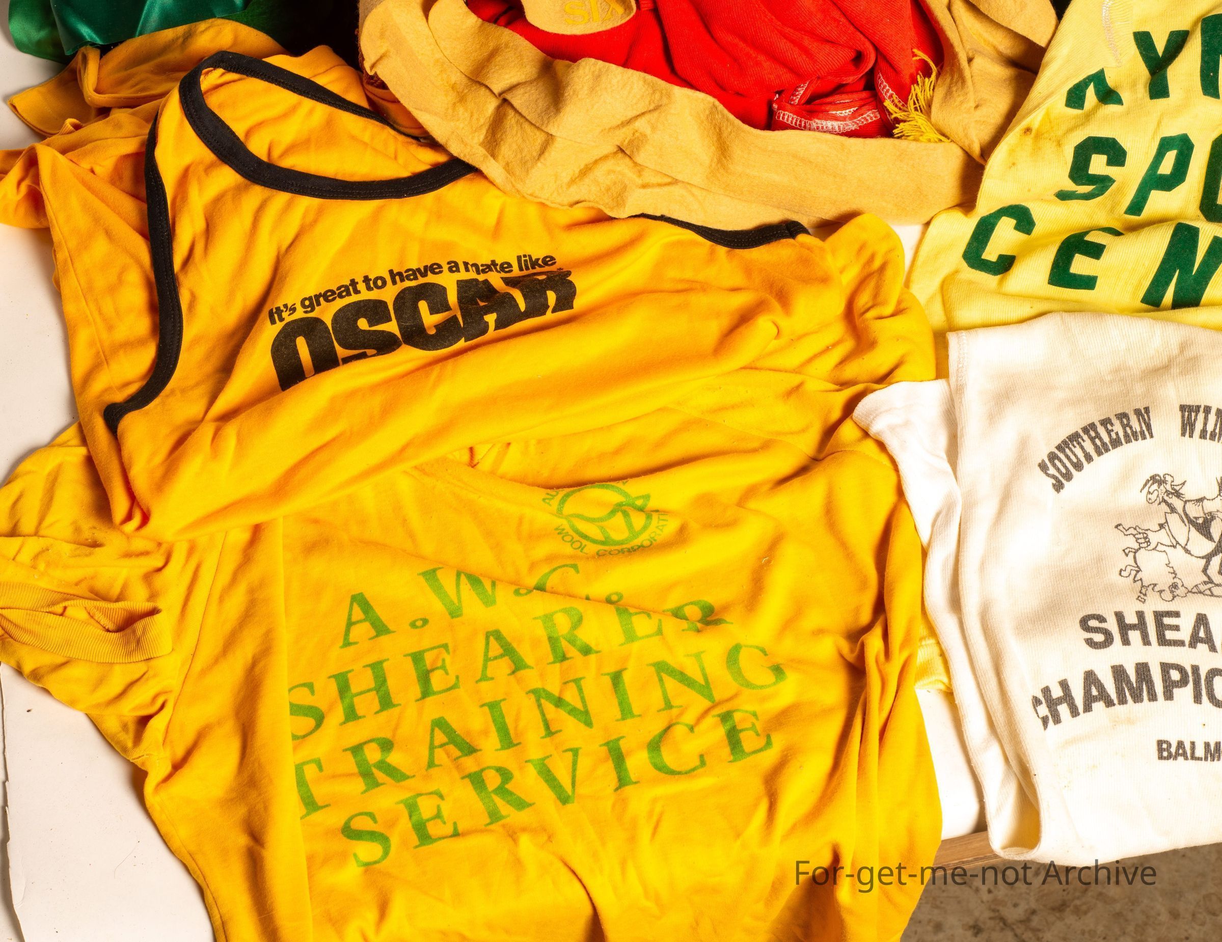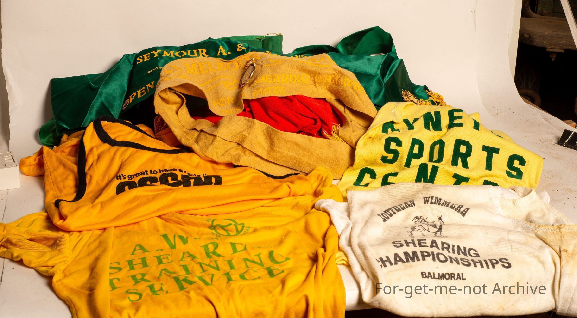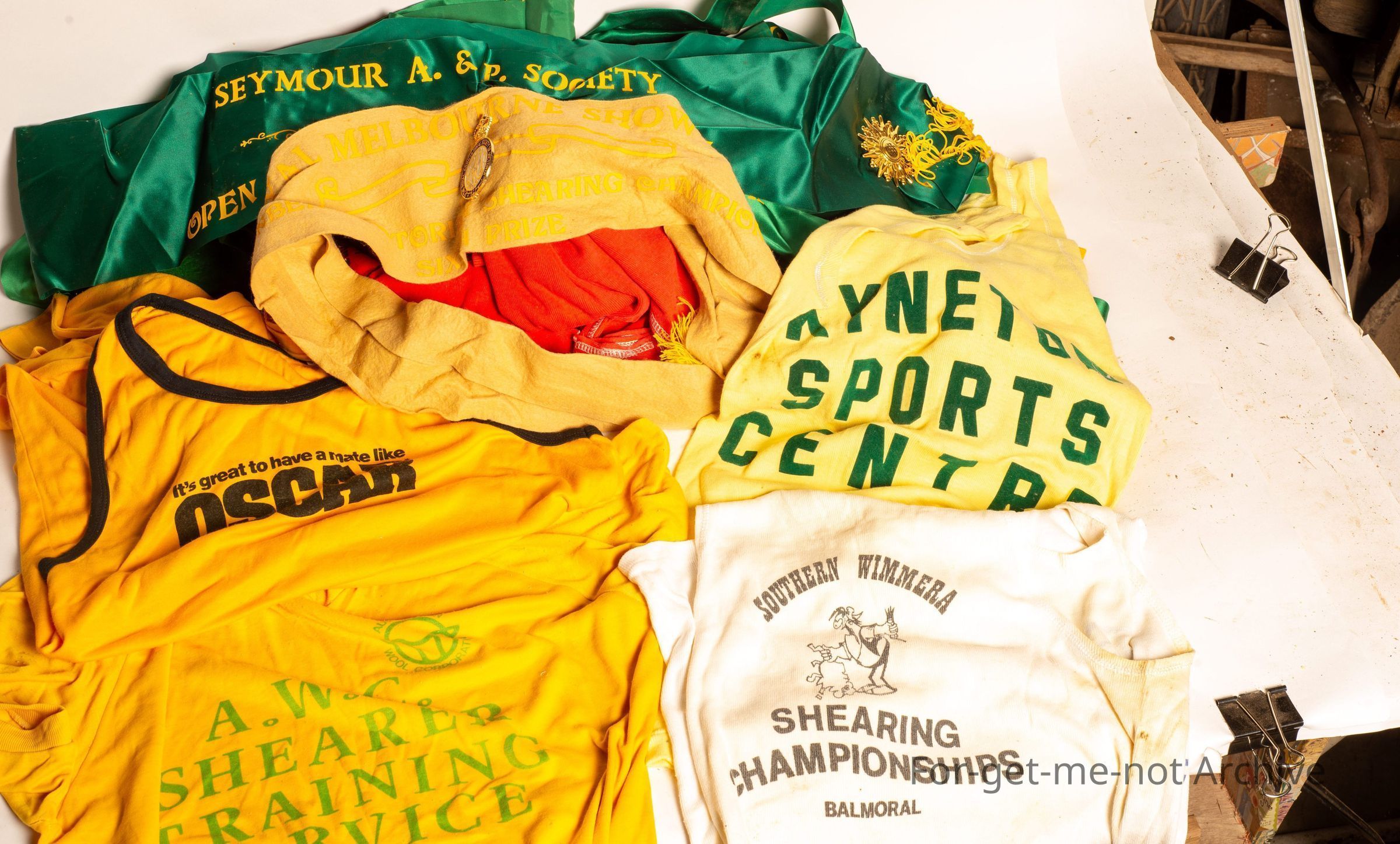 This is a bag full of shearing ribbons, shearing singlets, Australian Wool Corporation Shearing Instructor singlets, all related to the wool industry, sheep industry and shearing industry,Collection