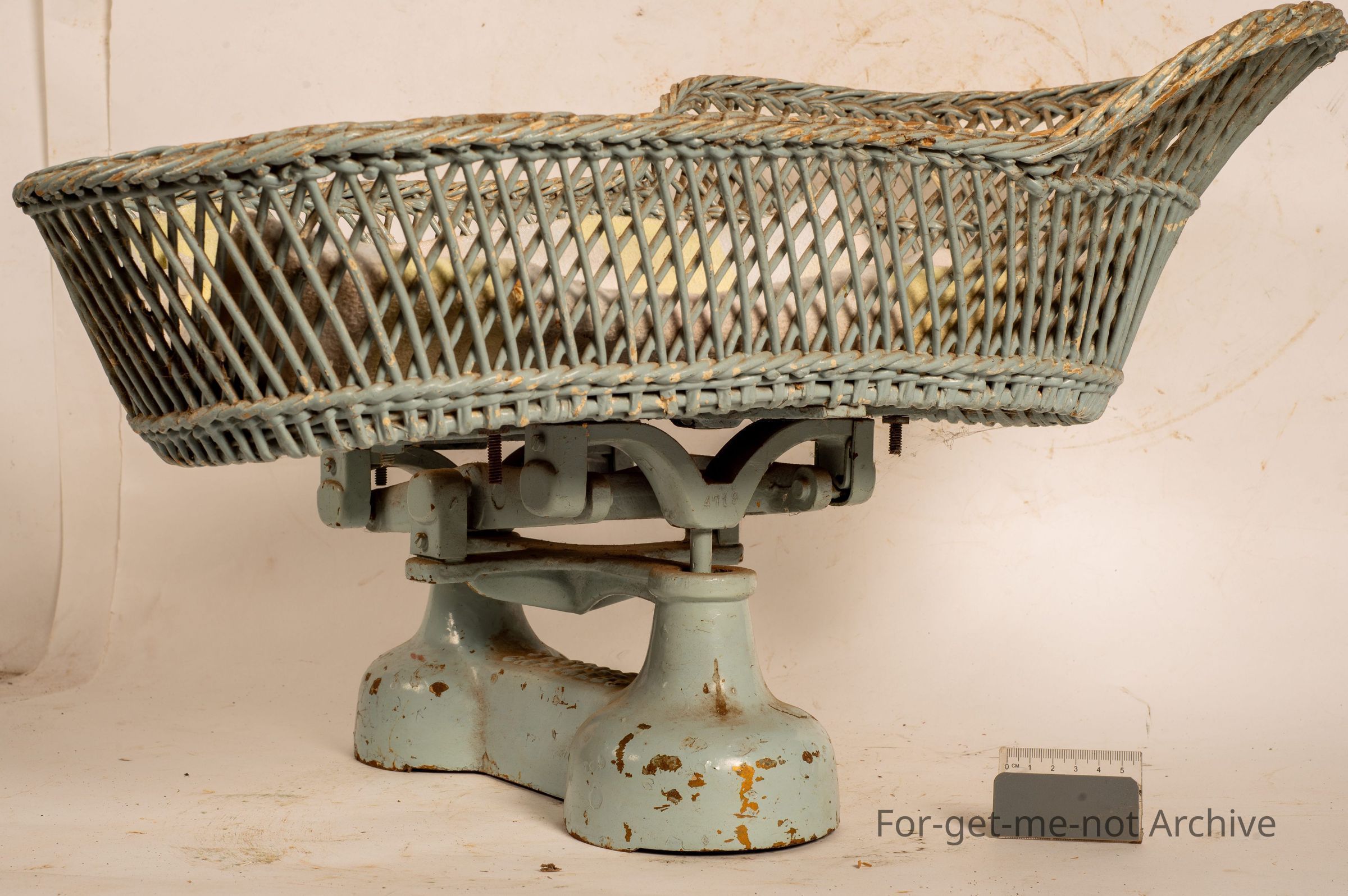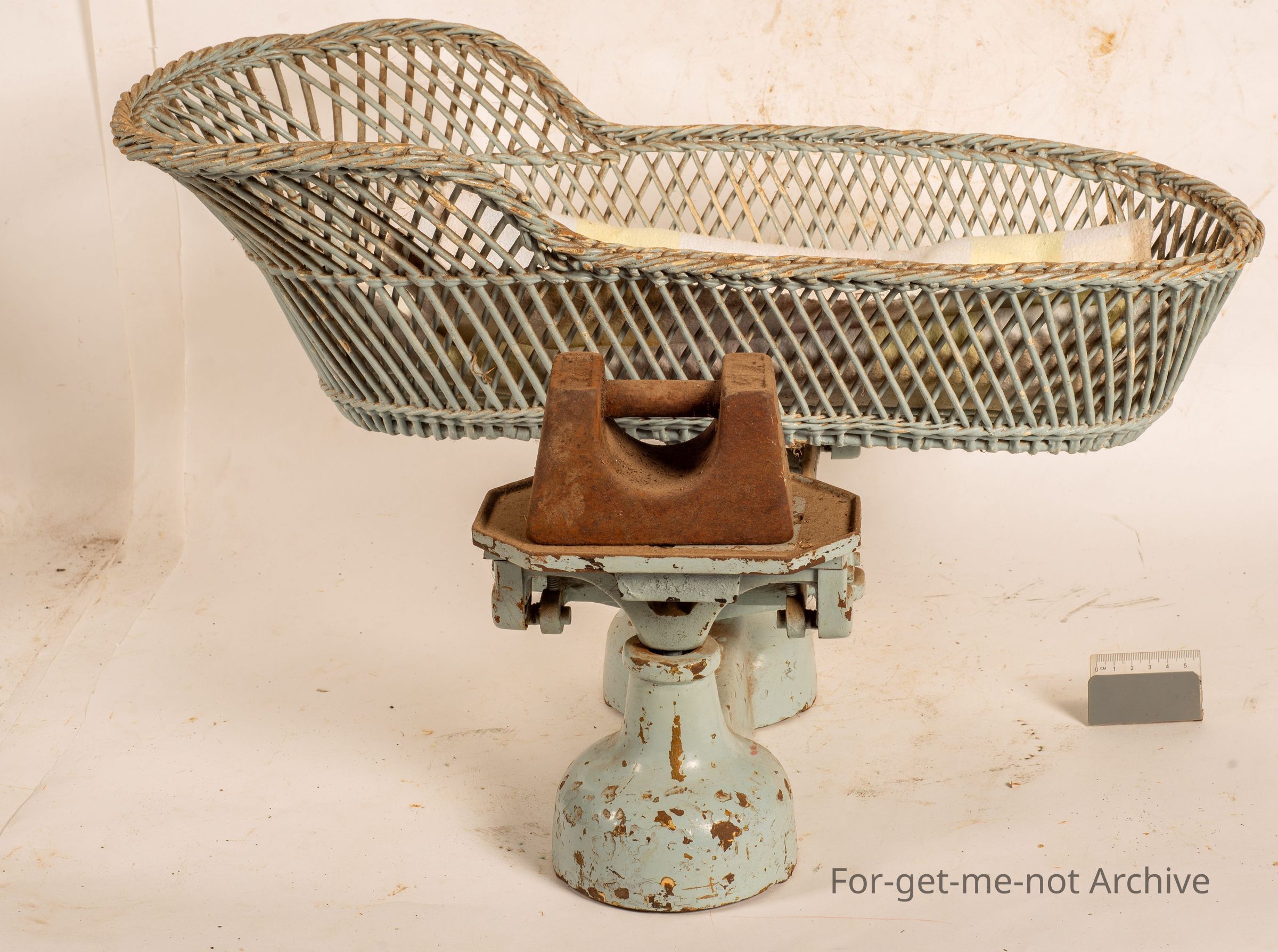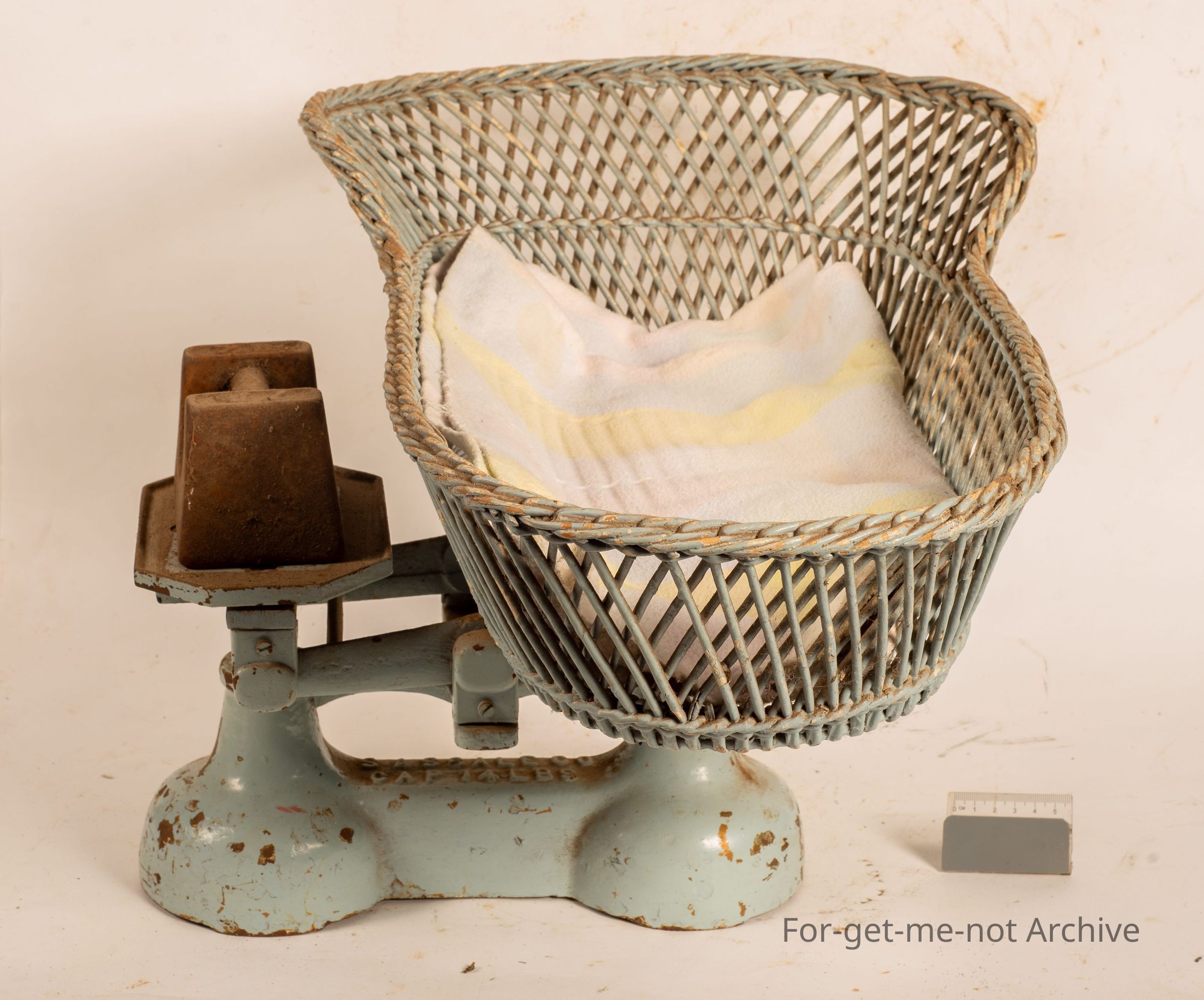 This is a set of very early baby scales. Alison McBean from Currick Used these scales to weigh all her own children, when they were very young. Perfect working condition. Take a very accurate, weight. A woven cane basket, lovely piece. Still in the book with all the weights. I think I still got that book somewhere. These scales are made by SA Scales with a capacity weight of 14lb. Quite a large baby.Collection