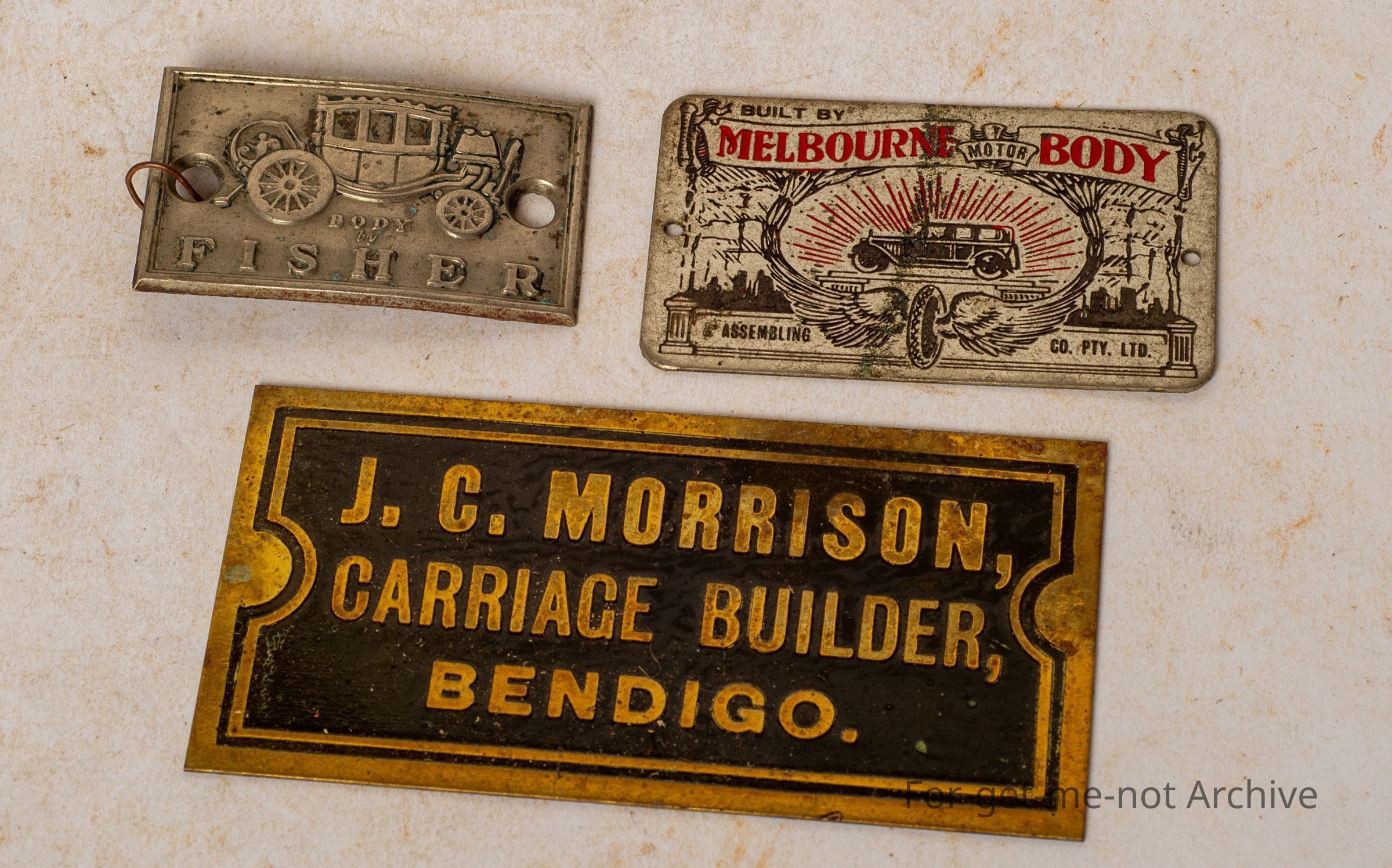 Three more little sections, pieces. 1, JC Morrison, Carriage Builder Bendigo. 2nd one, Fisher's Bodywork, possibly very old with a carriage image. The third one built by Melbourne Motor Body Builders, with a 19 thirties looking square car. Marvelous piecesCollection