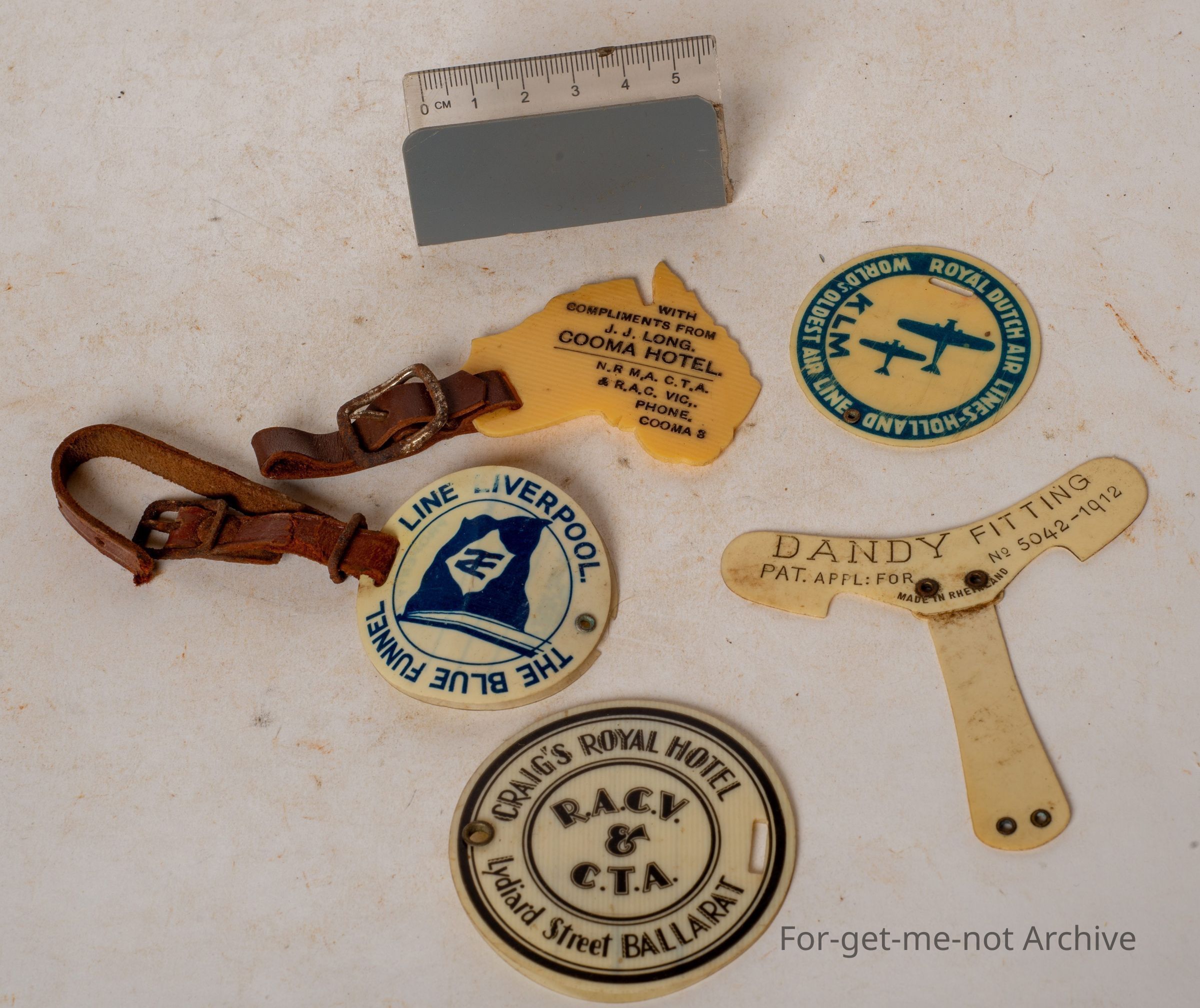 This is a group of little plastic pieces. First one, Dandy Fittings, 1912, something to do with collars. The second one, a map of Australia with compliments from JJ Long Cooma Hotel. 3rd one, a baggage ticket from the blue funnel line Liverpool, with a flag with a h on us. The next one is, from Royal Dutch Airlines, the world's oldest airline, KLM. Last one, Craig's Royal Hotel, Lydiard Street, Ballarat, RACV, and CTA, Commercial Travelers Association. Wonderful group.Collection