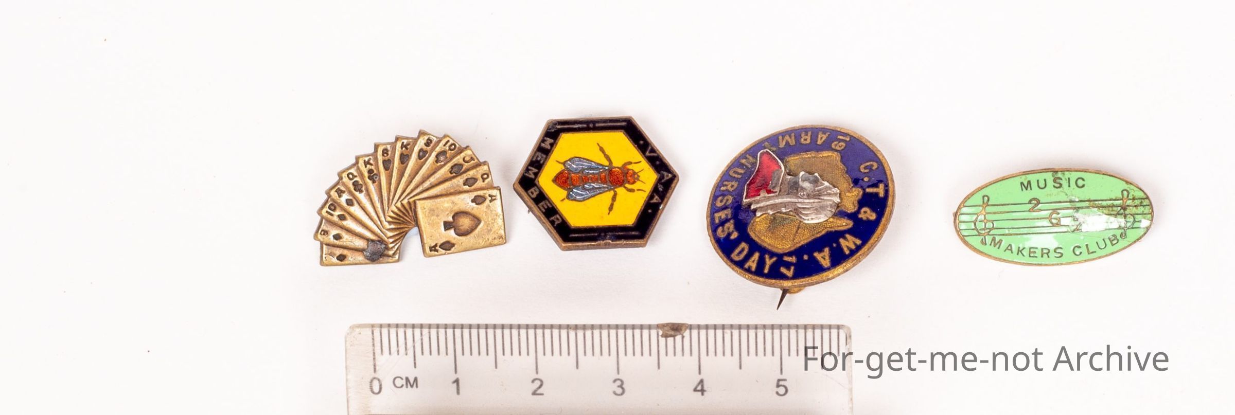 First one, Music makers Club, . 2nd one, V.A.A. member with a fly on the front of it or a bug of some sort. 3rd one, Army Nurses Day, C T and W A 1917. 4th 1, it's basically just, a pack of cards spread out, no name.Collection