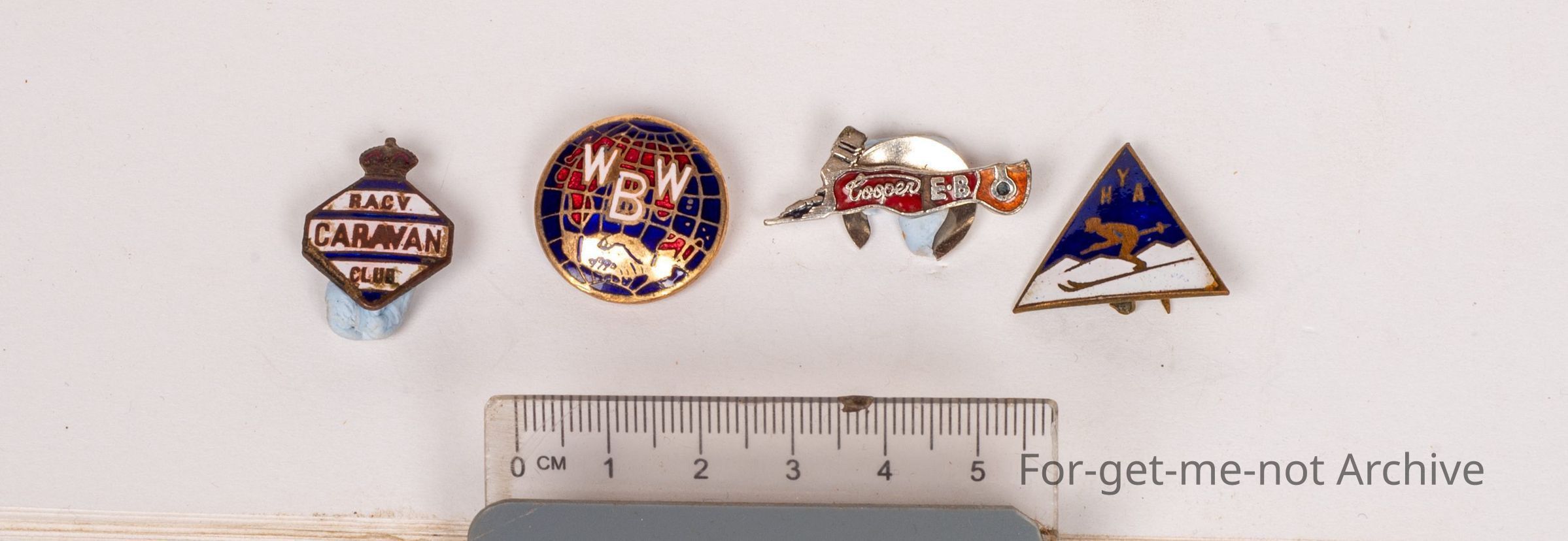 First one, YHA and a picture of a skier on it. Second one, Cooper EB and a picture of a shearing handpiece. Cooper handpiece. 3rd one, picture of the world globe, WWB The Wide World Brotherhood (WWB) was founded in 1949 by Horace Pitt-Kethley who at the time was editor of the The Wide World magazine. The WWB was a fraternal organisation for men and women “linked by a common bond of a love of travel and adventure” (Wide World magazine January 1956). To join the WWB cost 5/- (5 shillings), a once-off charge with no annual subscriptions thereafter and for which each new member received a welcoming letter from the editor, a certificate of membership and the enamel badge.