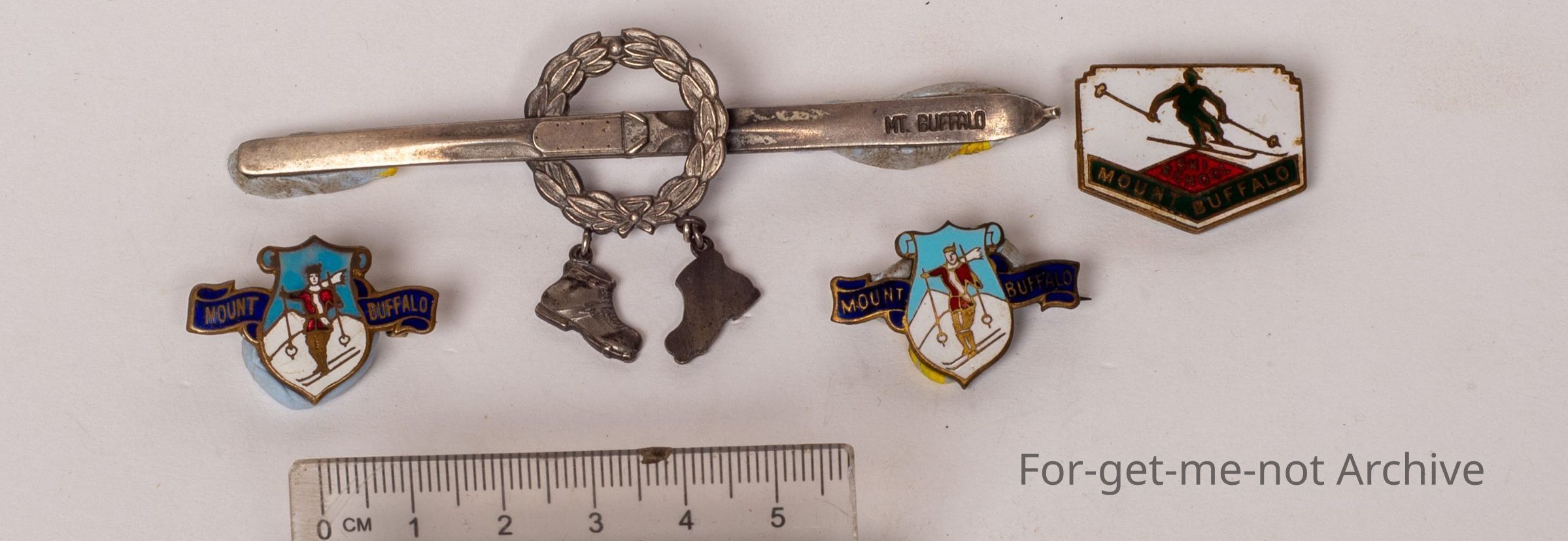 First one, Mount Buffalo Ski School. Second one is a very large ornate mount buffalo with a ski and a pair of boots hanging off it. 3rd one is also a mount buffalo, a picture of a skier, and the 4th one, Mount Buffalo, a picture of a skierCollection
