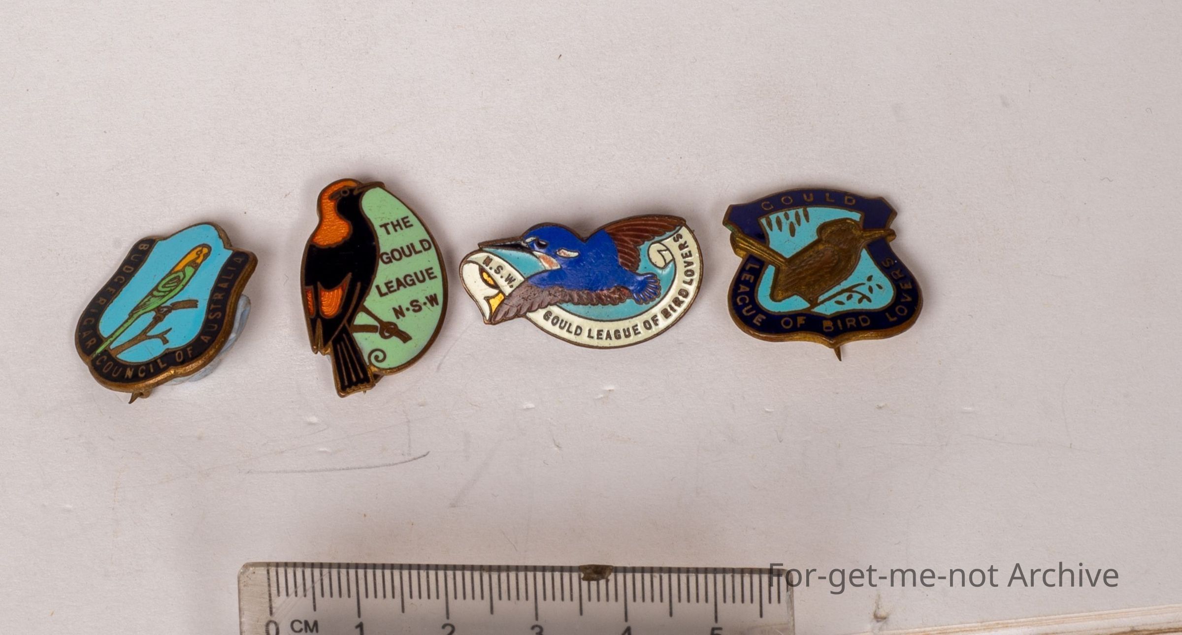 The Gould League New South Wales, first one. 2nd one, Gould League of bird lovers New South Wales with 1937 on the back. The first one had 1938 on the back of it. And the next one is the Gould League of bird lovers 19 oh, this is 5078. So that could even be a number, not a date. And the last one is Budgerigar Council of Australia.Collection
