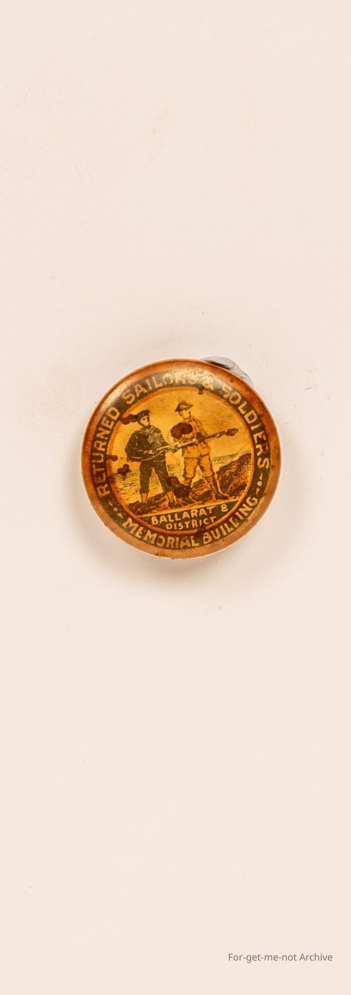Badge, returned soldiers and sailors. Memorial building, Ballarat District, image of sailor and soldier. Very old badge, not in bad nick.