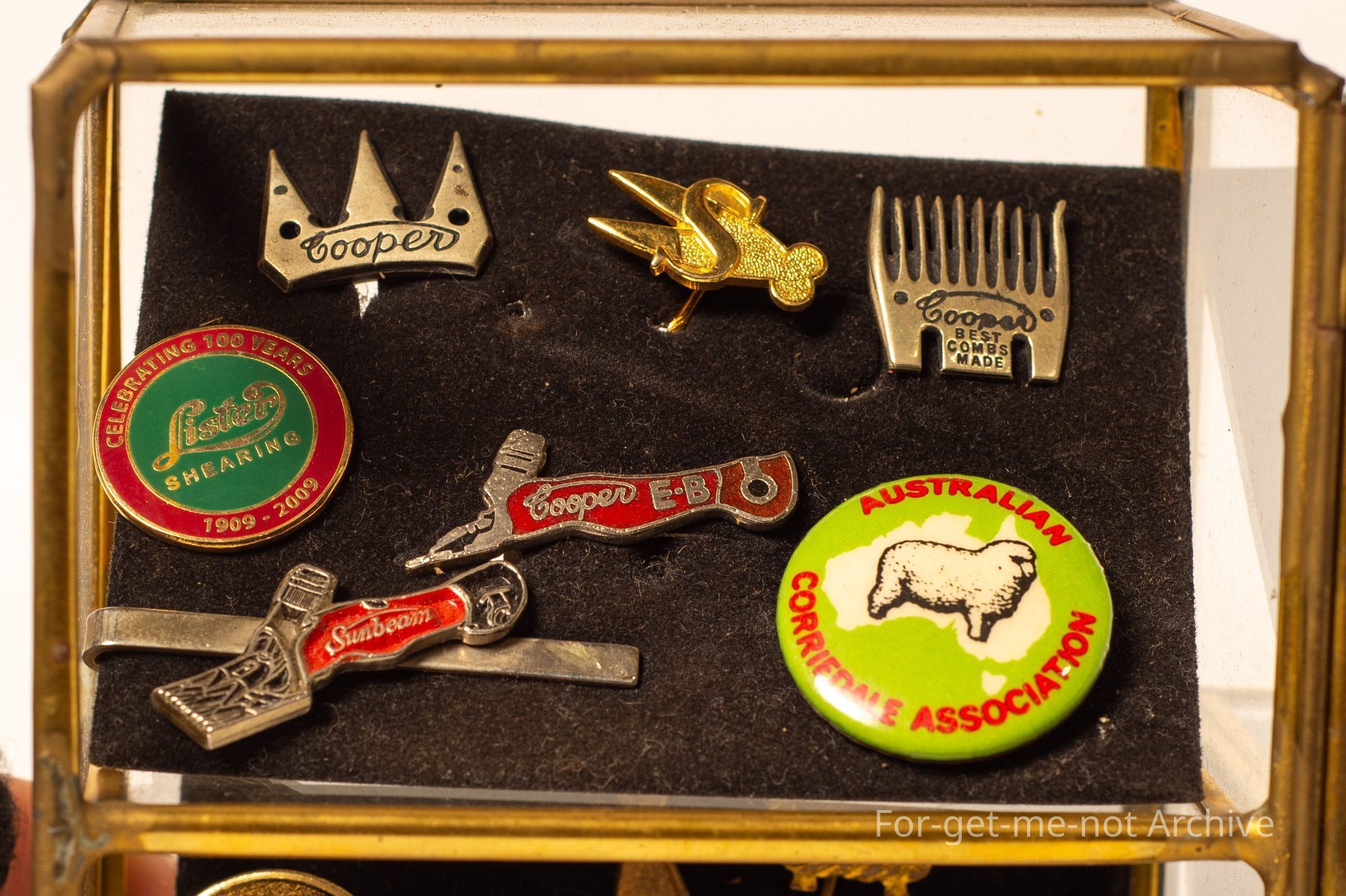 Is a very small, display unit. These are all badges, to do with the shearing and sheep industry. The Cooper cutout badge, the Cooper comb badge, the 2 Cooper tie pin badges, the Lister Shearing, Centenary badge, hard to find. 1, 2, 3, 4, 4, 6, 7, 8, 9, 10, 11, 4, 13. These would be worth the complete lot.Collection