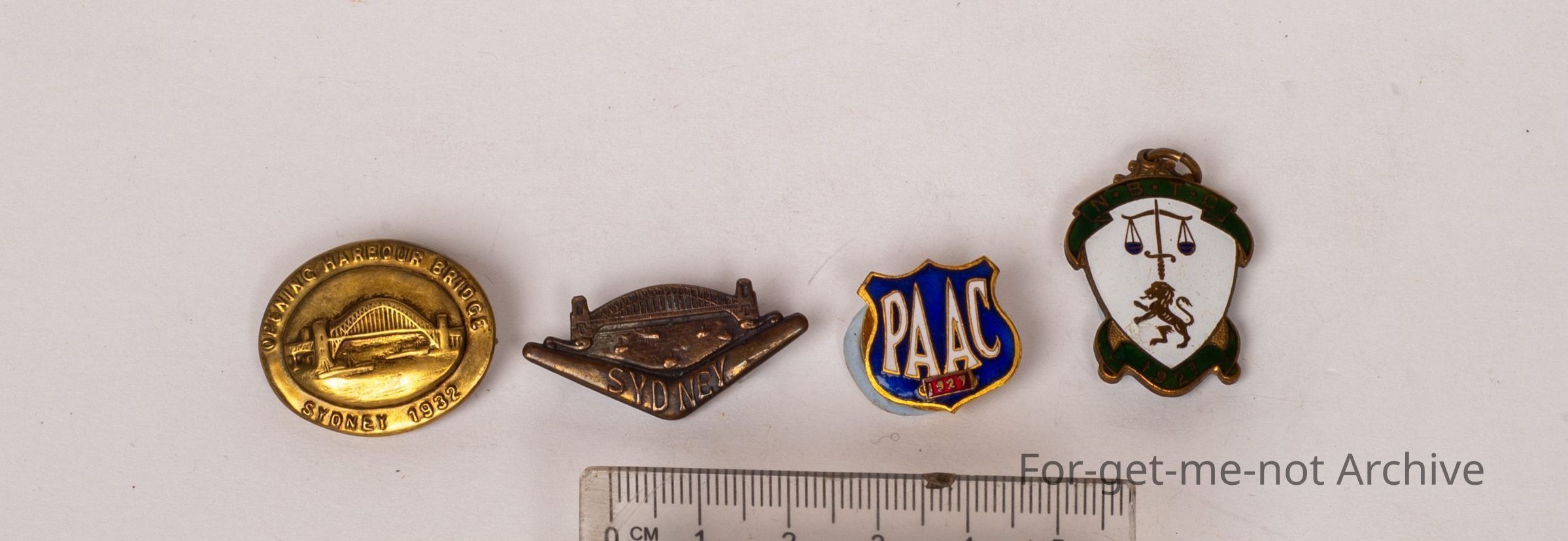 1st. Badge PAAC, 1927, 2nd one, NBTC, 1927. 3rd one, Sydney with a picture of the Harbour Bridge, or the last one with the Harbour Bridge. 3rd one, 4th one, opening Harbour Bridge, Sydney, 1932.Collection