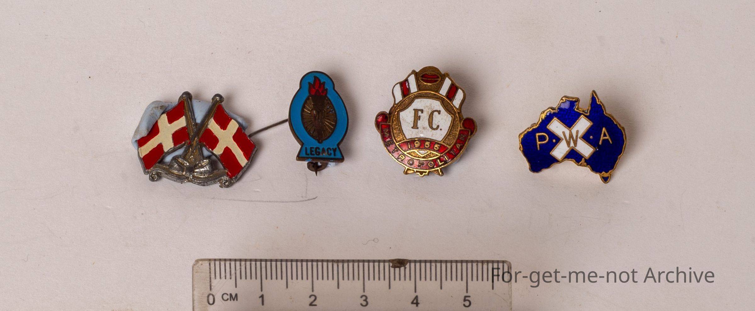 First one, PWA, which has got a white cross on a map of Australia. Second one, Metropolitan FC Football Club 1955. Looks like a soccer one. 3rd 1, 2 flags, red background, white cross, no name. 4th 1, legacy badge.Collection
