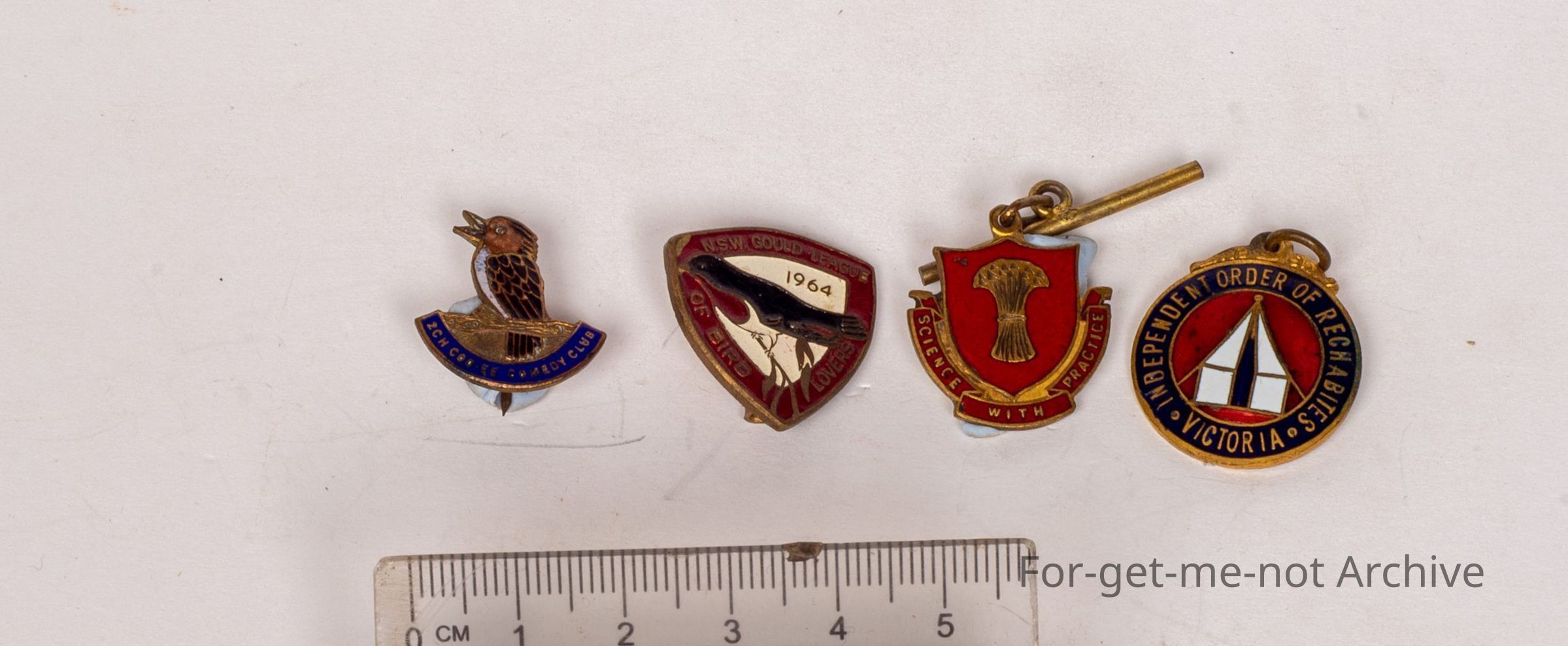 2 CH Coo-ee comedy club with a picture of a with a kookaburra on it. 2nd one, Independence Order of Rechabites Victoria; And that's got something written on the back. Looks like our masonic. N Raggart, December 1948. 3rd one, New South Wales Gould League 1964 of bird lovers. 1964. And the last one, science with practice, and a picture of a sheaf of grain .Collection