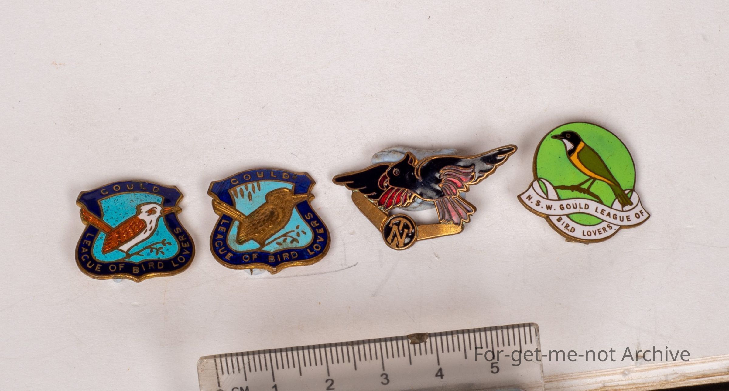 One's got NT on it and a black cockatoo with red feathers. 2nd one, Gould League of Bird Lovers in a kookaburra. 3rd one, Gould League of Bird Lovers in a kookaburra. 4th 1, New South Wales, Gould League of Bird LoversCollection