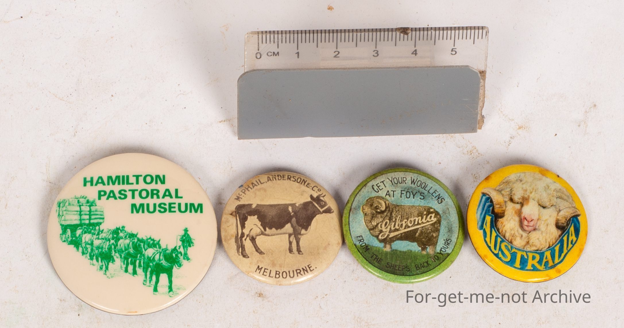 First one is to commemorate Hamilton Pastoral Museum. The next one is an advertising piece for Gibsonia Woollens, by Foys mills which is in Collingwood in Victoria. The next one is just a promotional thing for Australia with a merino ram and the first one is a badge made by Patrick Melbourne with a Friesian cow advertising McPhail and Anderson, Melbourne.Collection