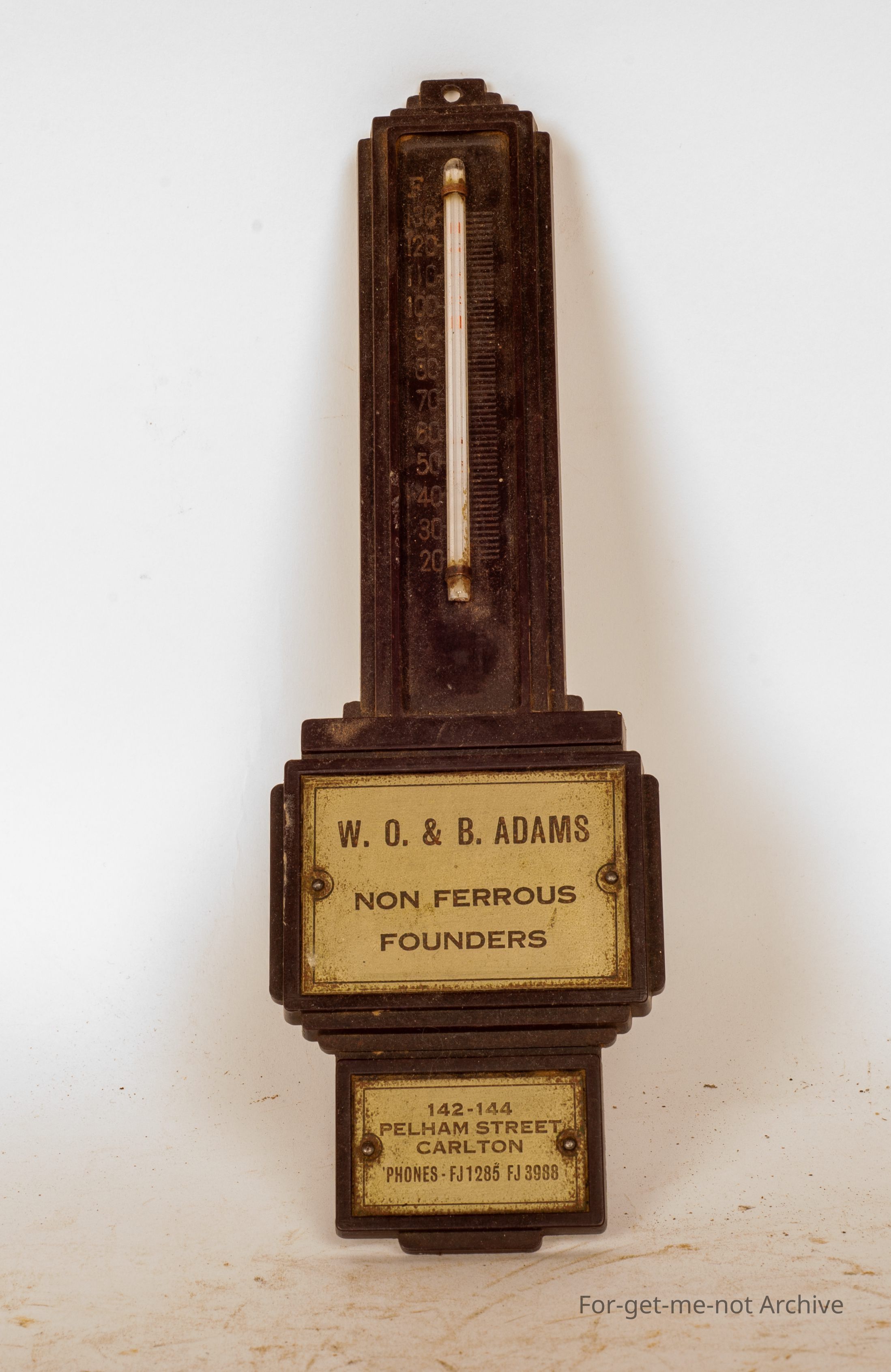 This is a piece from W O and B Adams Non Ferris Founders. Pelham Street, Carlton. Quite a nice little piece. A Bakelite frame with little metal plaques.