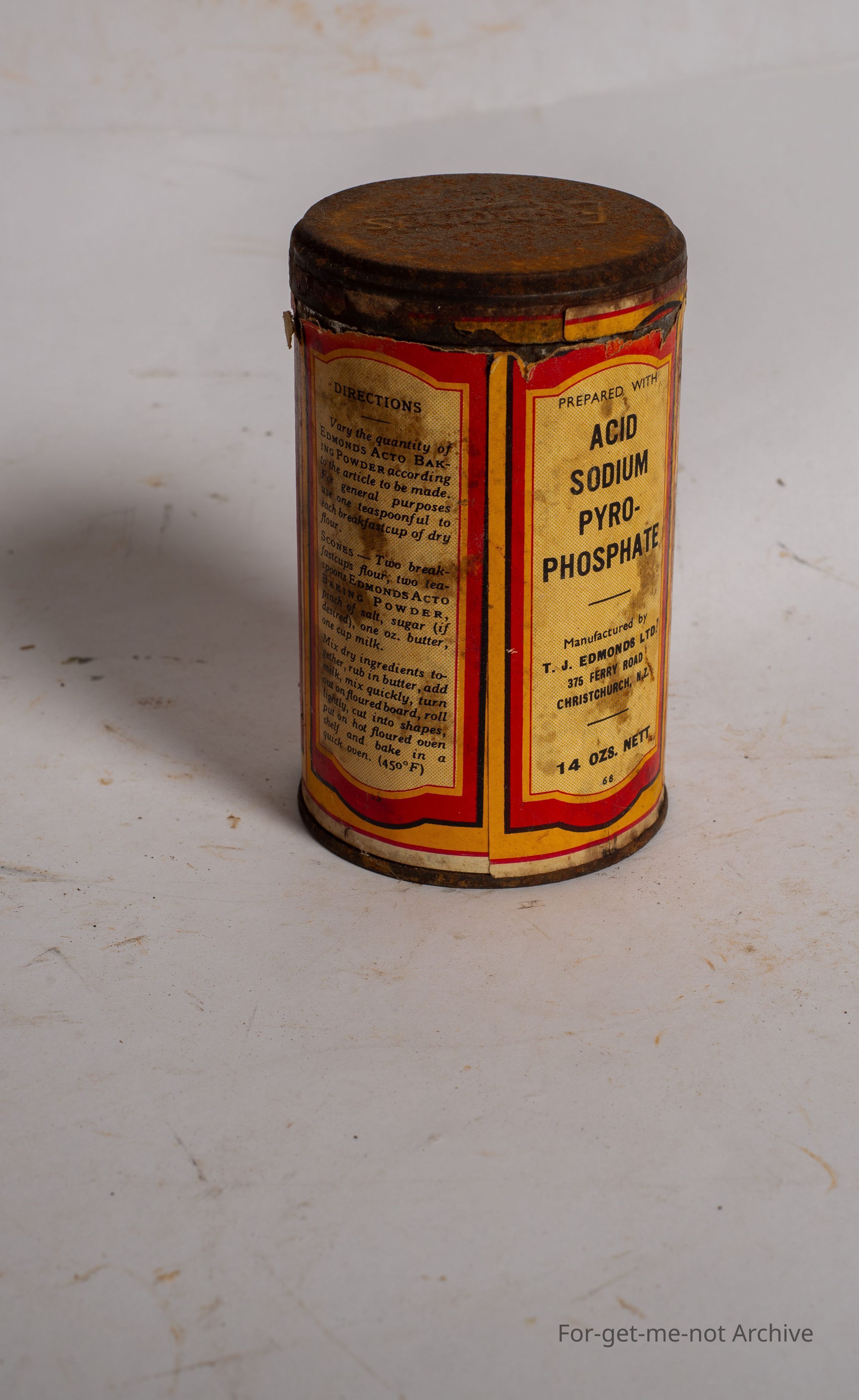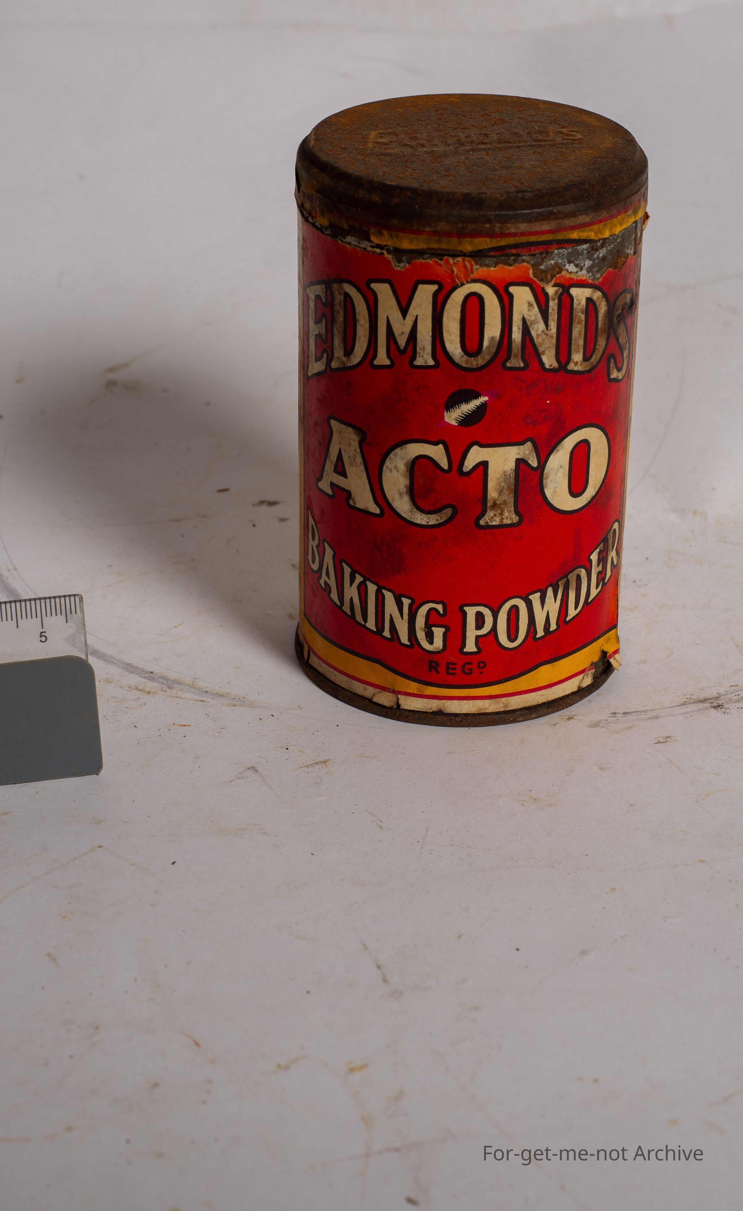 This is a tin of Edmonds Acto Baking Powder, paper label, not in good condition,
