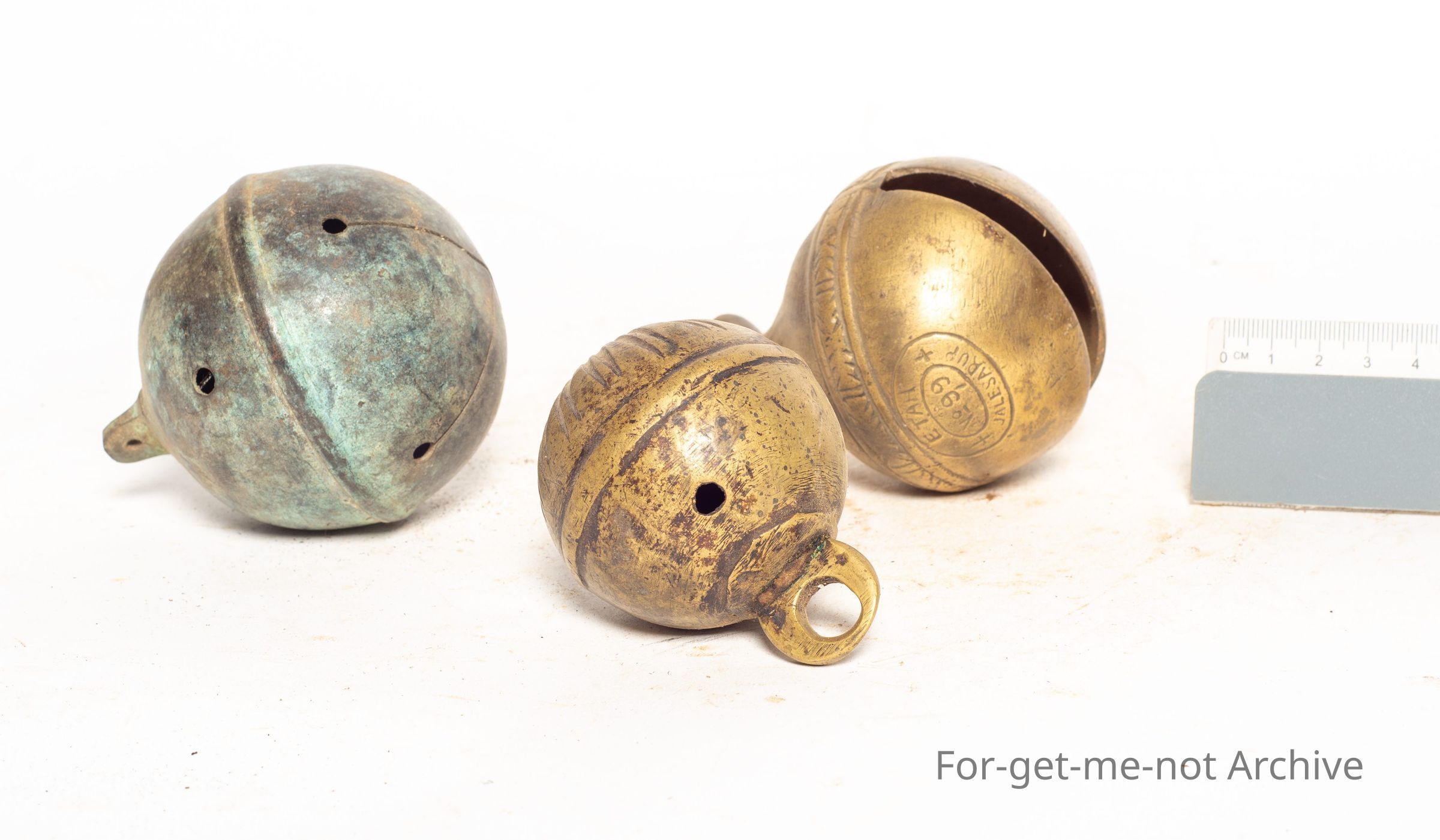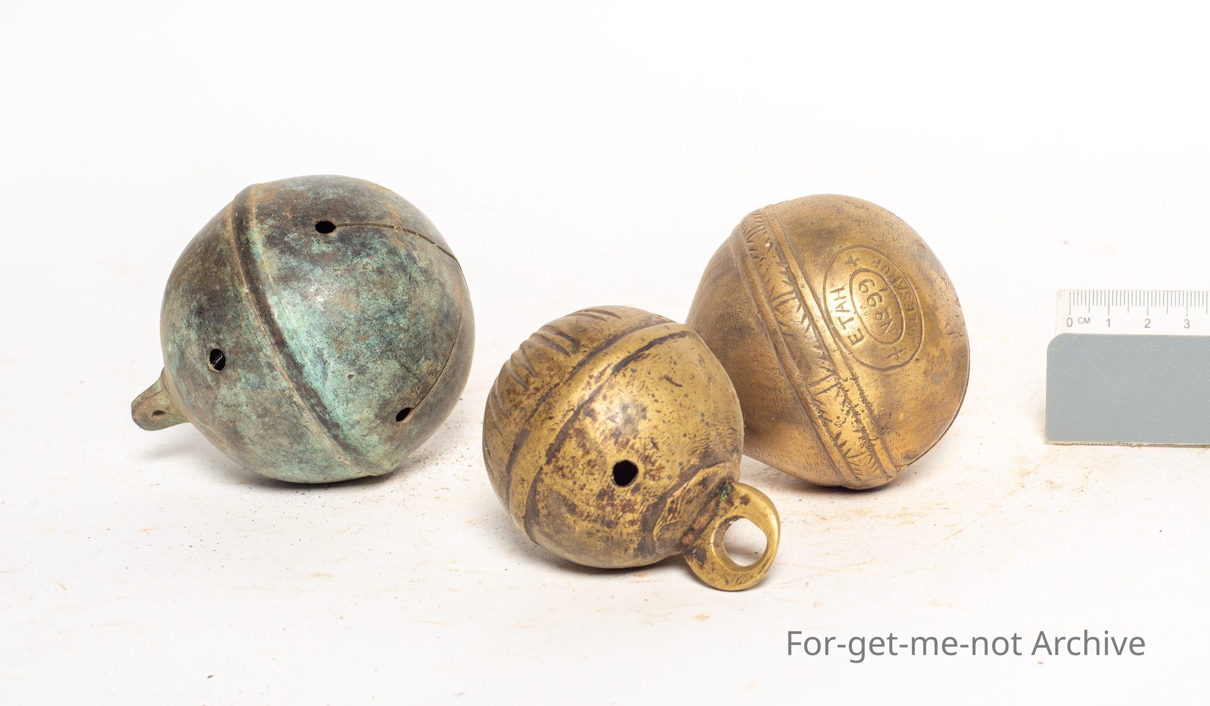 These are 3 brass circular ball bells. Probably all of Asian origin. One stamped ETAHR jails. These 3 bells are all in very good condition. Interesting pieces.