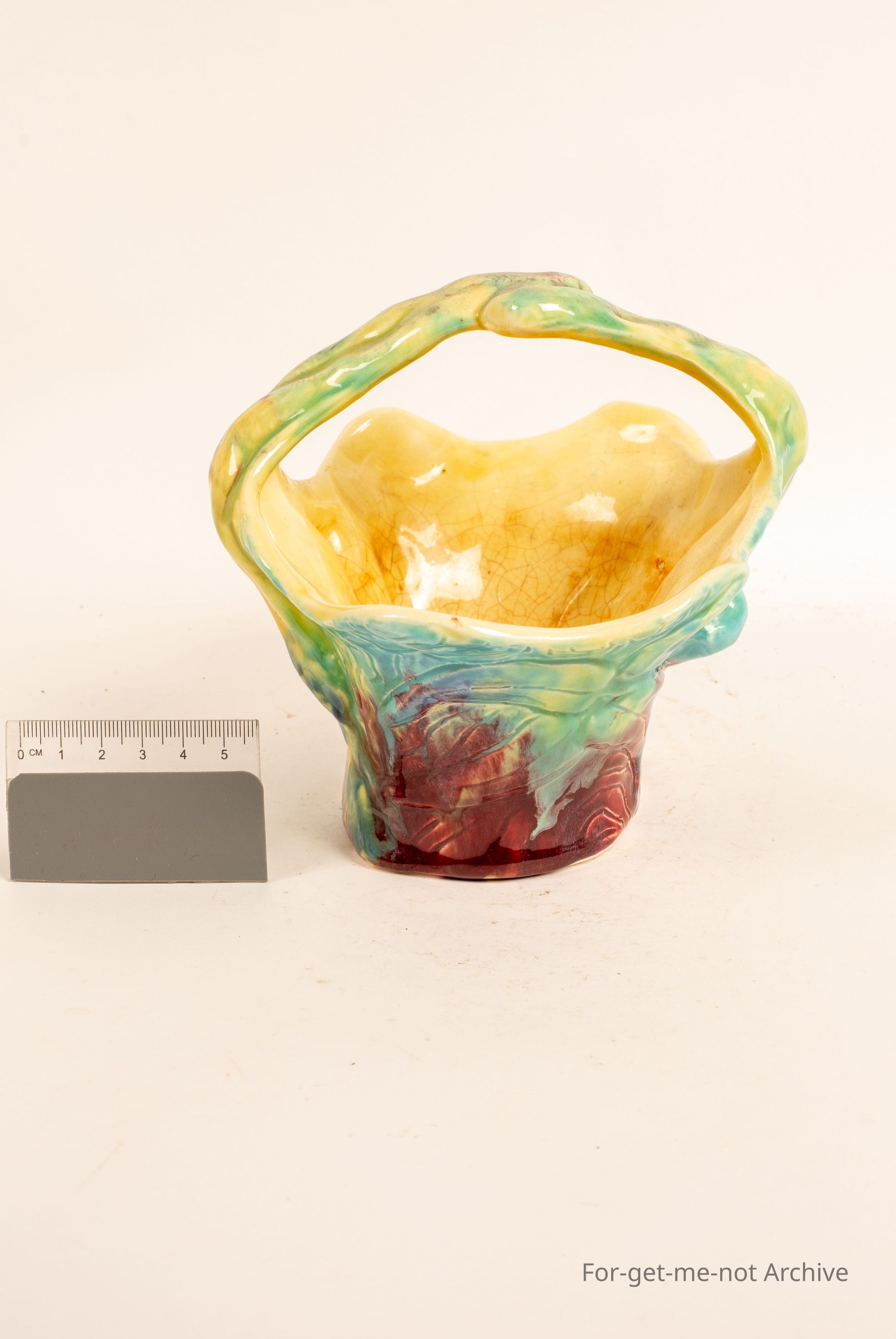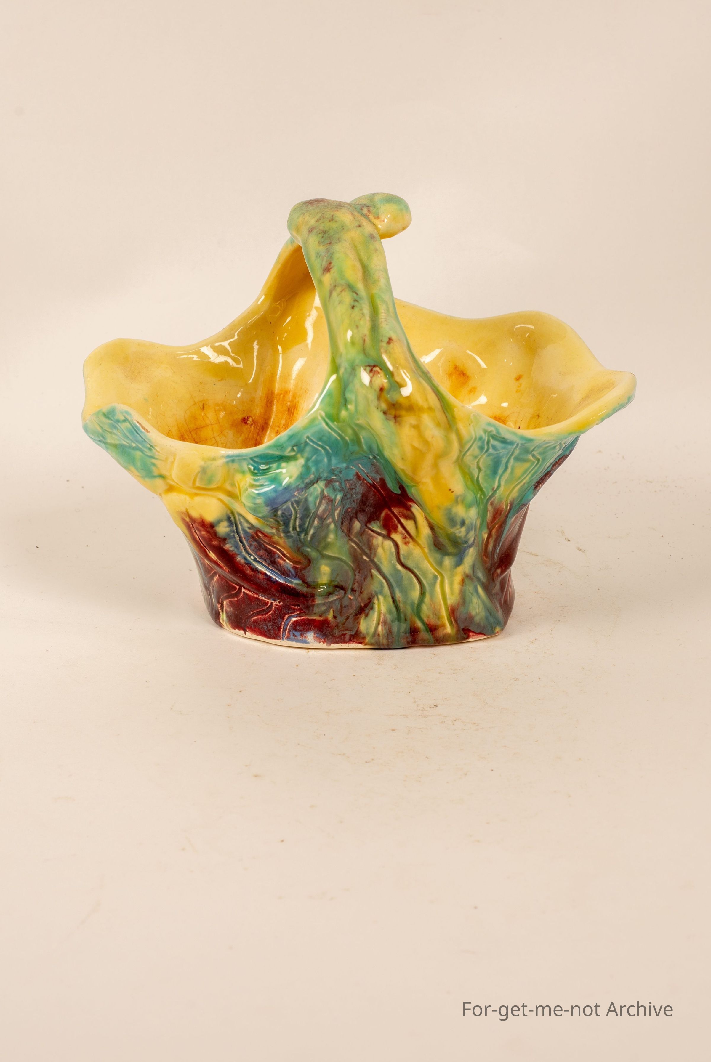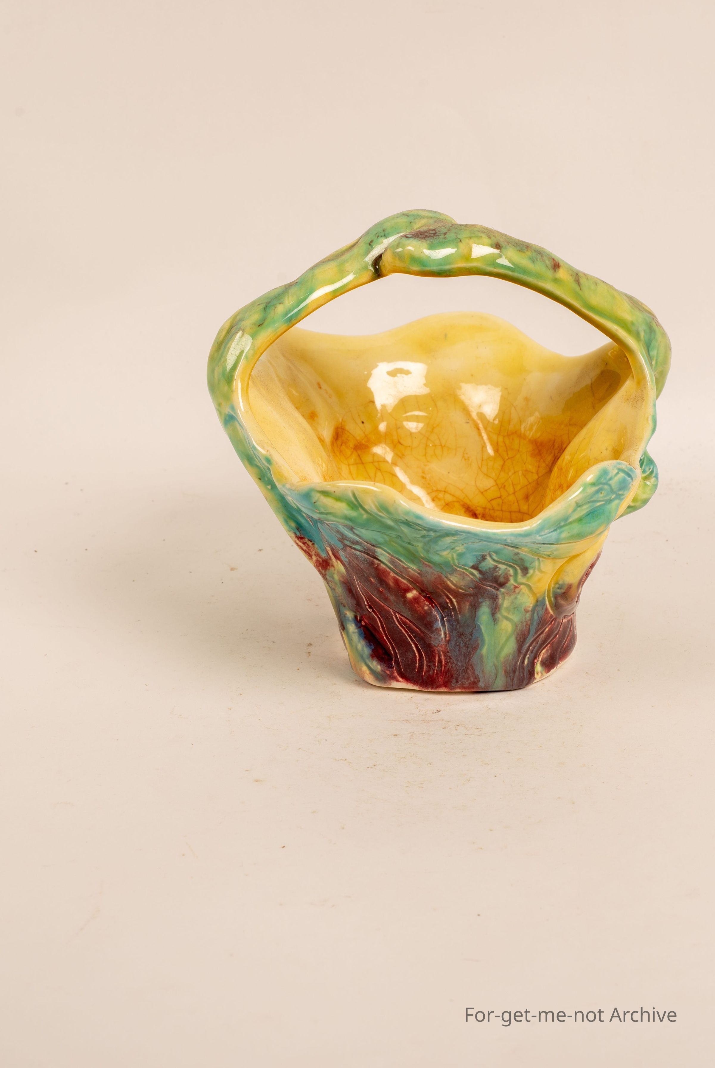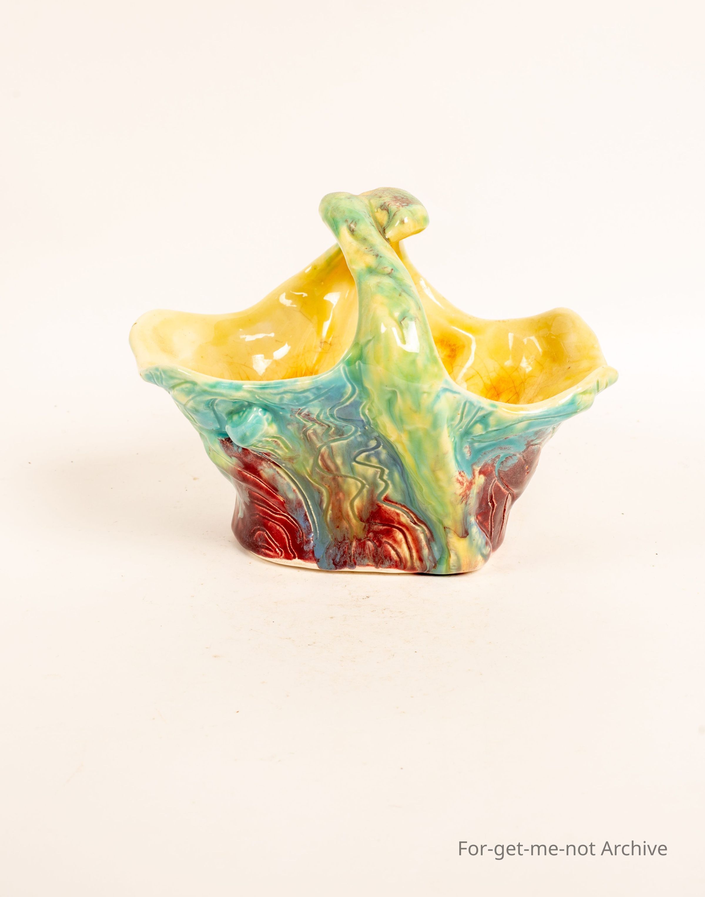 Studio pottery piece of basket with handle. Very creative, imaginative design with beautiful glazing, brought at Deepwater Queensland.