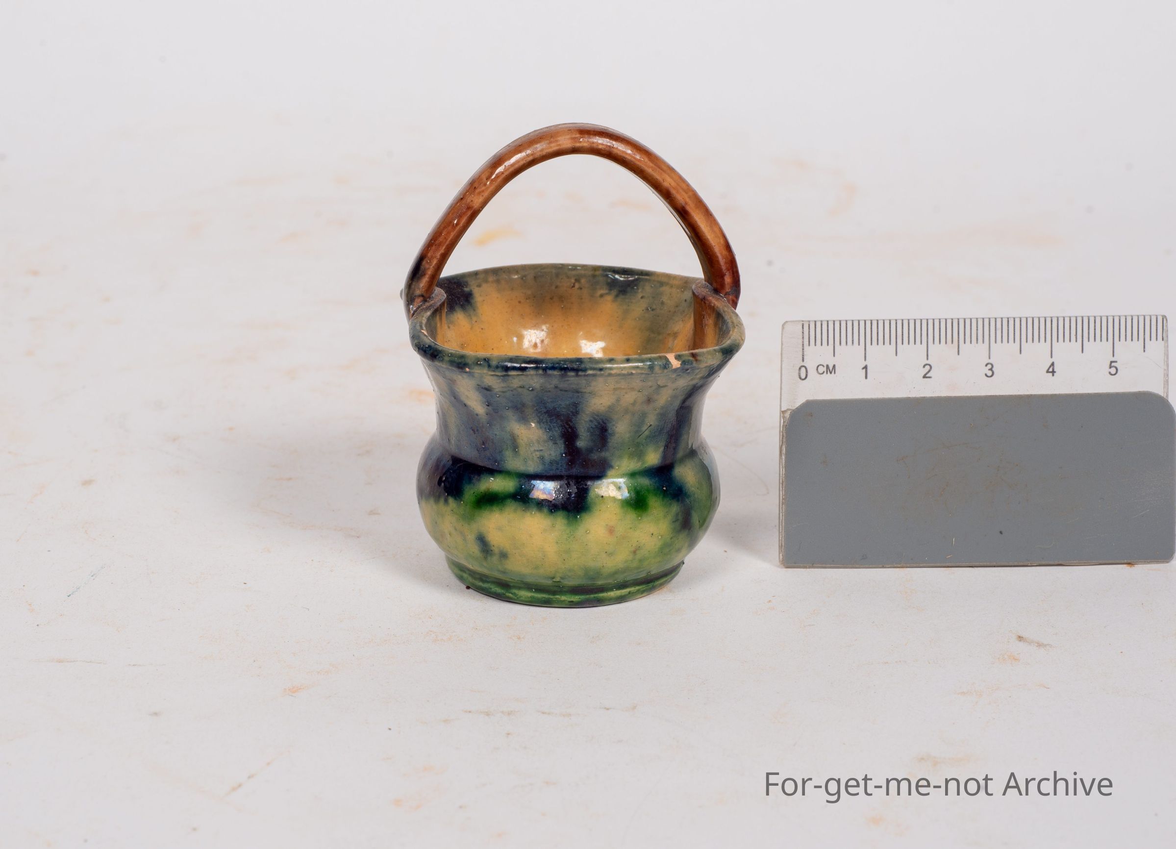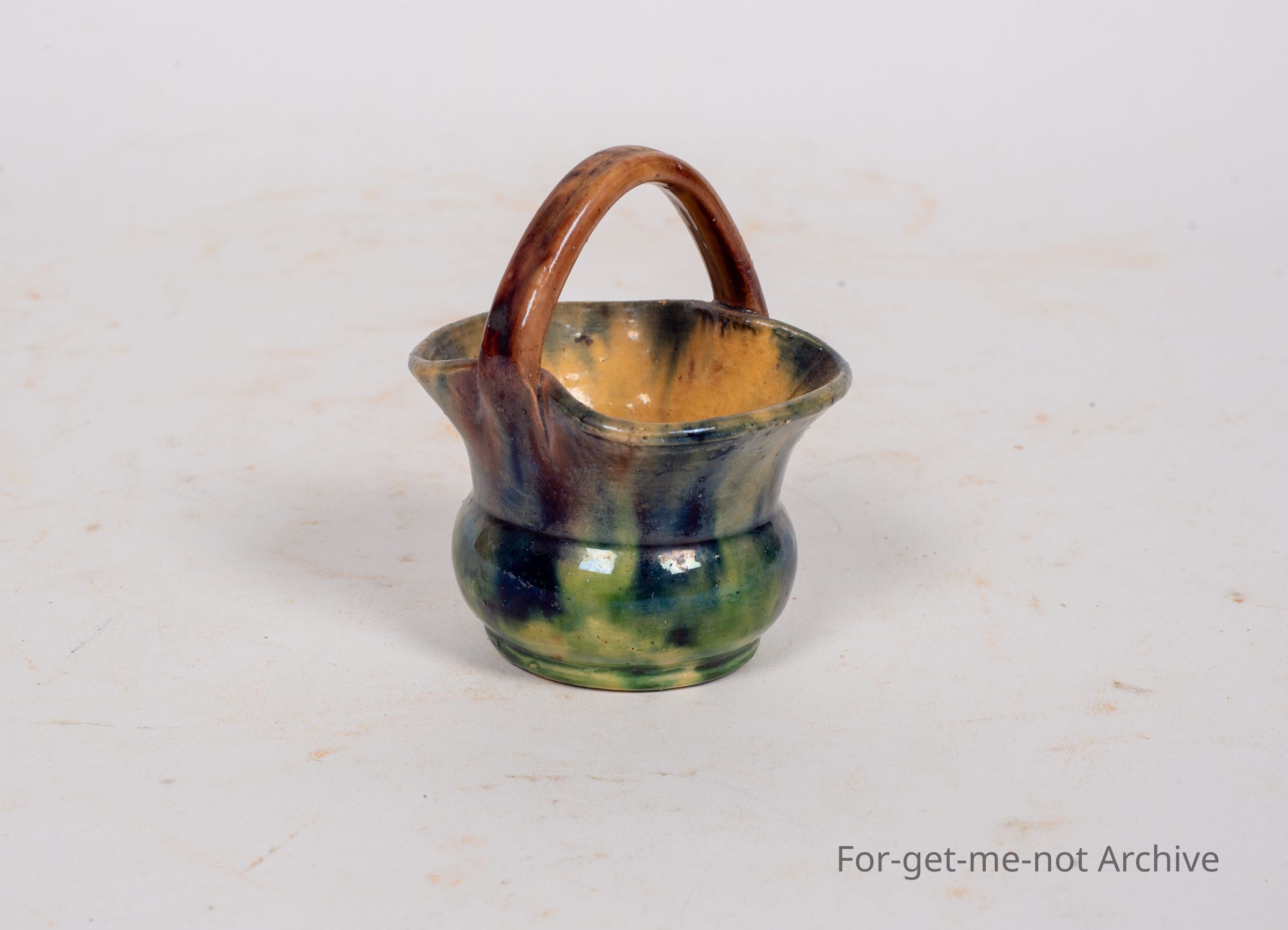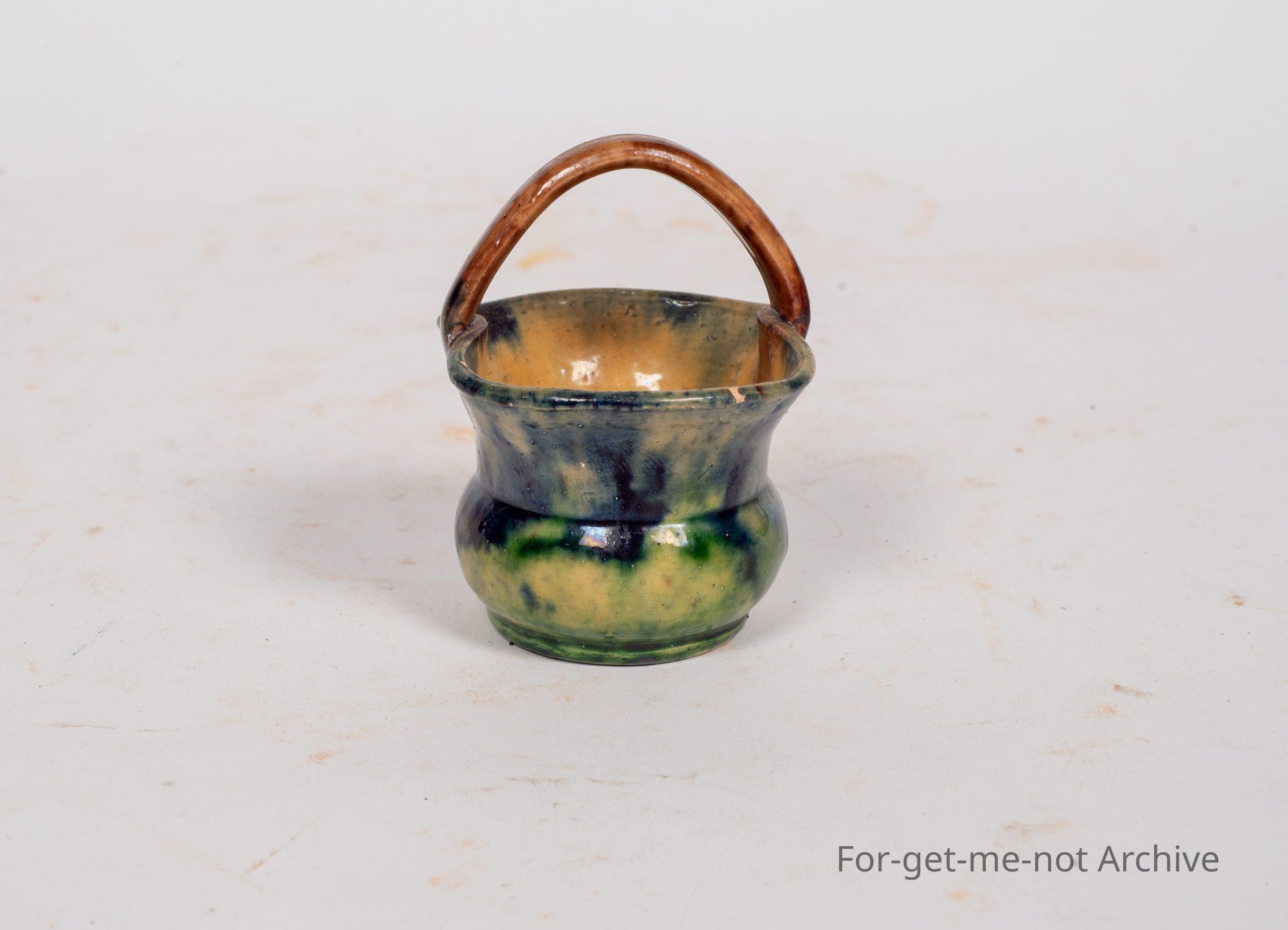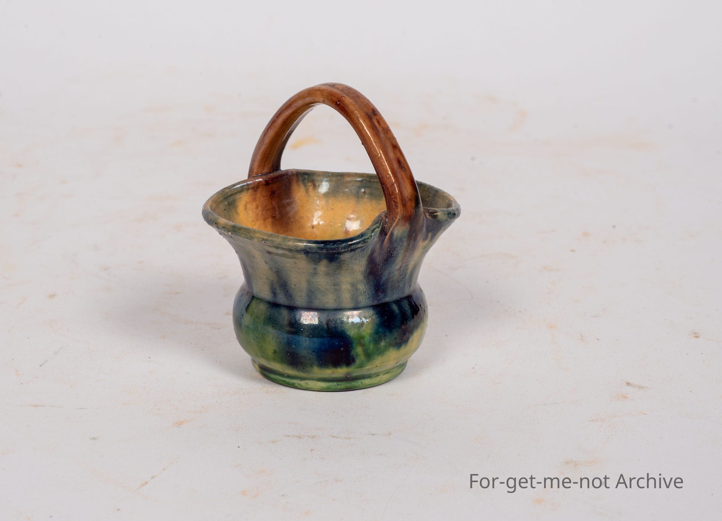 A small basket, ceramic, like a majolica glaze, no identification, but beautifully done,