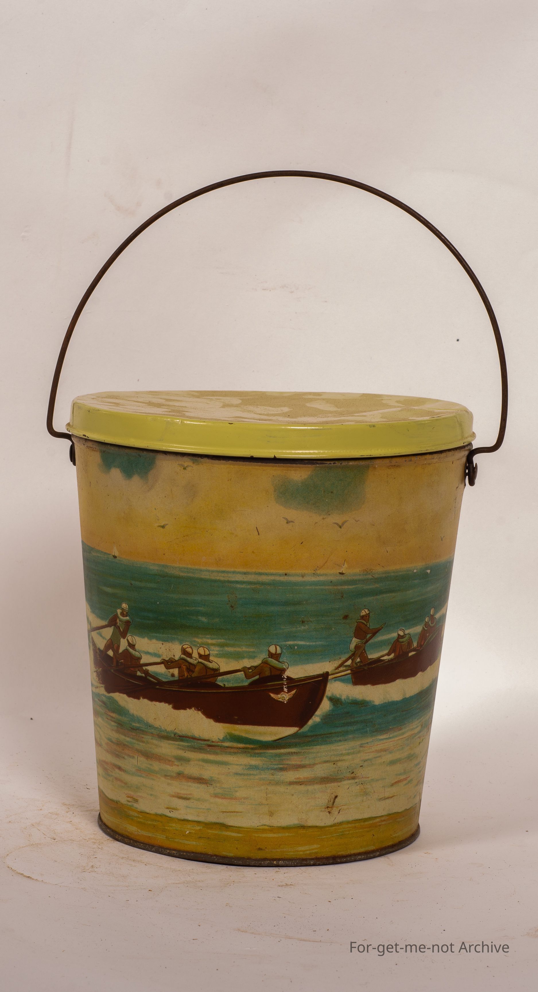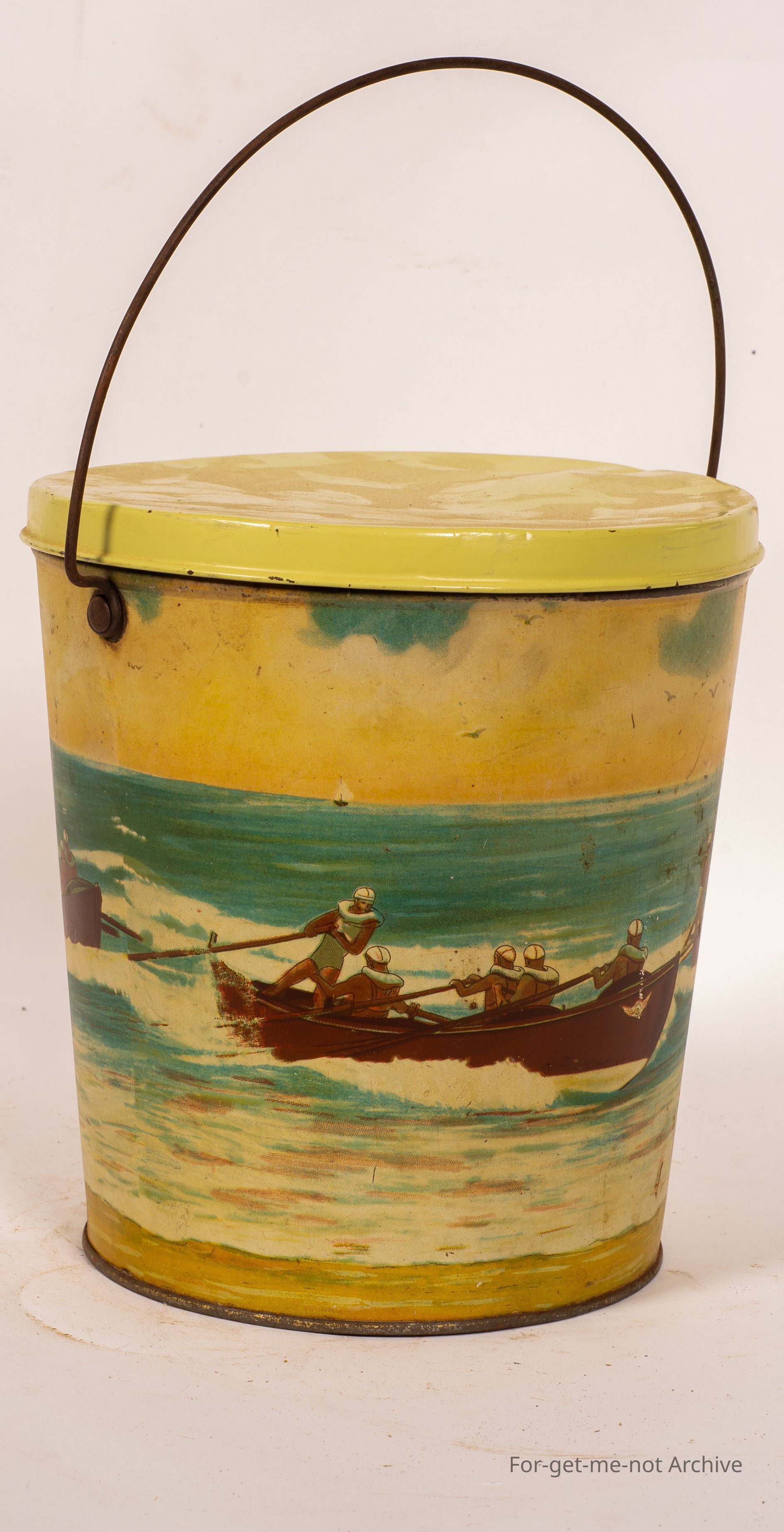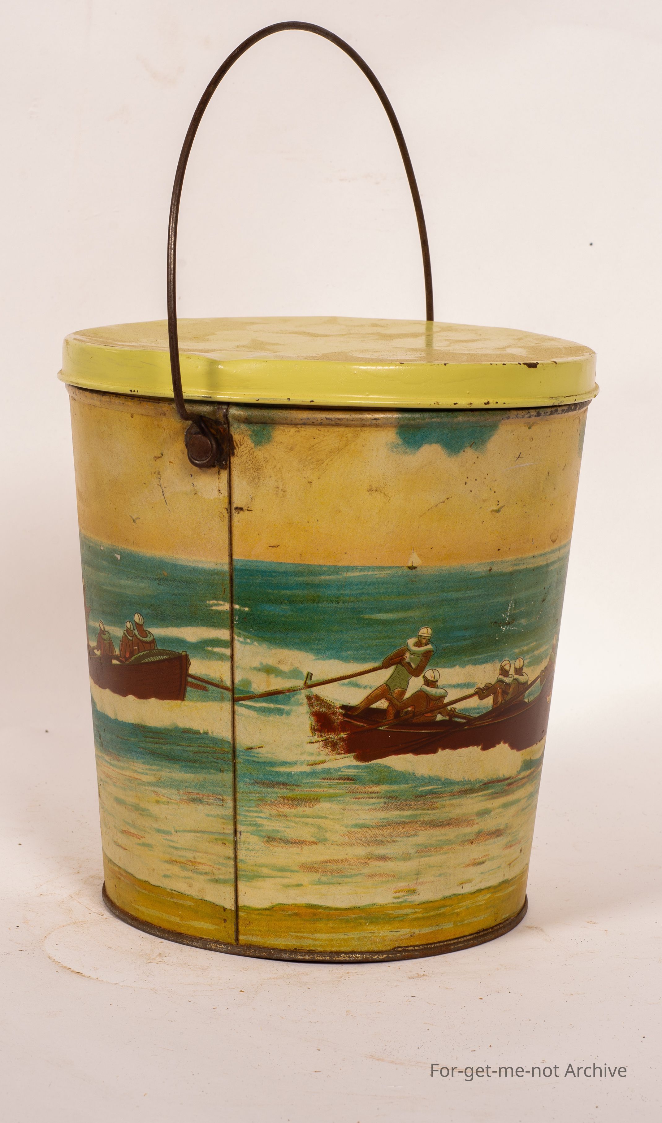 Is a tin beach bucket with handle. This bucket has the bucket is a team of lifesavers in a surf, rowing out in boats to do the lifesaving task, yachts in the background, few seagulls. This is a tin that's not commonly seen. Unfortunately, no name, brand or anything stamped into it. This tin is stamped from the tin maker Hughes Sydney. The tin has its original lidCollection