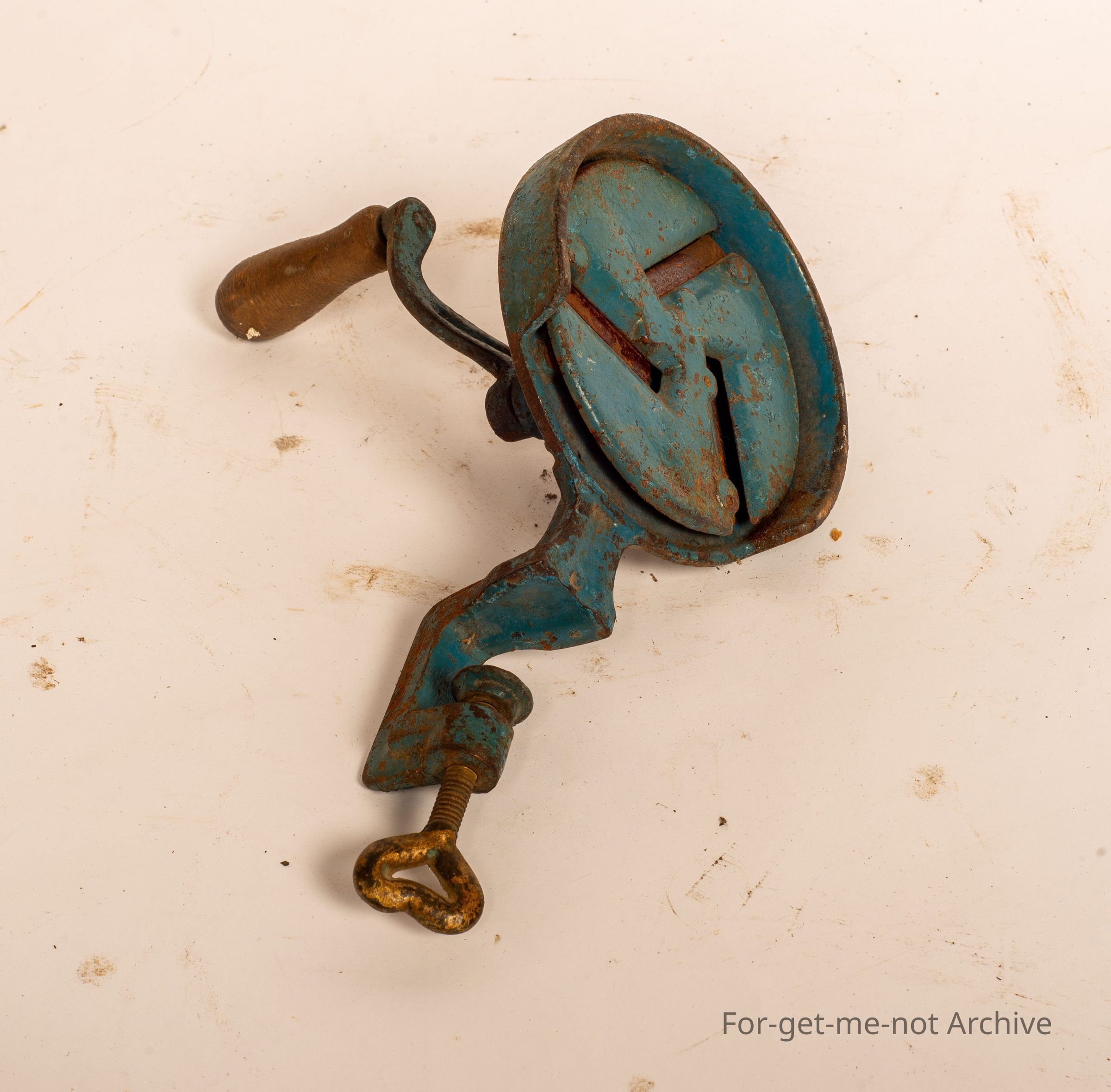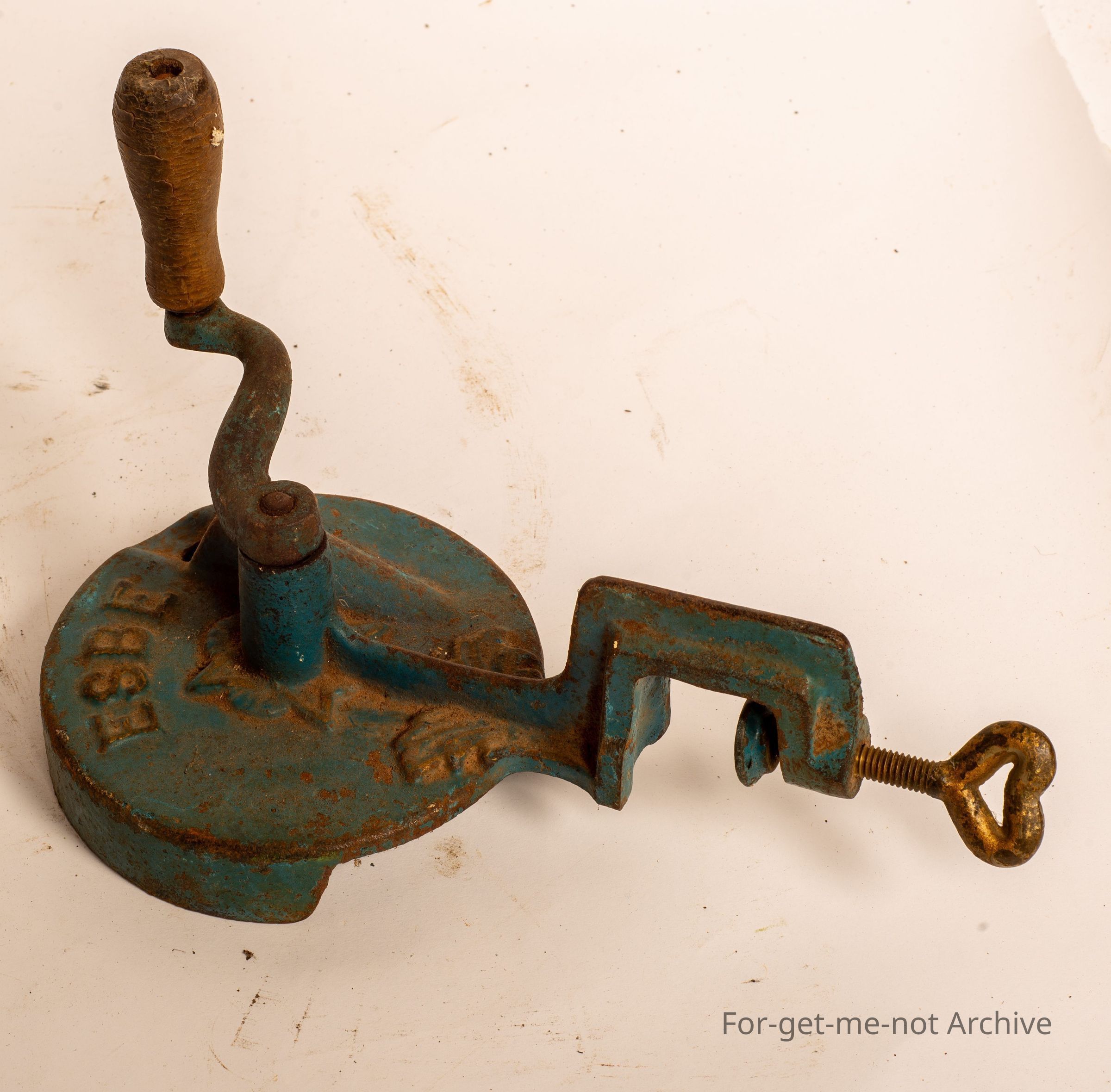 The this is an ESBE bean slicer, All complete. Handle with wooden thing, clamped to go on the table. Cleaned up. Nice thing.
