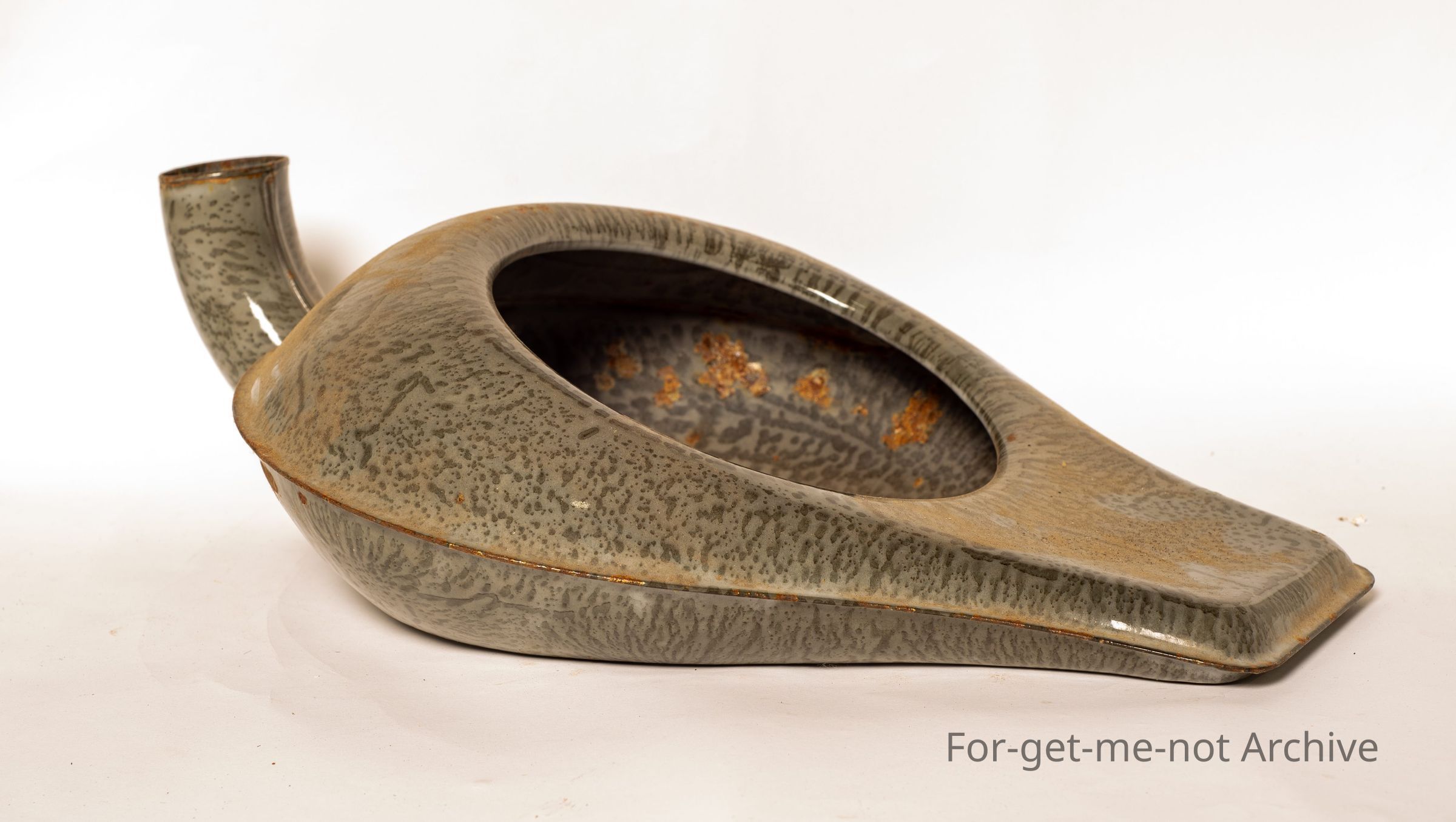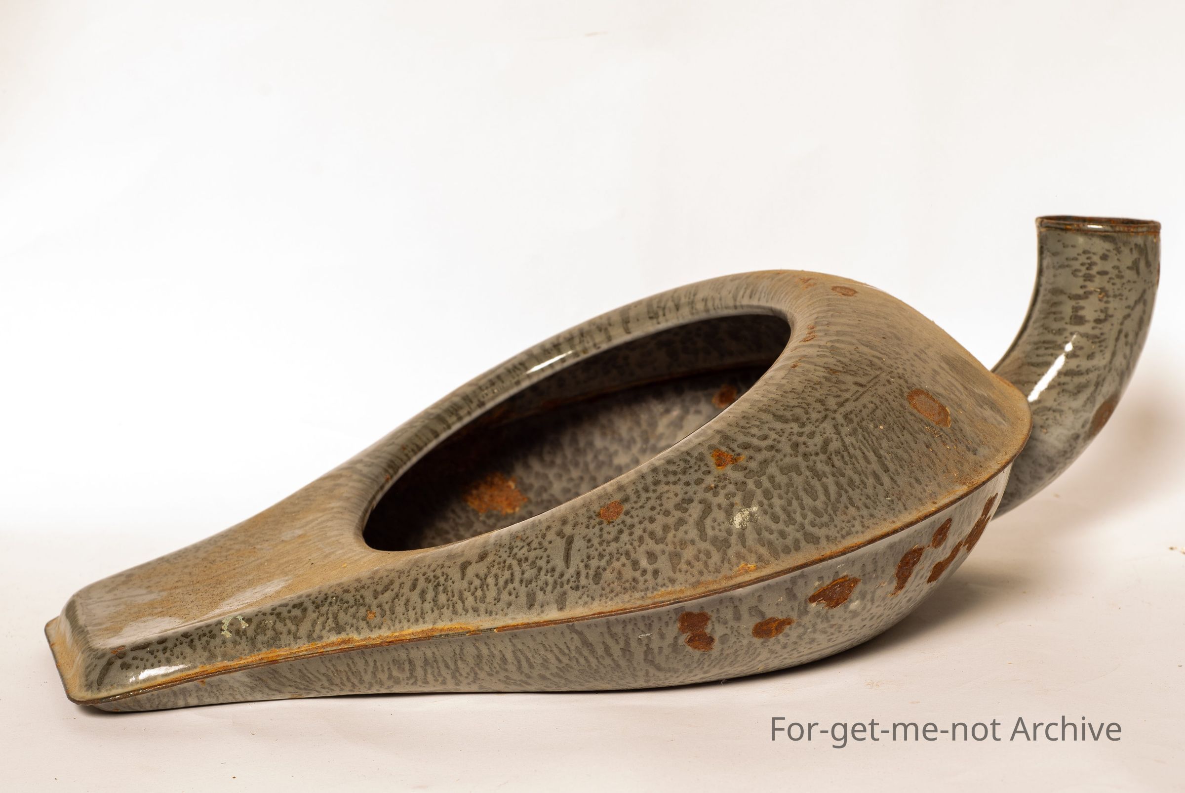 Lavatory collection. This one is an unusual enamel metal bed pan, for a male. No instructions or maker's name on it, but it is a very unusual piece.