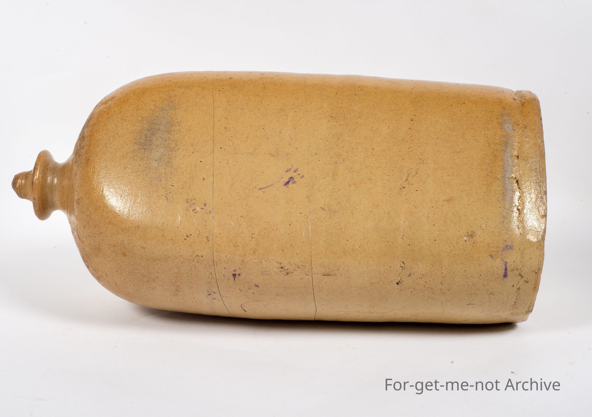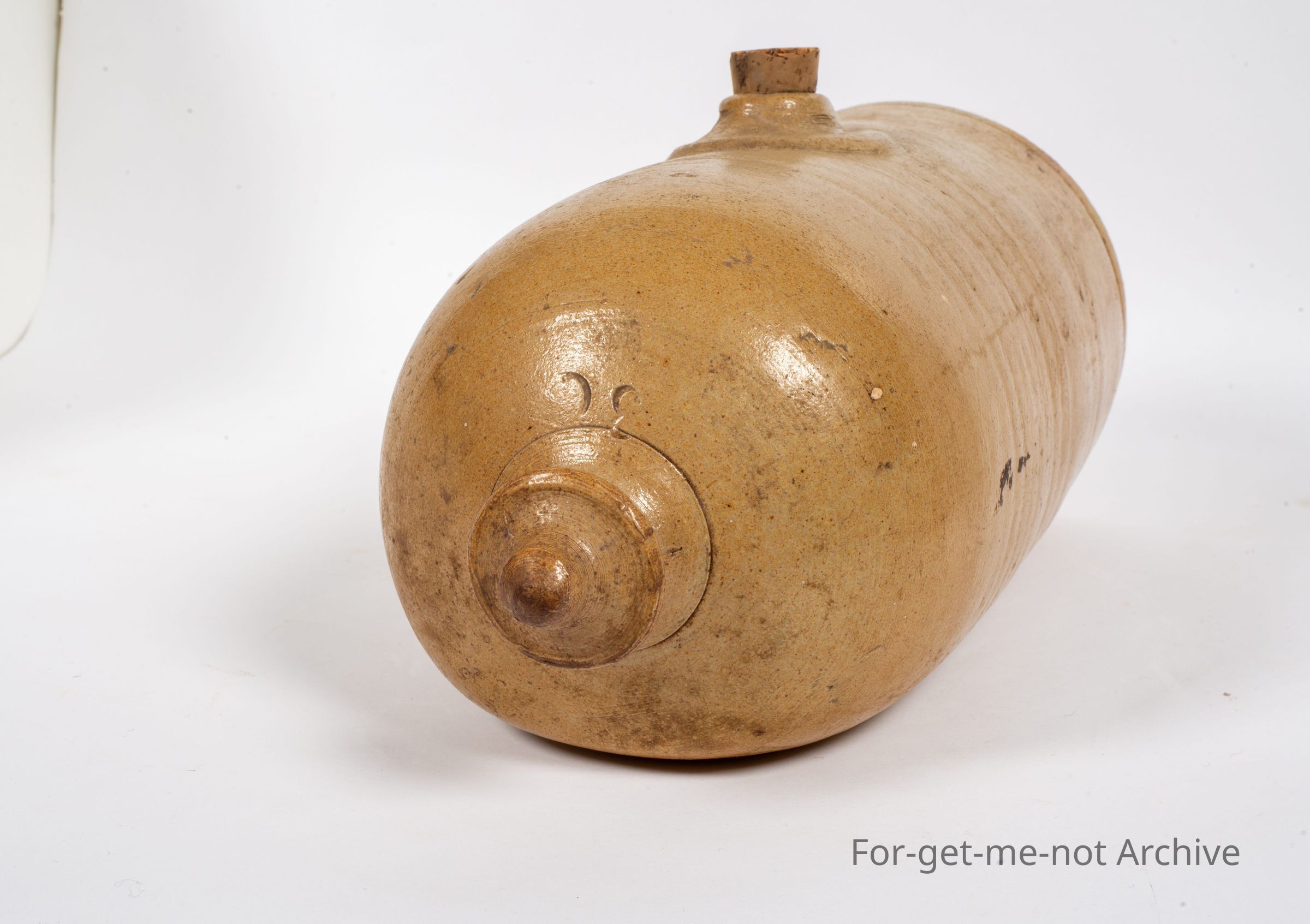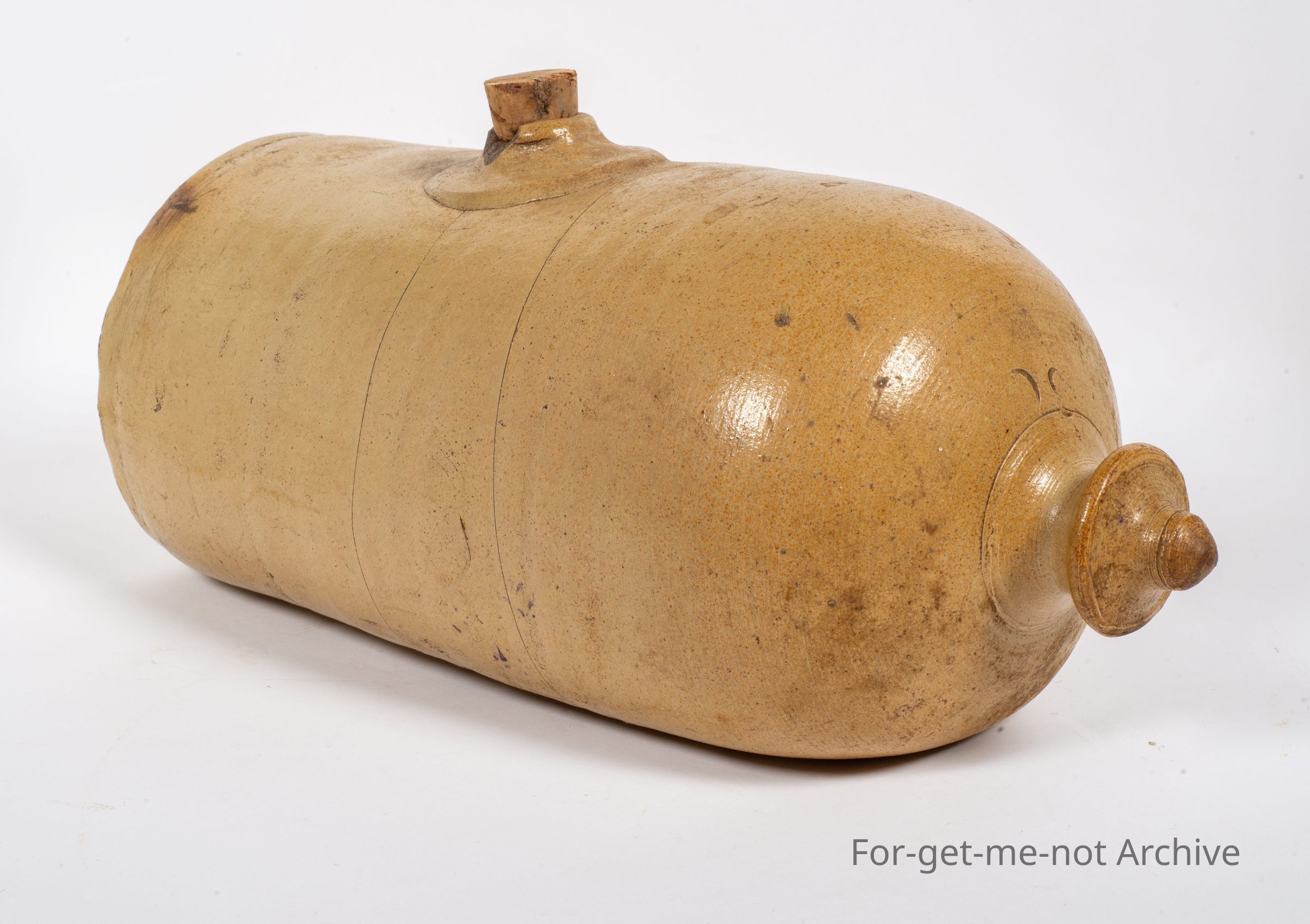 Another stoneware, early pottery piece. This time, a bed warmer, this is a very early piece, unstamped, but the glaze represents, a similar glaze to Castle Main Pottery. It has a decorative knob on the end and a raised section around the filler, a very rare piece.Collection