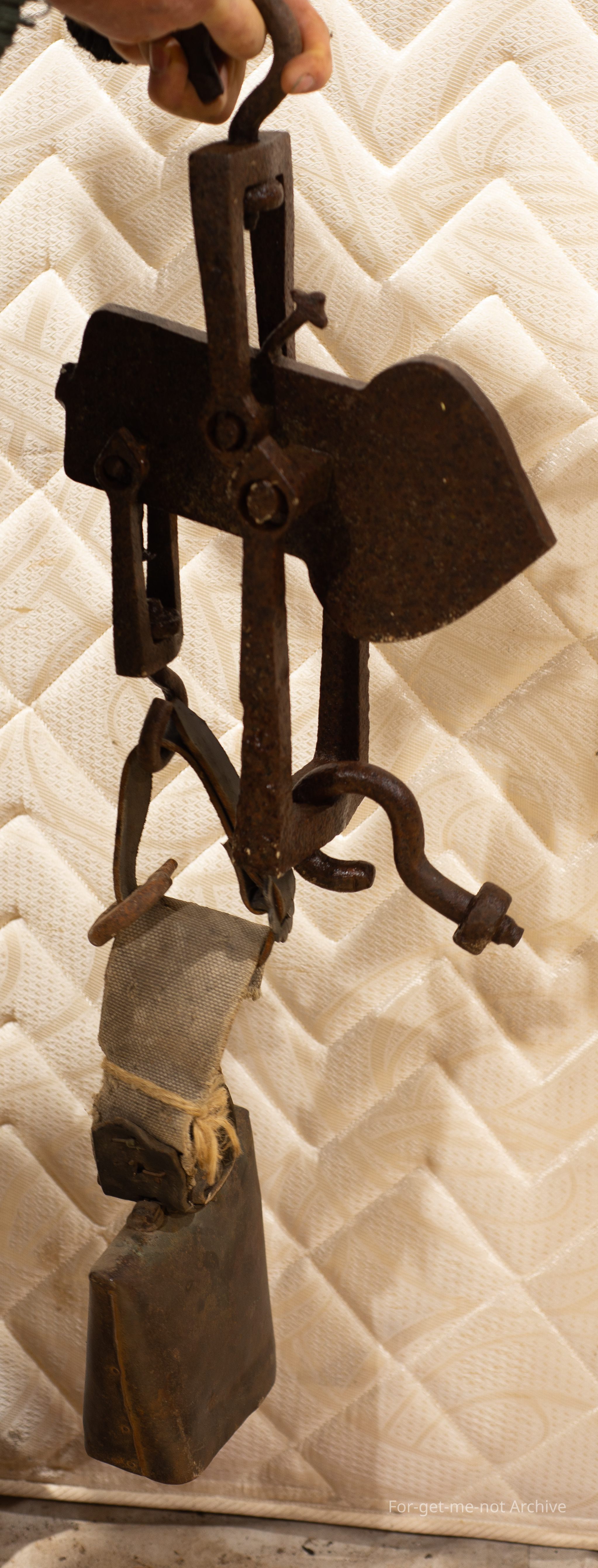 made from tip find hangers with the bell haning on the end, hung in the roof