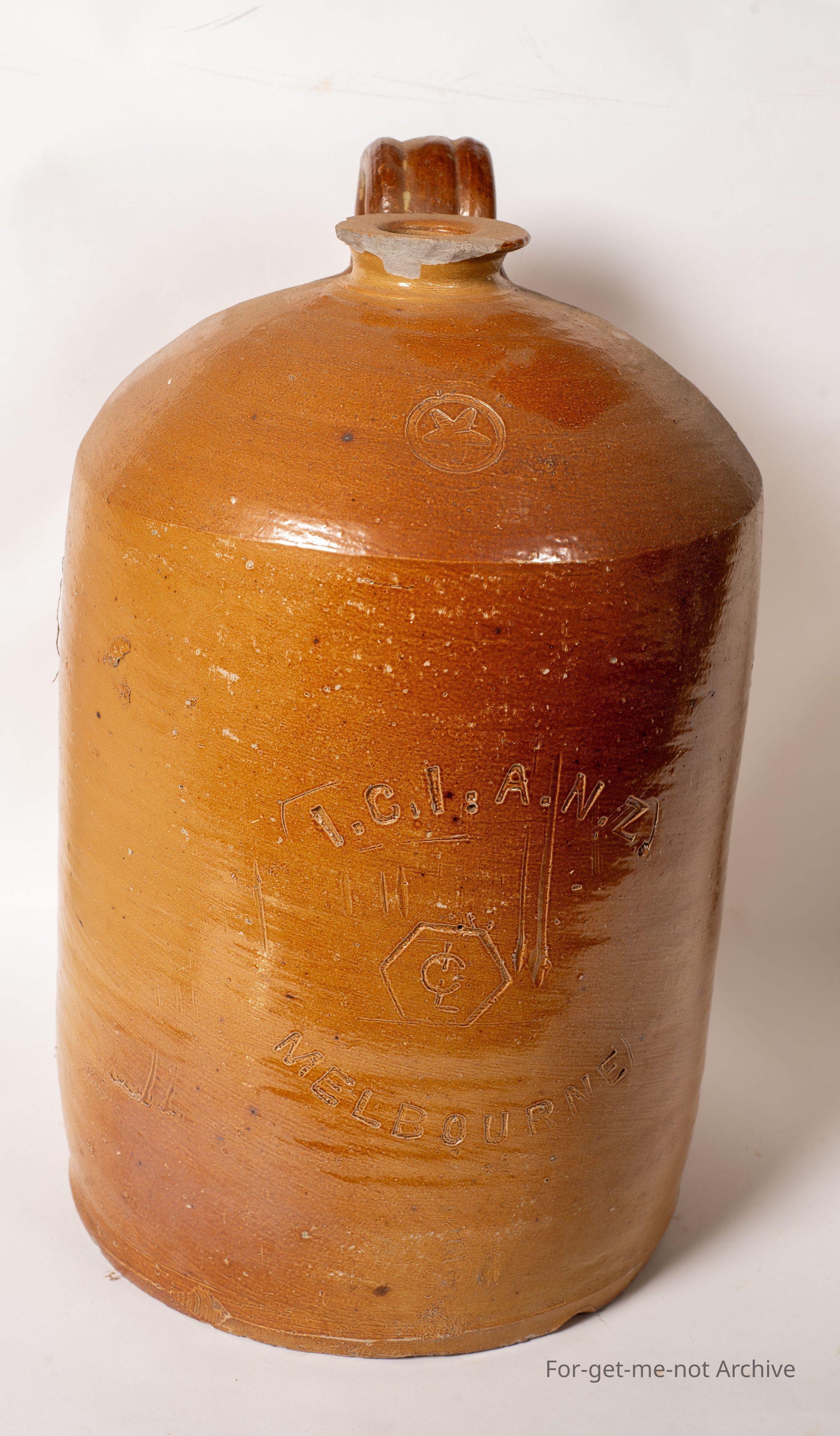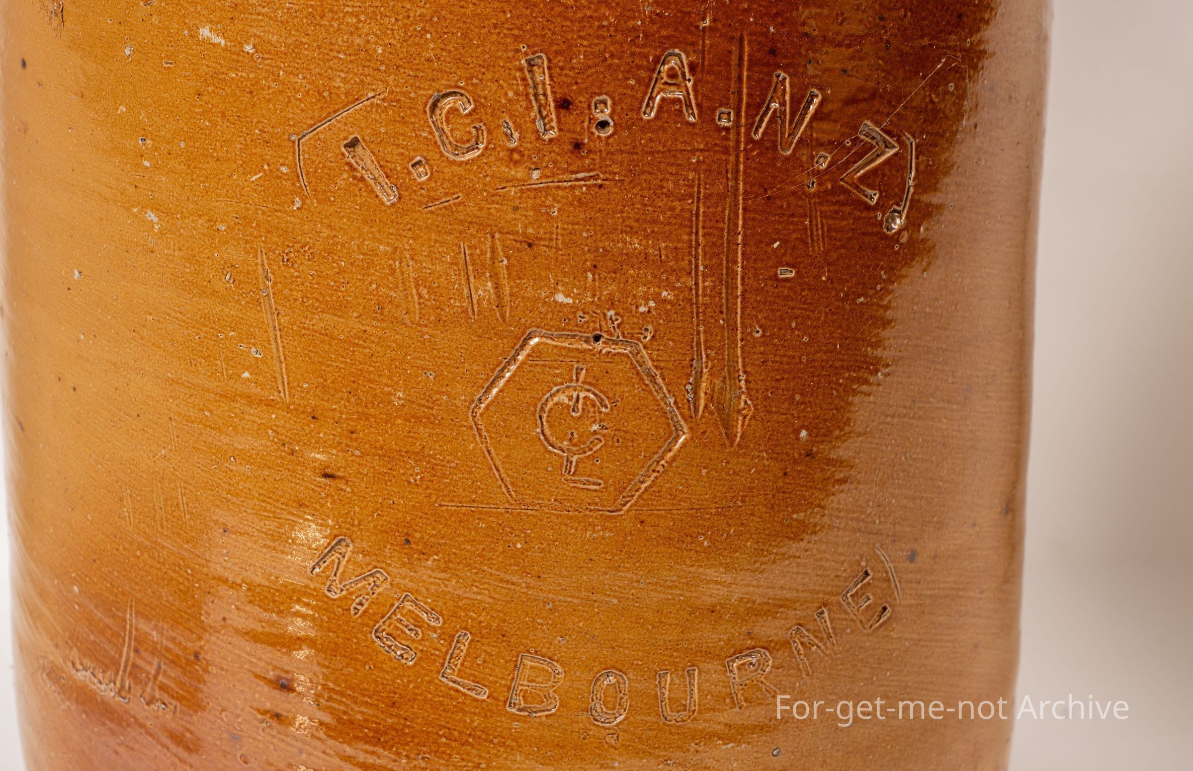 This is one of the larger Demijohn's, chips to the neck, has a an imprint on the shoulder of a star. The company name is ICIANZ, which would be, Industrial Chemical Industries Australia, New Zealand. Stamp Melbourne underneath. Salt glazed, wood fried, beautiful piece does have a stamp which is Bendigo Pottery.Collection