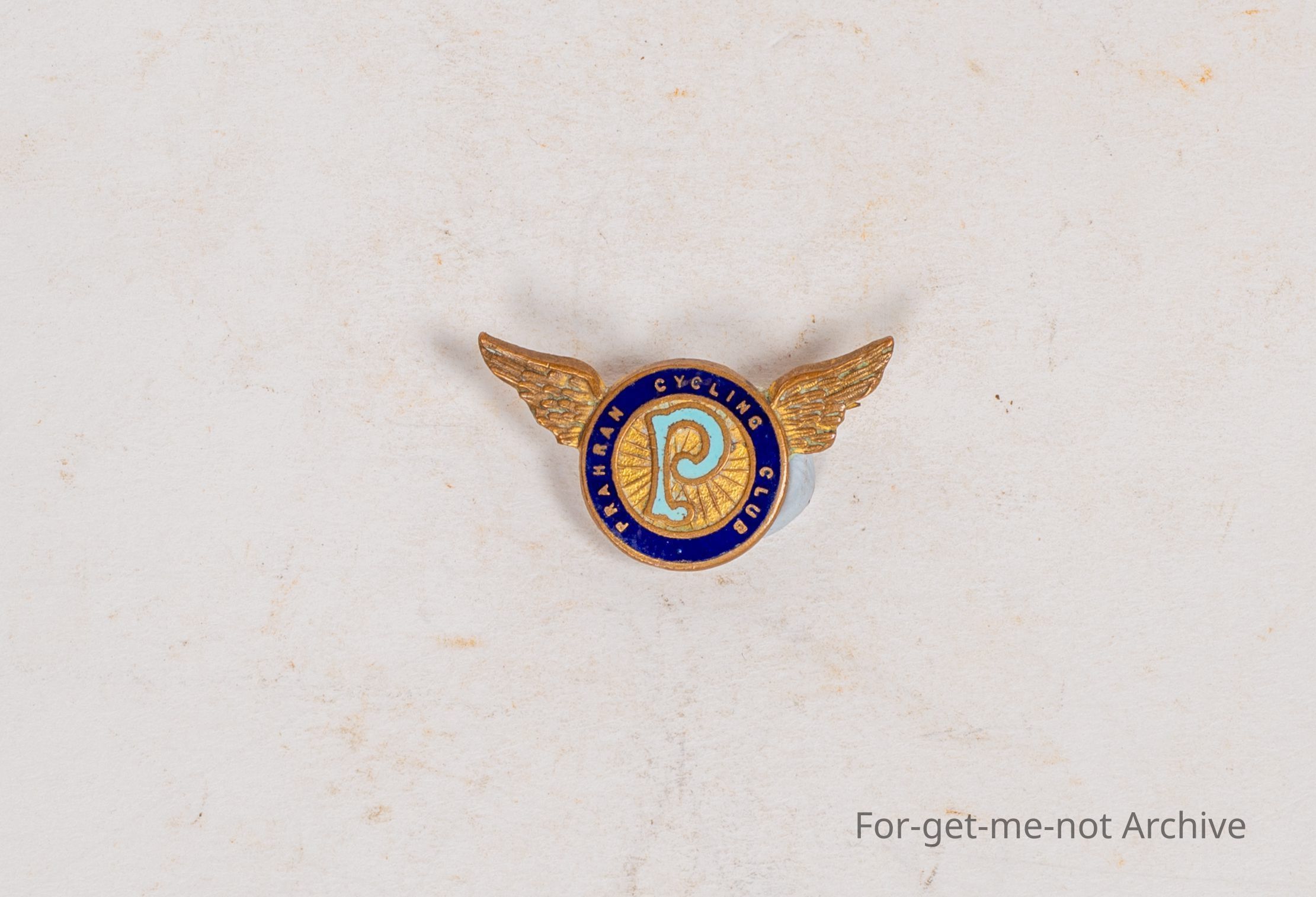 Bicycle related and animal badge, Prahran cycling club, P in the centre of a wheel with wings, early, lovely condition.