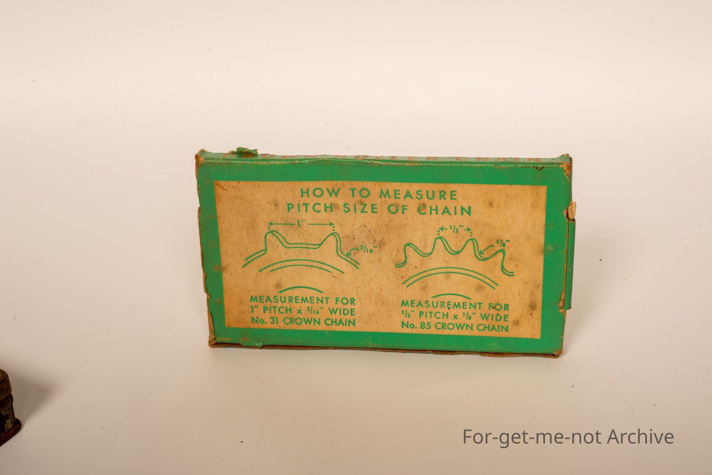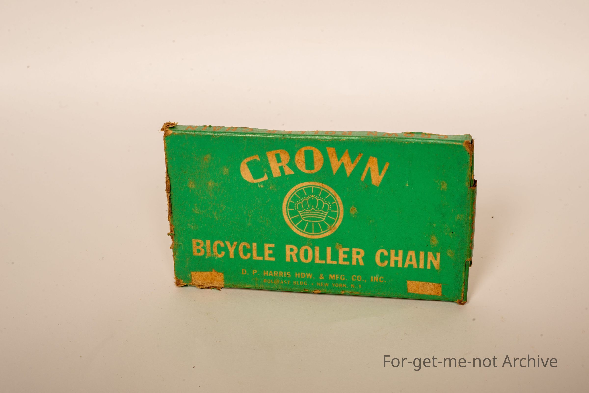 Cardboard box for bicycle chain. This box, it shows you the pitch, for the setting for a bicycle chain. So that should be The brand is the Crown. Crown brand bicycle roller chain. New York. Beautiful.Collection