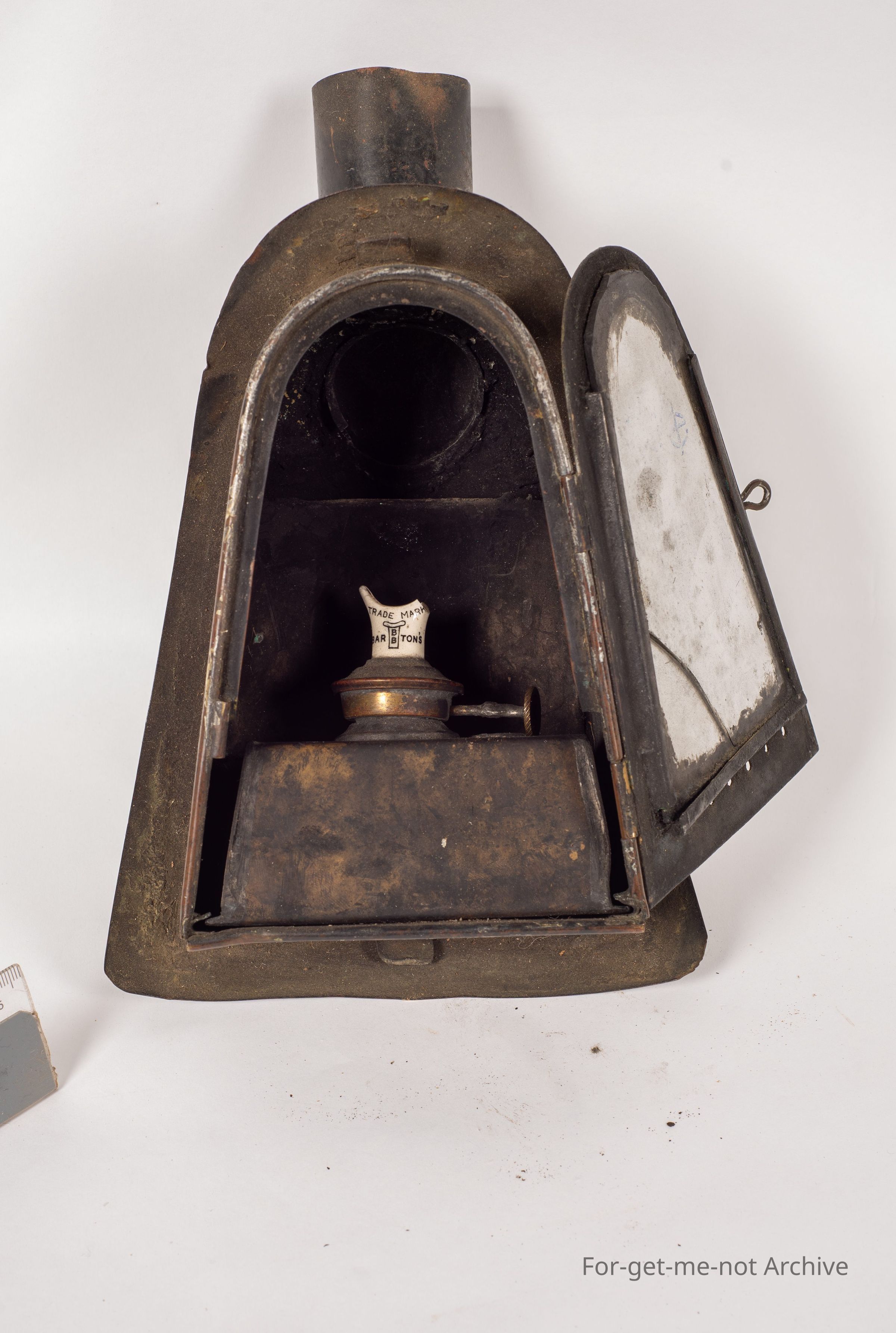 This is an unusual lamp, for a an independent chimney, but this is a binnacle lamp that fits into the binnacle which reflects light onto the, what do you call the direction thing Compass. Compass. It's got a Barton burner with a chip out of it, which is unfortunate, but other than that, it's all in good condition.Collection