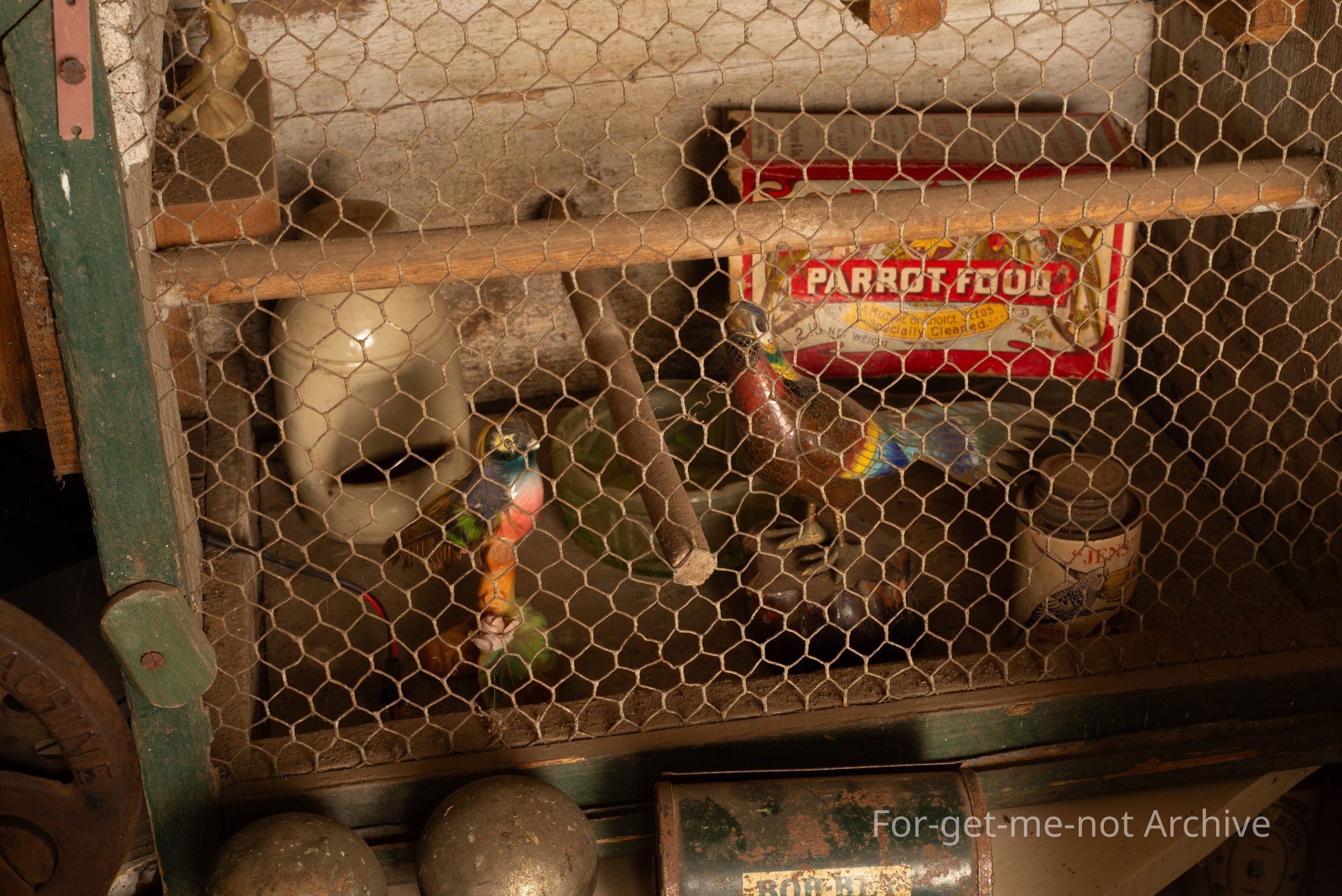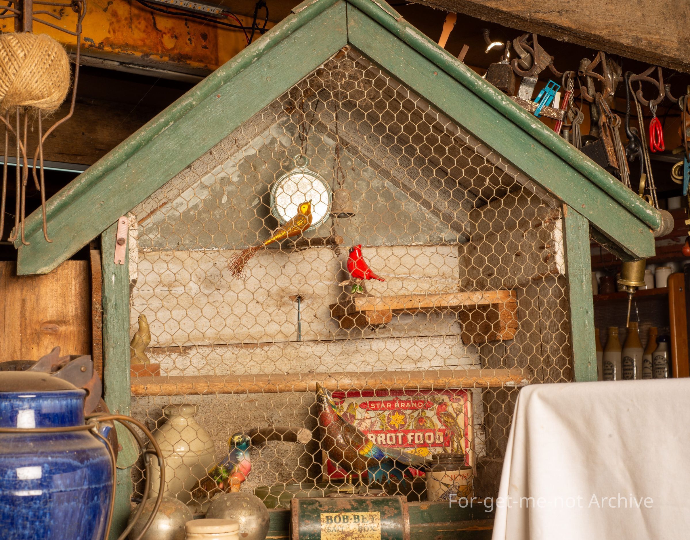 This is a beautiful domestic birdcage, made from scrap material, by the old fellow, Saul, from Ballarat. Being decorated with, various birds including a cardinal bird, little nest boxes, water feeders, various beasts.Collection