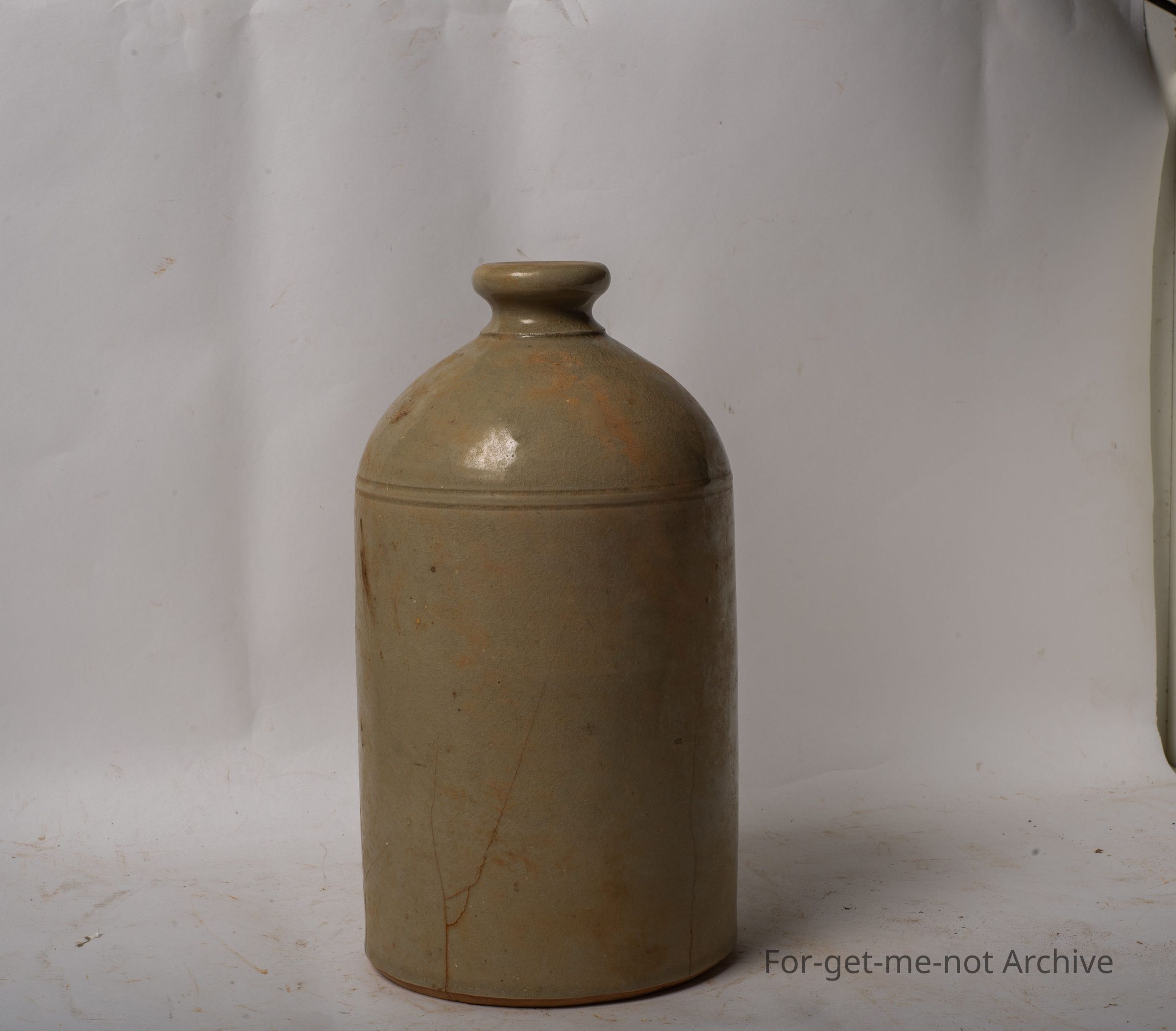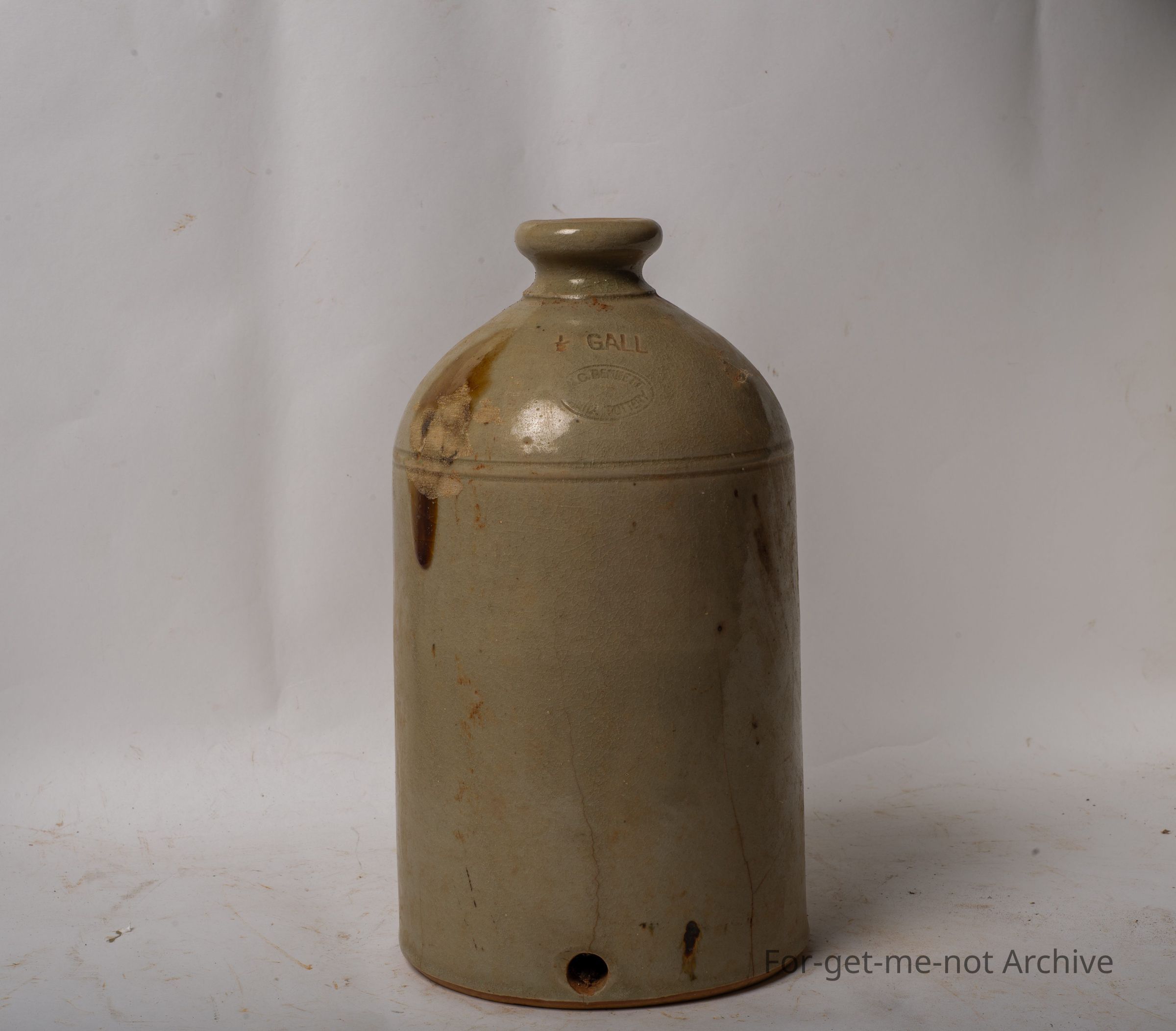 A stoneware bird feeder. This one is of a darker glaze. Some cracks, hairline cracks running from the bottom up. This is also made by Bennett South Australia. This is a quarter gallon size. This is missing its bottom saucer water catcher.Collection