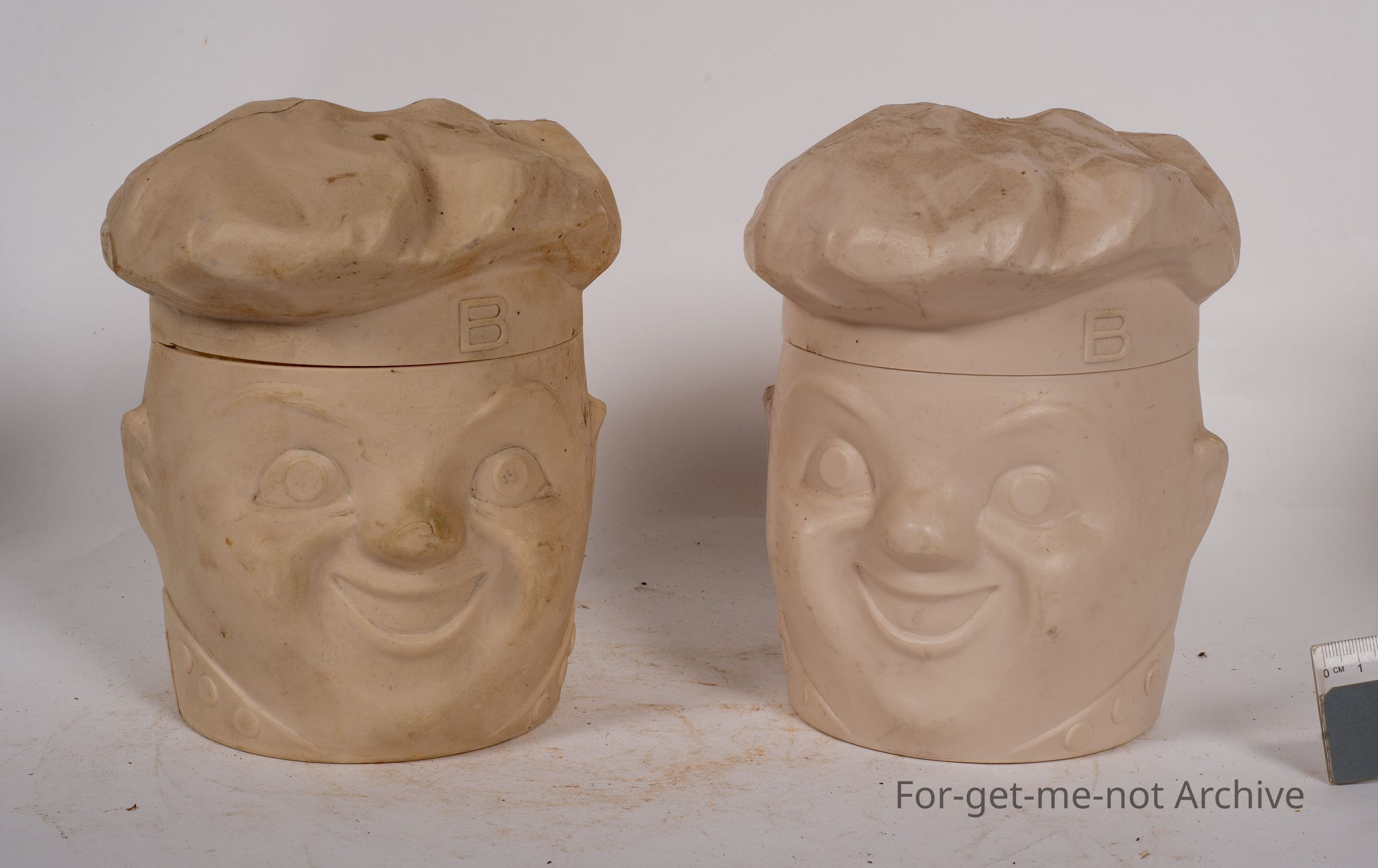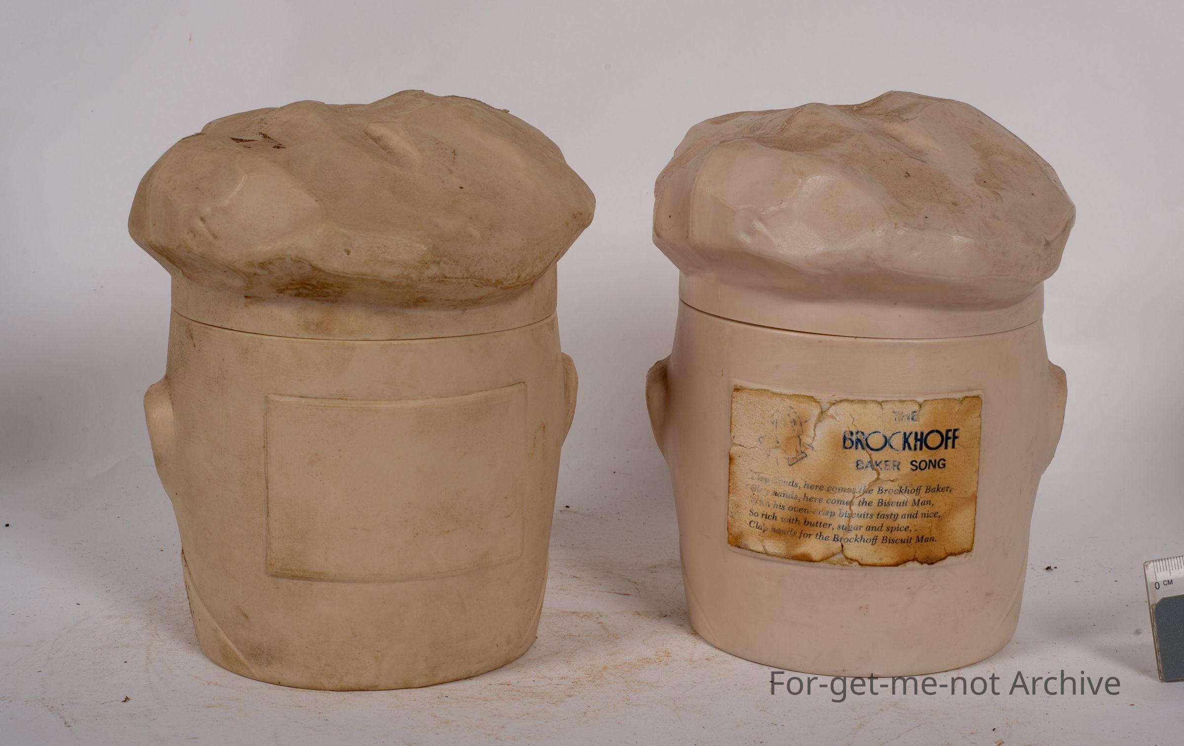 These are 2 x Biscuit Barrel from Brockhoff, in the shape of a cook with a cook's head with the hat for the lid. There are 2 of these items exactly identical, so they'll both go up together. The Brockhoff Bakers song is attached to the back of 1 of the biscuit barrels. It goes, Clap hands here comes the Brockhoff baker, clap hands here comes the biscuit man with his oven crisp biscuits tasty and nice, so rich with butter, sugar and spice. Clap hands for the Brockhoff Biscuit man.Collection