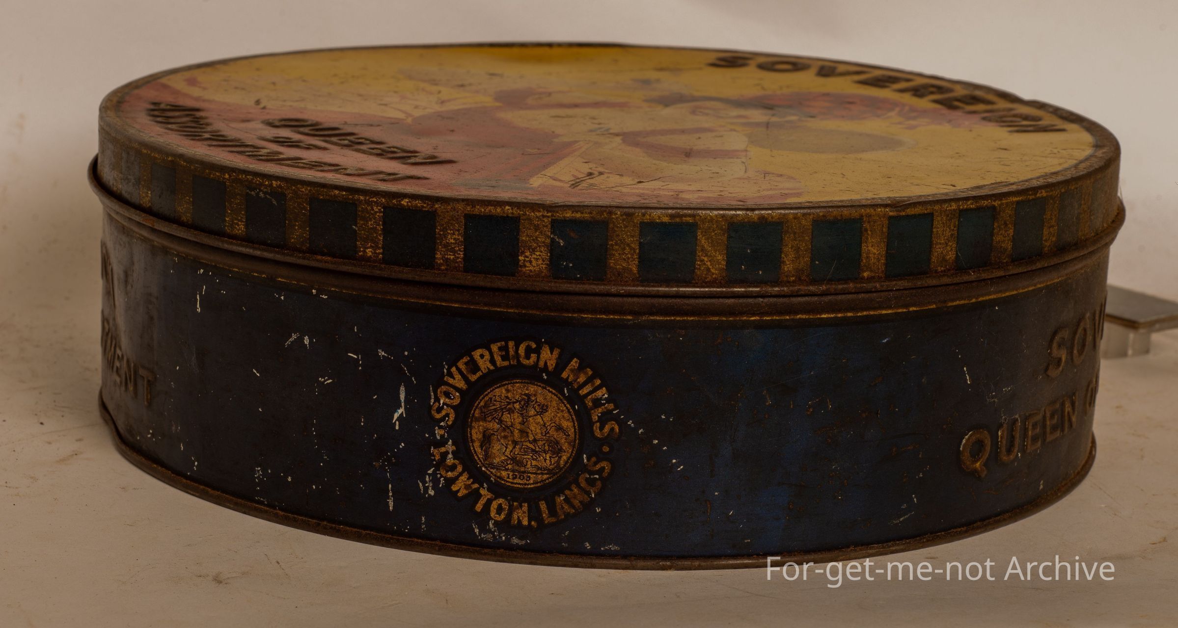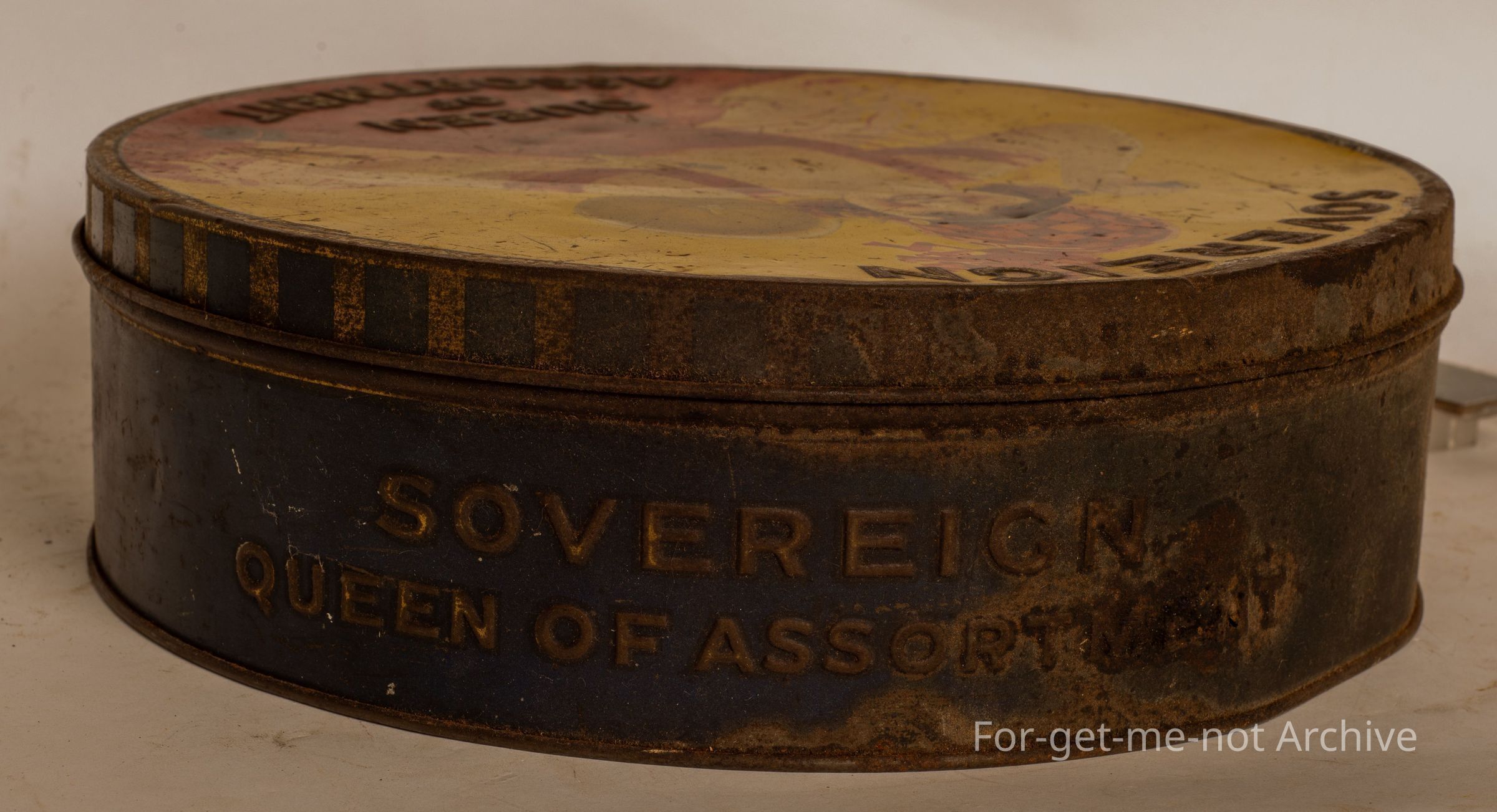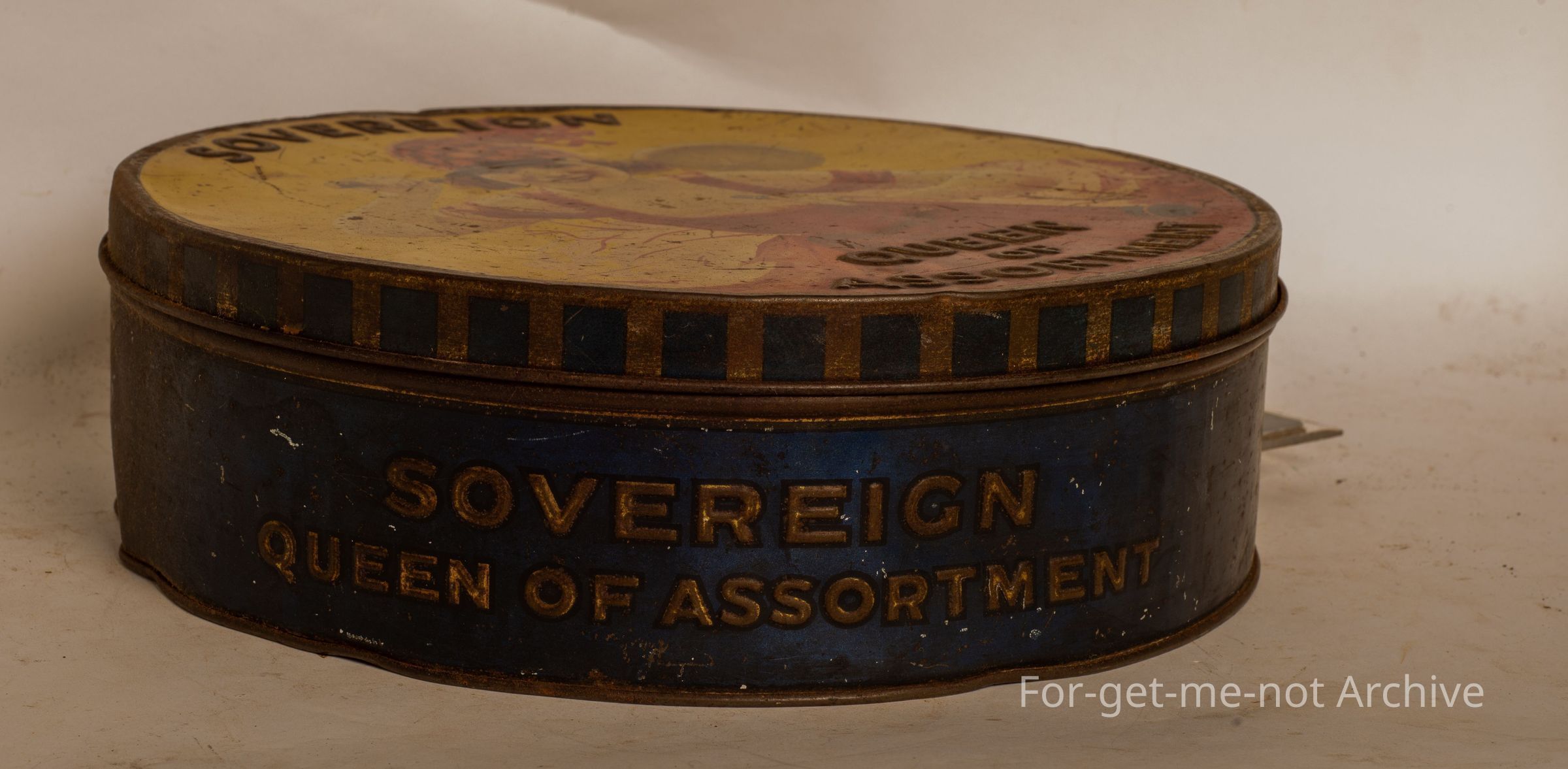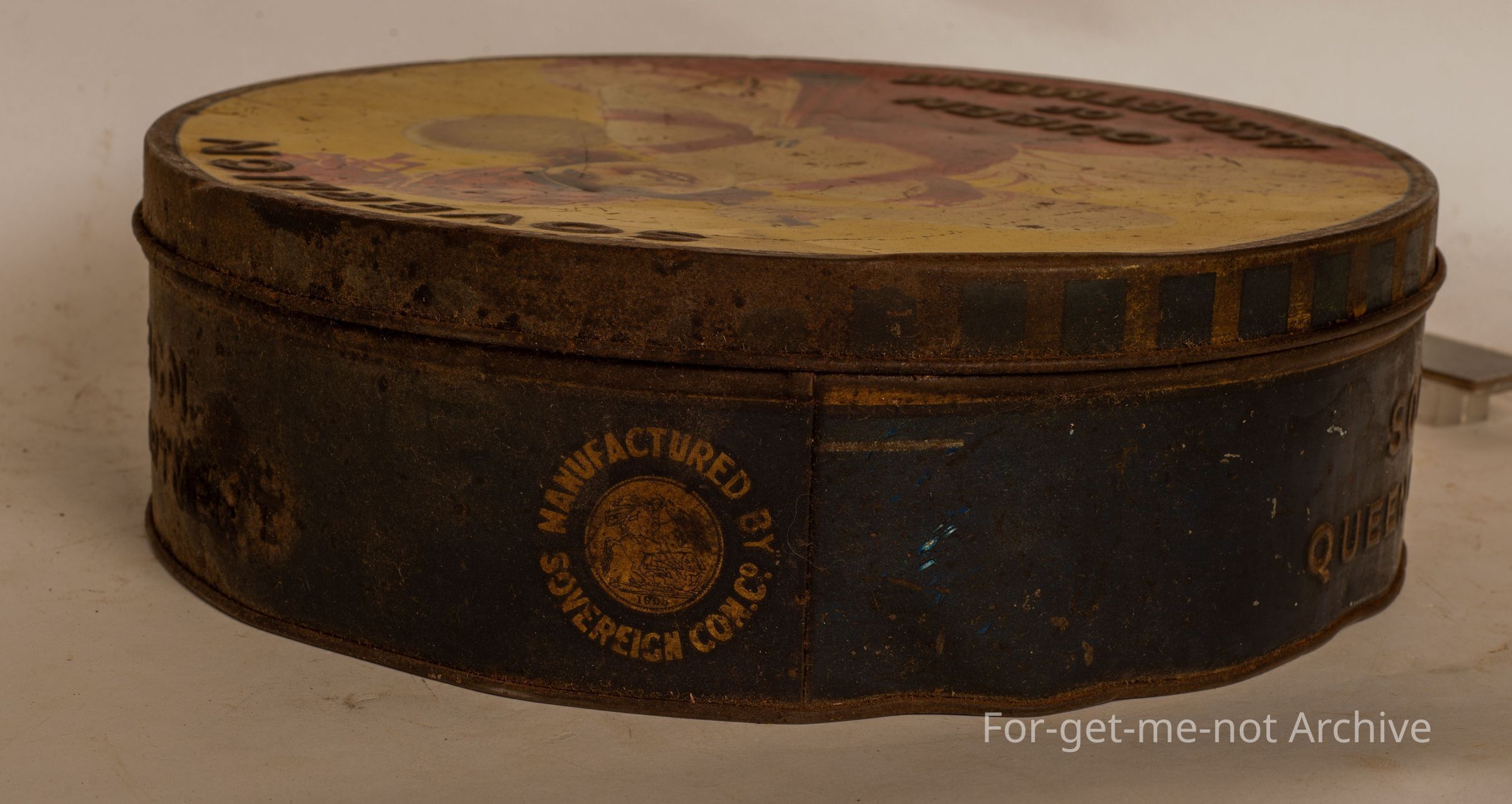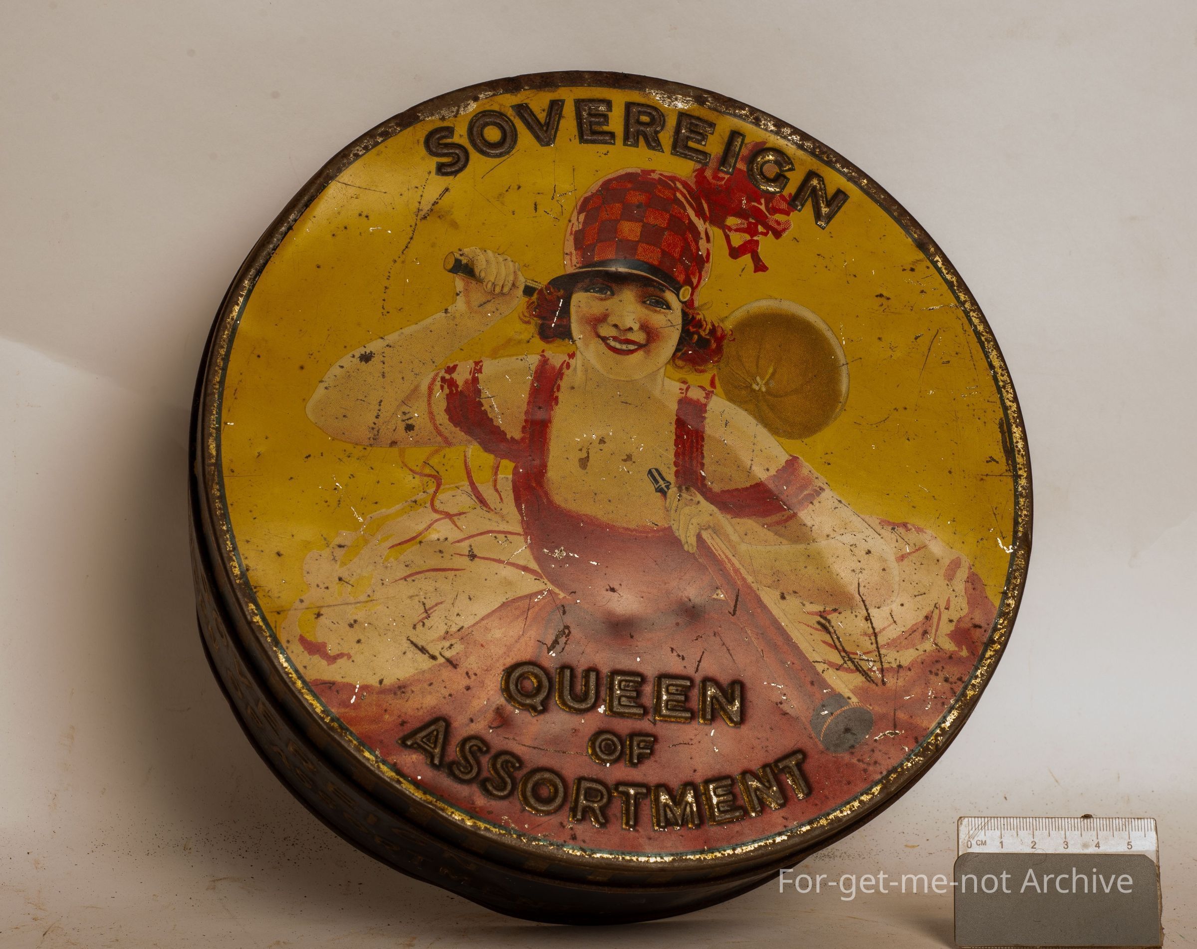 This is a large biscuit tin. Says Sovereign Queen of Assortment. The graphics, a young girl with a trumpet and a balloon, possibly an English tin. Reasonable condition.
