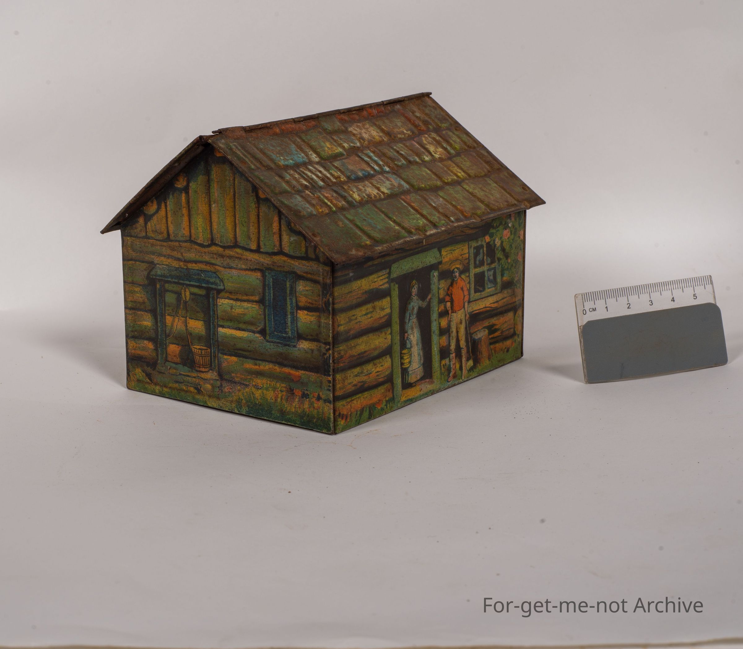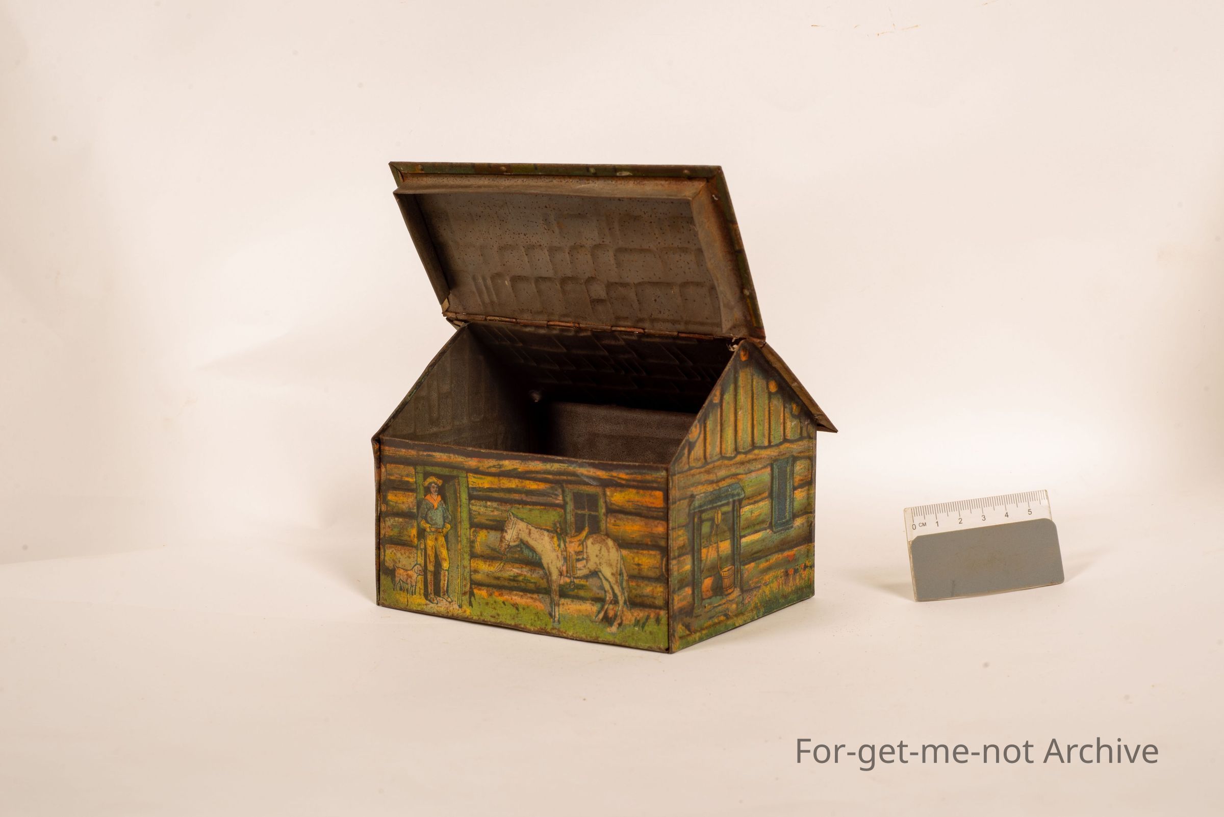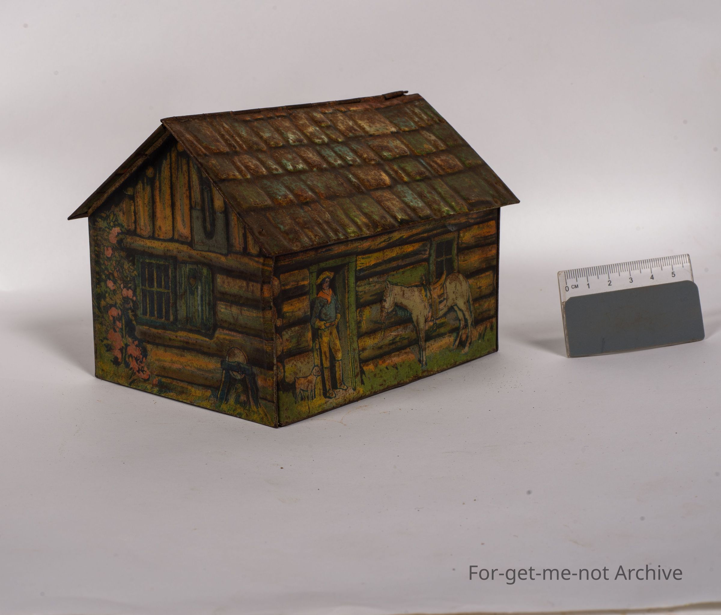 Biscuit tin. This tin is the form of a, log cabin building, image of a fellow with his horse and dog. On the base, it has George Rath's, famous log cabin honey biscuits. This is a tin of English origins, but not a common one.Collection
