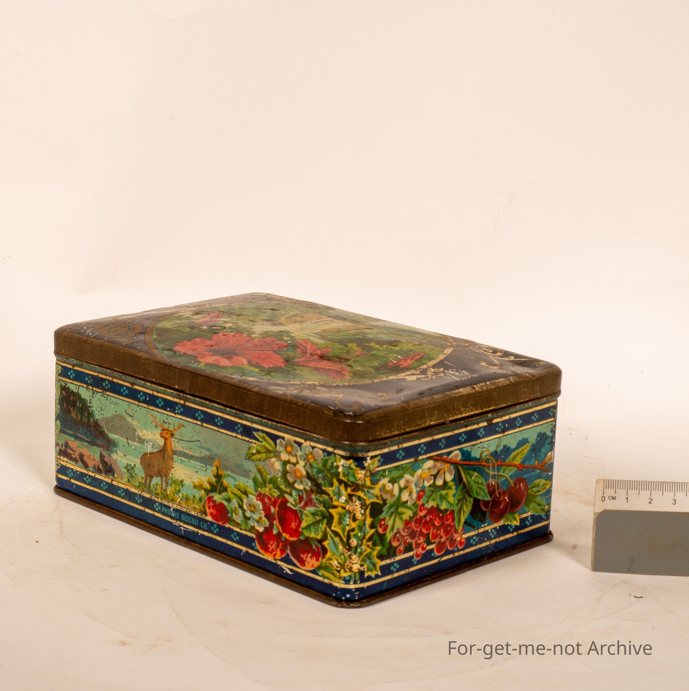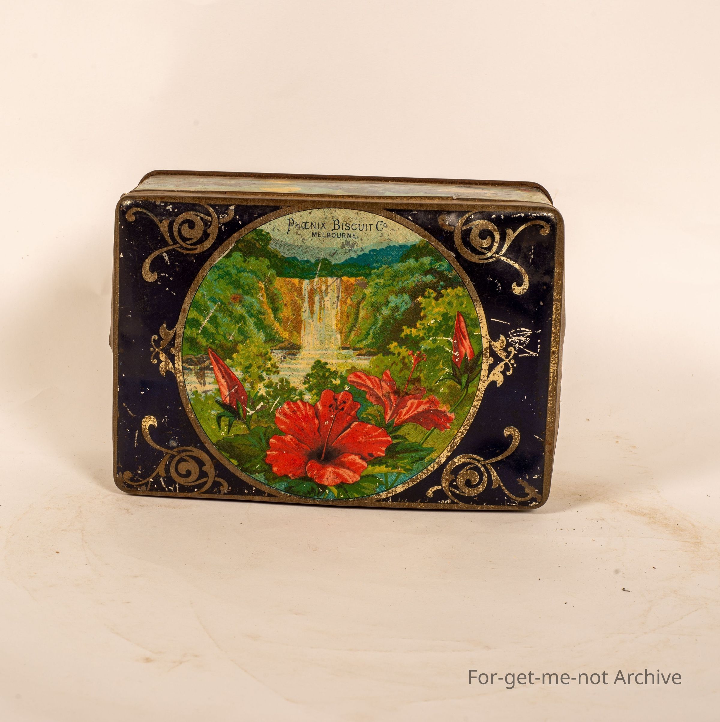 Biscuit tin from Phoenix Biscuit Company, Melbourne. Graphics of a hibiscus flower and a waterfall in the background. These Phoenix Tins are not the most common ones.